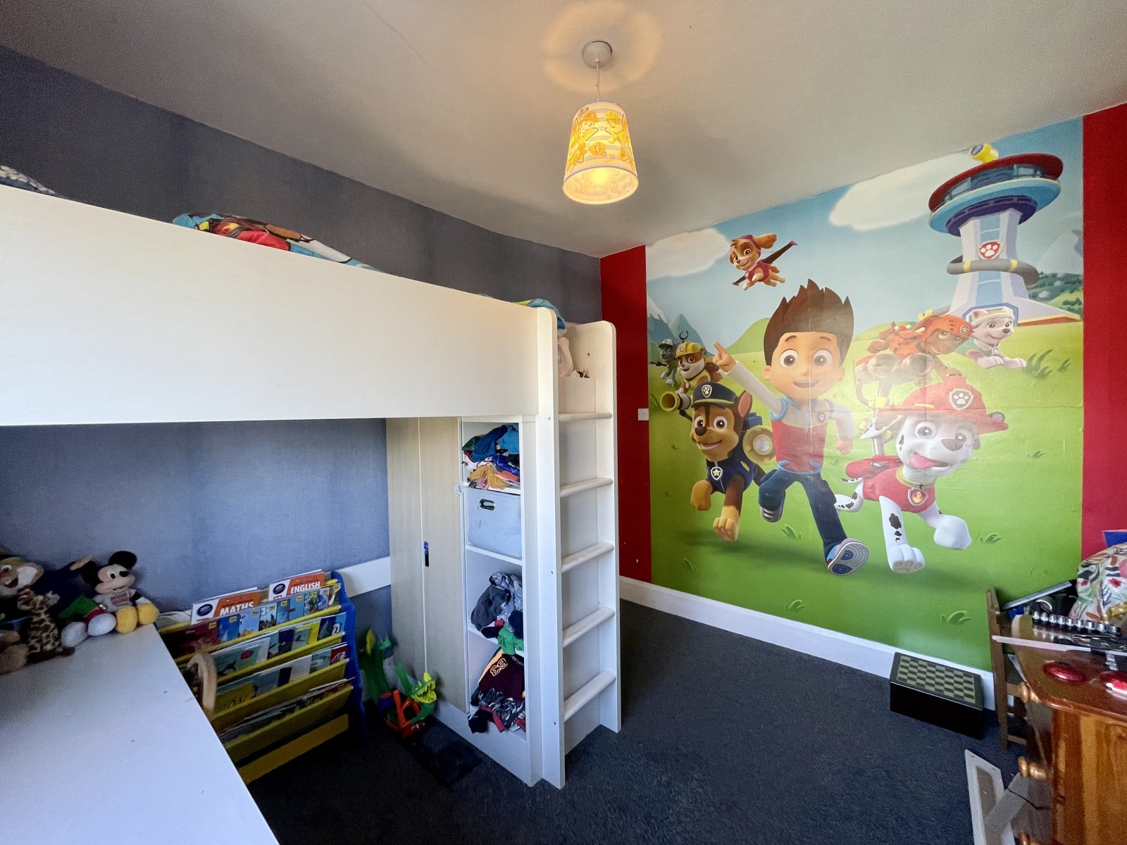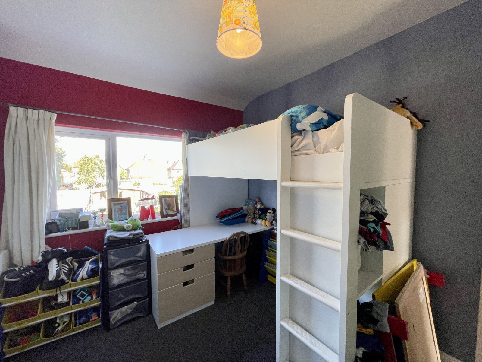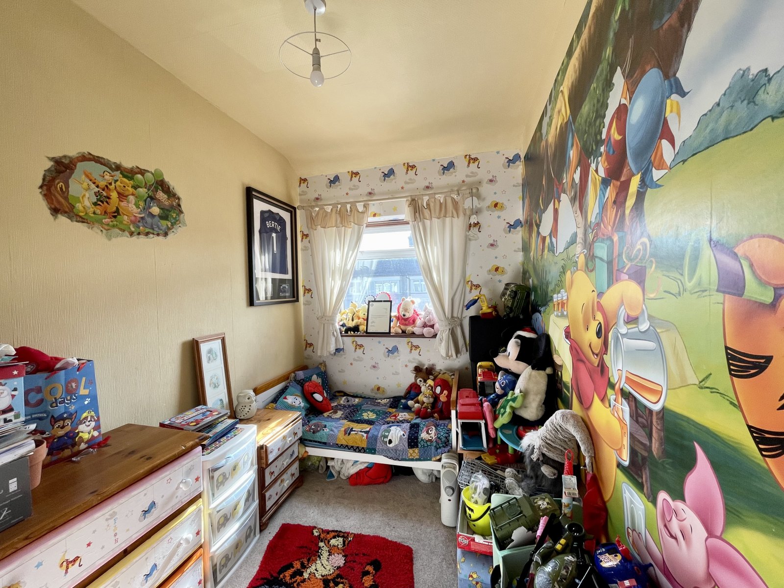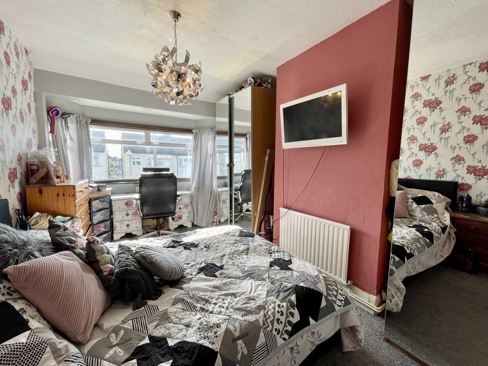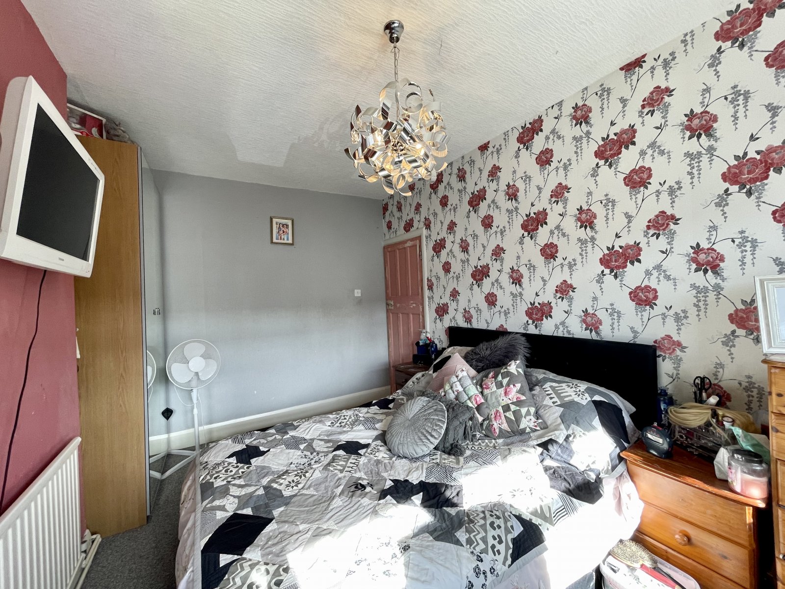 UPVC double glazed window to rear overlooking rear garden. Wall mounted radiator. Fitted wardrobe unit with storage cupboard above. High level skirting.
