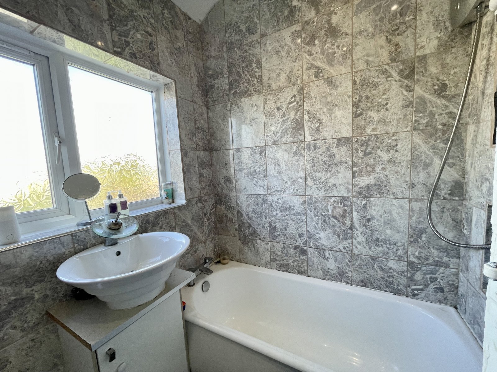 UPVC double obscured glazed window to rear. Bathroom is fitted with a modern three piece suite comprising low flush WC, counter top mounted wash hand basin with waterfall tap and panelled bath unit with mixer tap plus separate electric overhead shower with adjustable showerhead. Recessed shelving unit. Heated towel rail. Fully tiled floors. Fully tiled walls. Smooth plastered ceilings with recessed LED lighting.