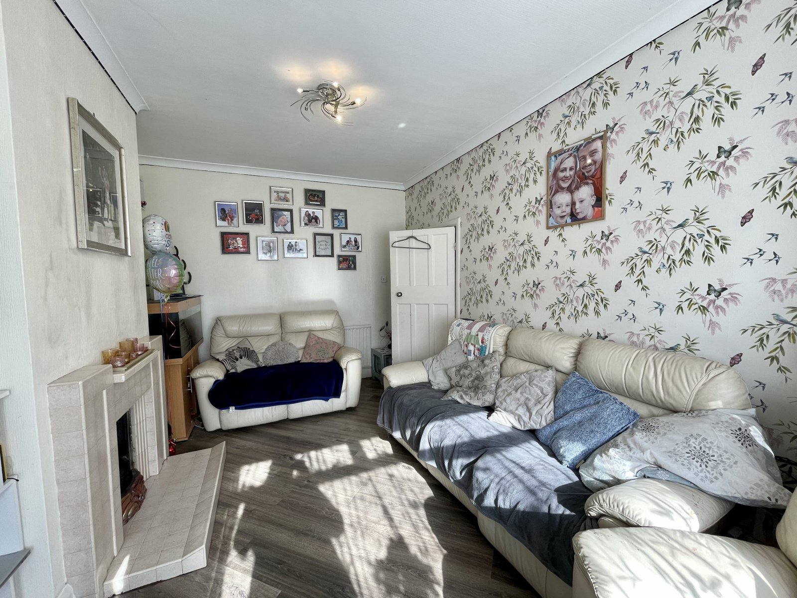 into bay. Large double glazed bay window unit to front. Two wall mounted radiators. Feature fireplace with tiled mantle and hearth, open grate. Wood effect laminate flooring. High level skirting. Coved cornice to ceiling.
