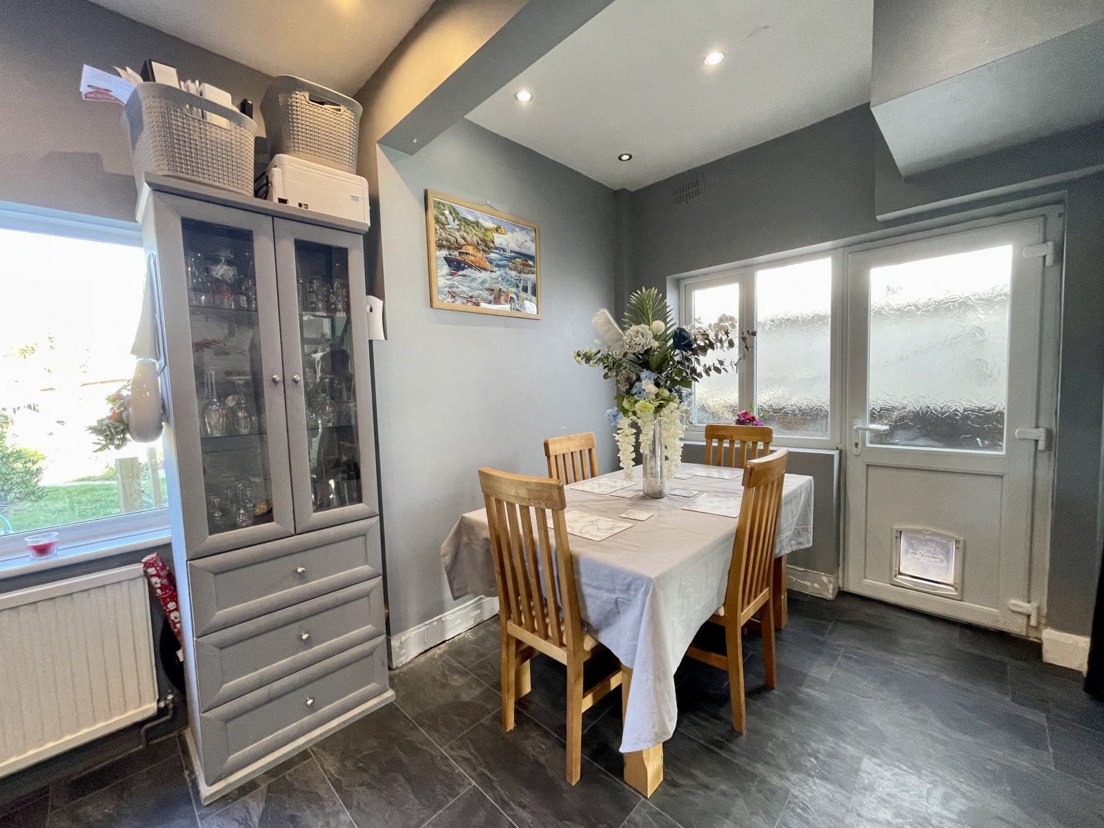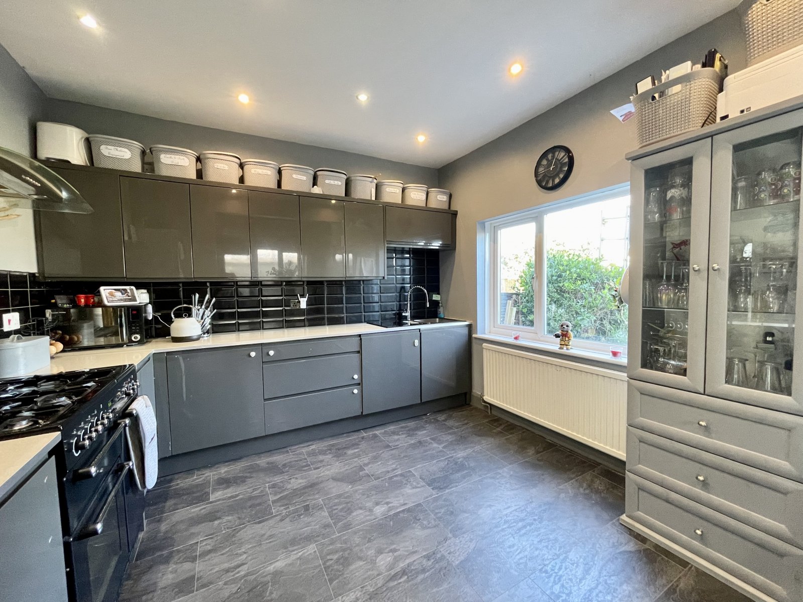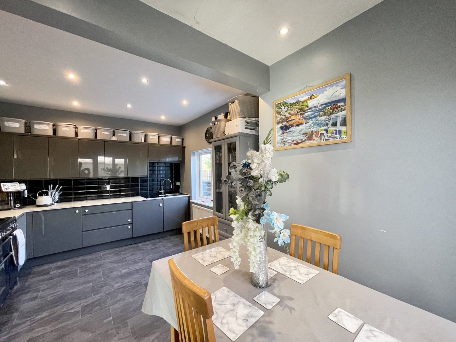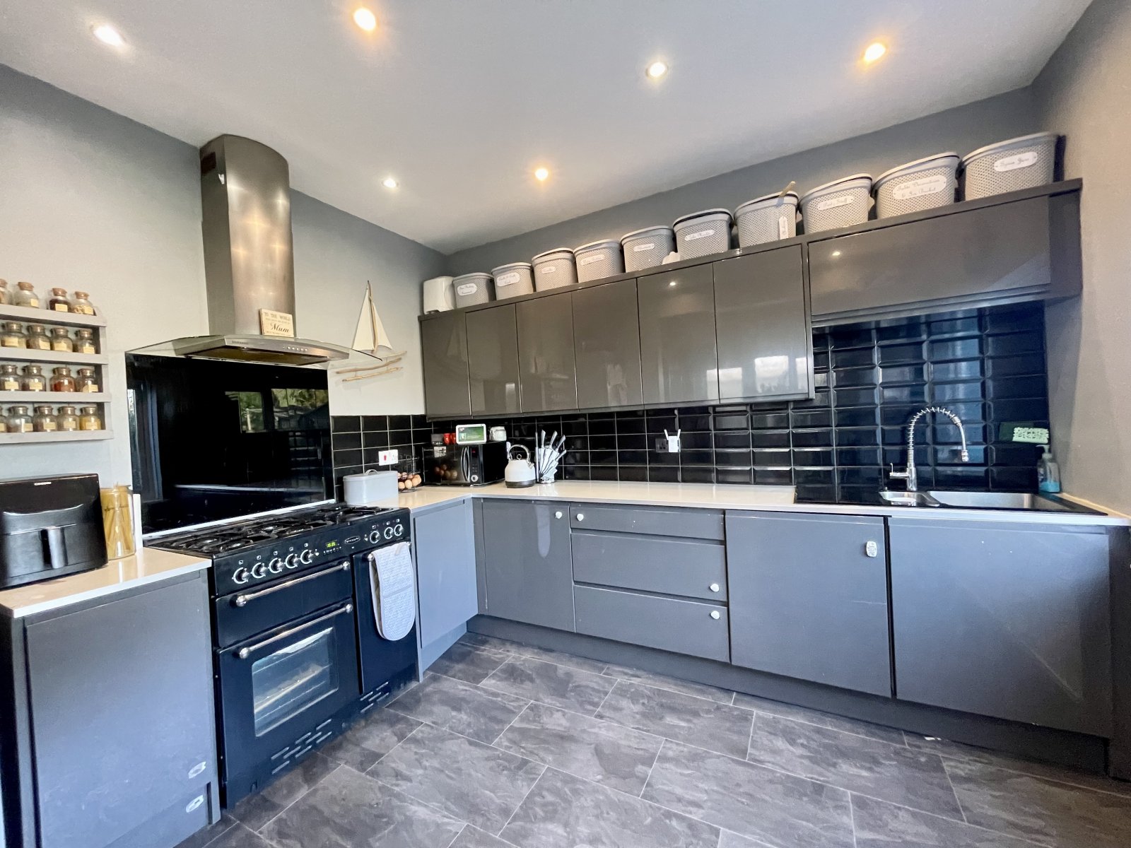 UPVC double obscured glazed door to side with double obscured glazed window adjacent. Further UPVC double glazed window to rear overlooking rear garden. Wall mounted radiator. Kitchen is fitted with a modern and contemporary range of grey high gloss base and eye level units incorporating a slim line squared edge working surface, inset one and a half bowl stainless steel stink with glass topper, mixer tap and drainer unit. Space for Range cooker with fitted extractor hood above, existing to remain. Integrated under cabinet washing machine. Space for free standing fridge/freezer. Fully tiled splash backs. Tiled effect laminate flooring throughout. Under stairs storage cupboard. Smooth plastered ceilings with recessed LED lighting.