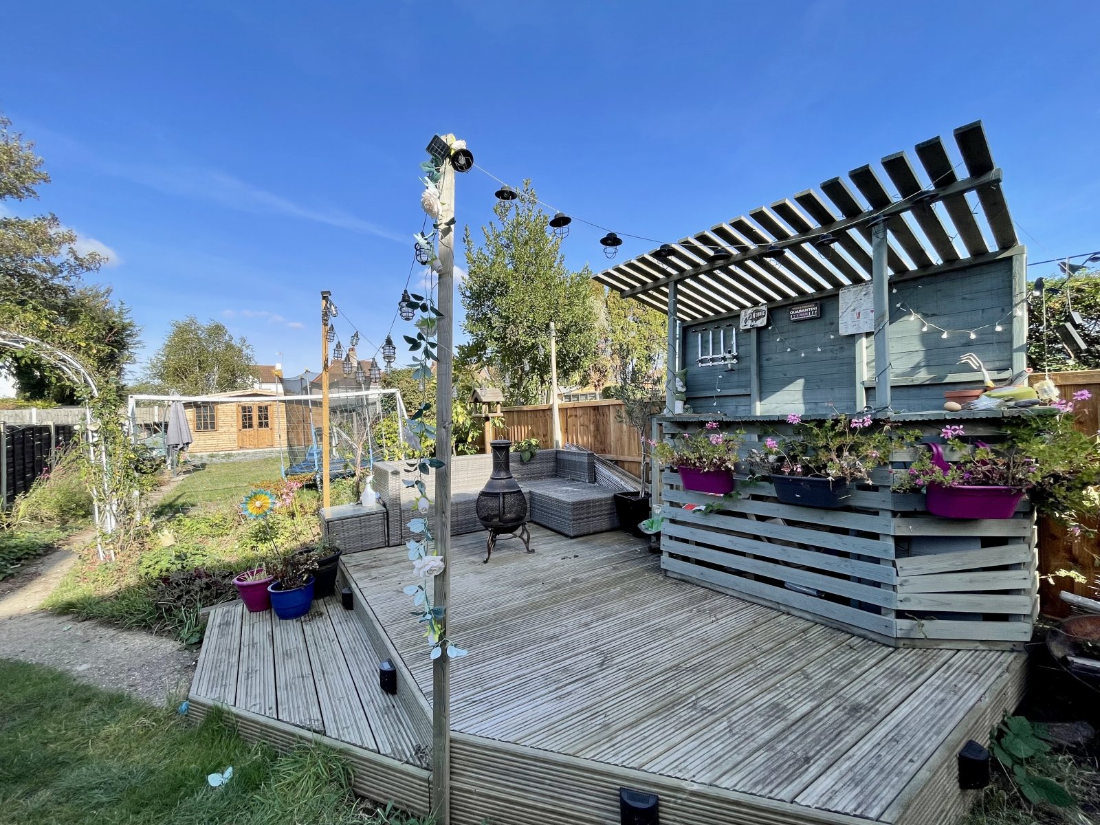 The property benefits from a large garden to rear which is mostly laid to lawn with mature planted borders, raised decking area, access path leading to rear of the garden.
