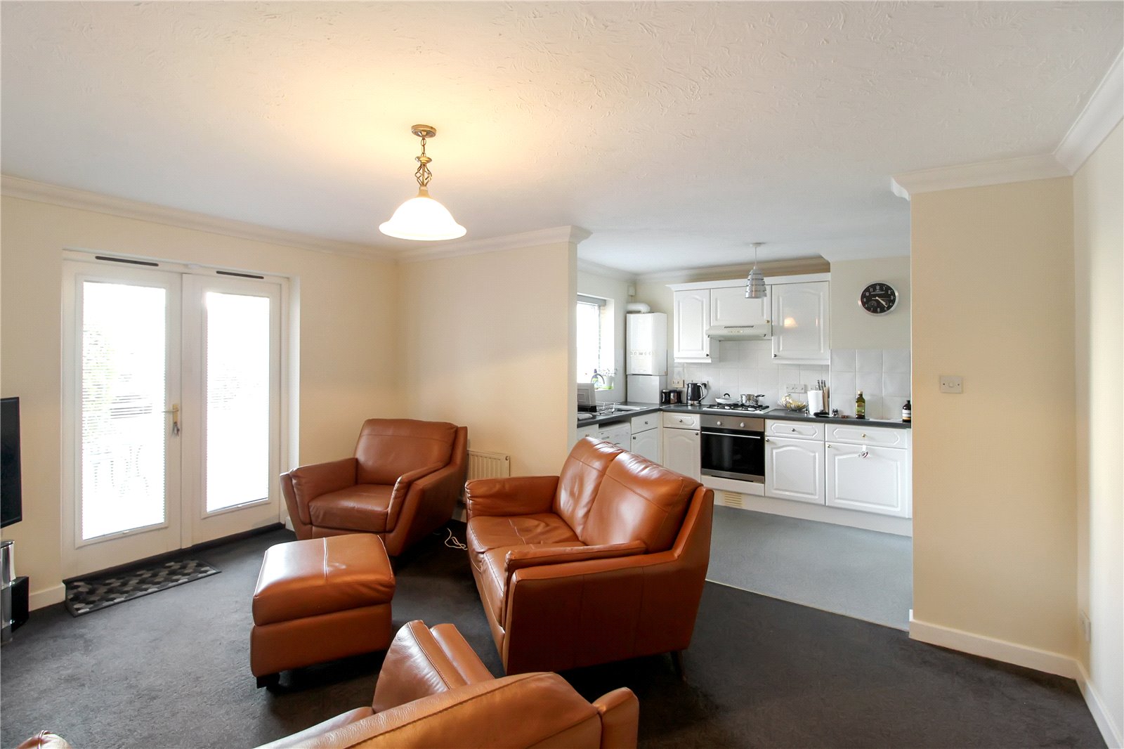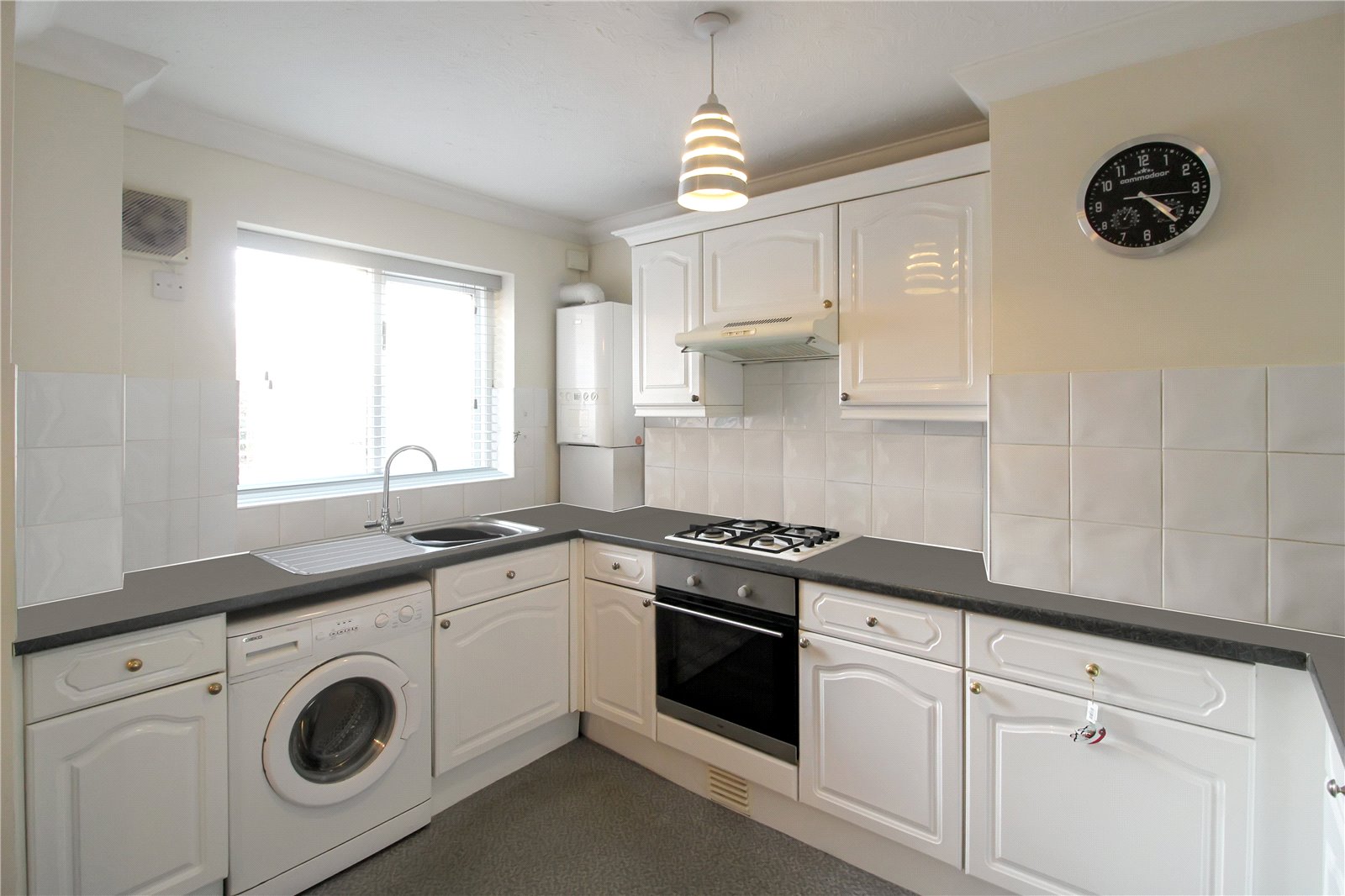 Double glazed French doors to rear with integrated venetian blinds to remain overlooking the communal gardens and private, gated parking. Carpet to floor. Two radiators. Smooth plastered walls and coving to ceiling with ceiling light. Opening into Kitchen. Double glazed window to rear with integrated venetian blinds to remain. The kitchen is fitted with a rolled-edge worksurface comprising inset stainless steel sink and drainer unit with chrome monobloc mixer tap and four ring gas hob with extractor hood above and oven under, a range of base and eye-level cabinets and tiled splashback to two-thirds height. Vinyl effect flooring. Beko washing machine to remain. Space for upright fridge/freezer. Wall-mounted Ideal combination boiler. Remainder of walls are smooth plastered with coving to ceiling with ceiling light.