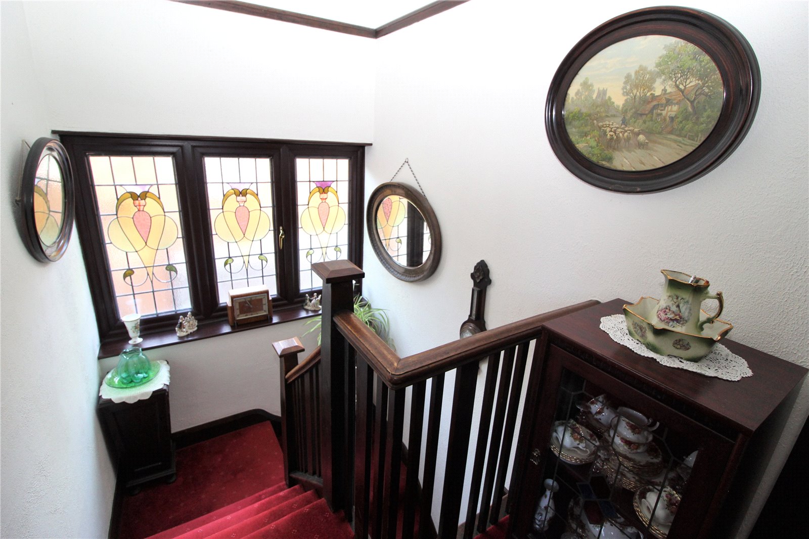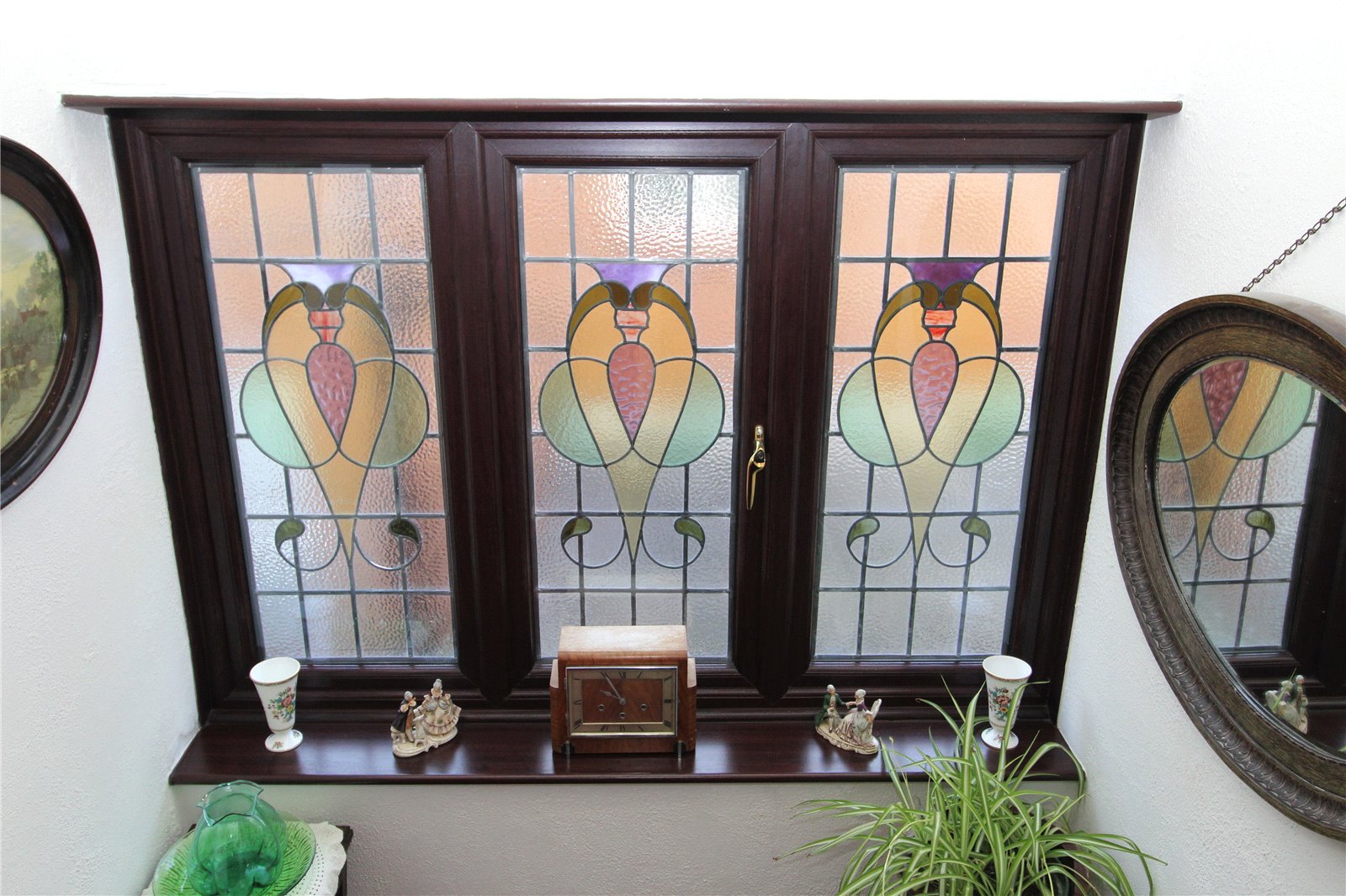 Turning staircase gives access to the first floor landing, access to loft, picture rail, upvc double glazed window to side aspect with original stained glass leadlight inserts fitted within the sealed units, doors to rooms.