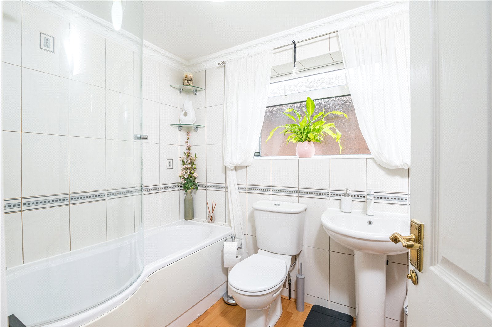 Opaque uPVC double glazed window to the side aspect. Fitted with a white three-piece suite comprising of pedestal wash hand basin with stainless steel mixer tap, low level w.c and p-shaped panel enclosed bath with shower screen and wall mounted shower unit. Coved cornicing with smooth plastered ceiling and ornate ceiling rose. Tiling to walls. Laminate wood effect flooring. Heated towel rail/radiator.
