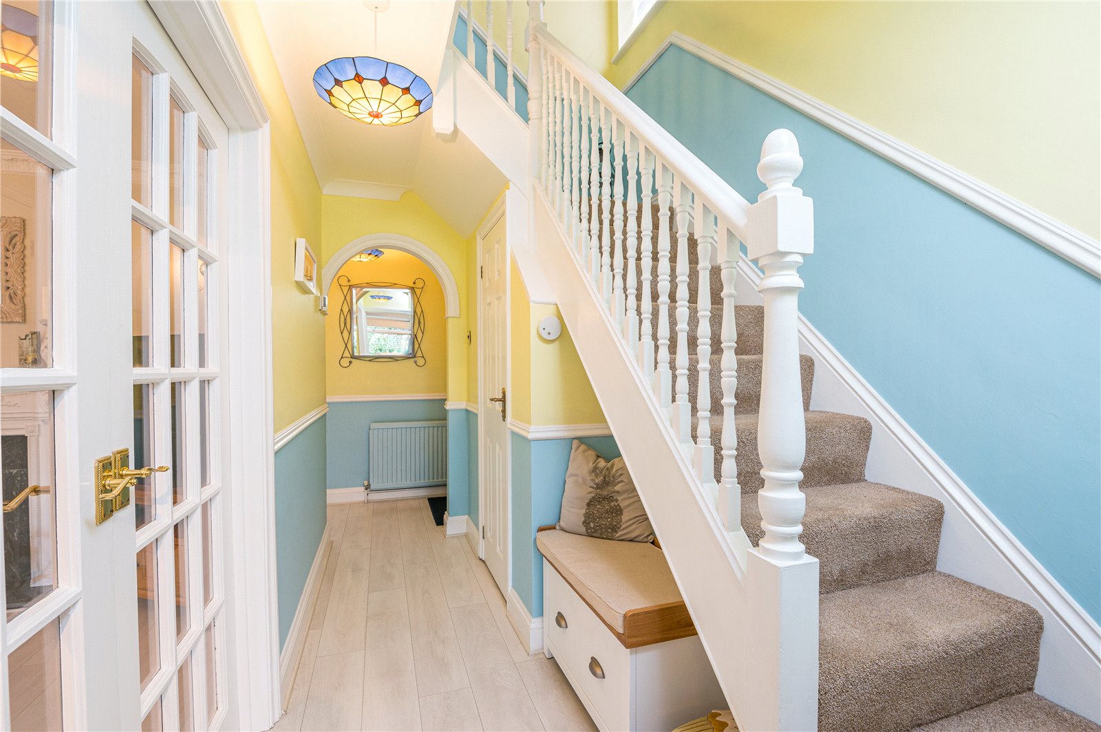uPVC double glazed entrance door to the side aspect. Coved cornicing with smooth plastered walls and ceiling. Double banked radiator. Dado rail. Wall mounted central heating thermostat. Laminate wood effect flooring. Telephone point. Six panelled doors leading to rooms. Stairs leading to first floor accommodation.