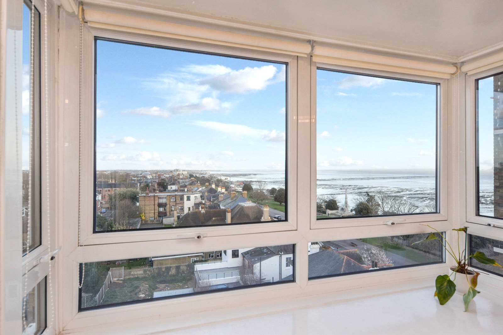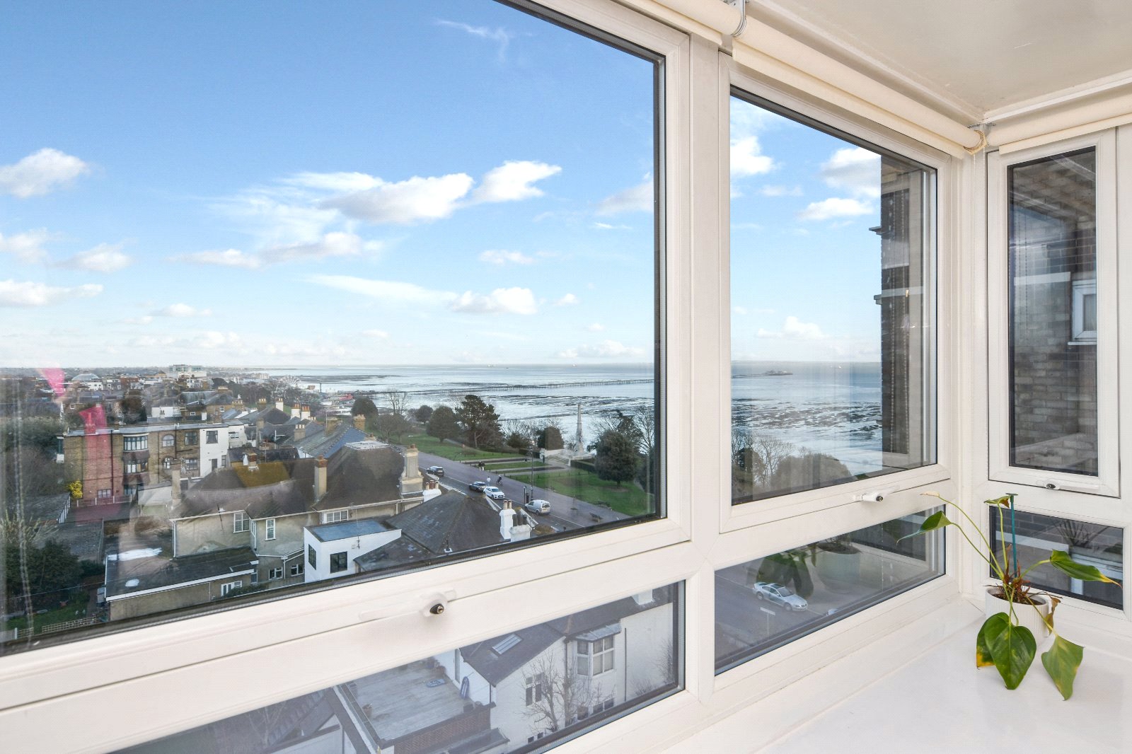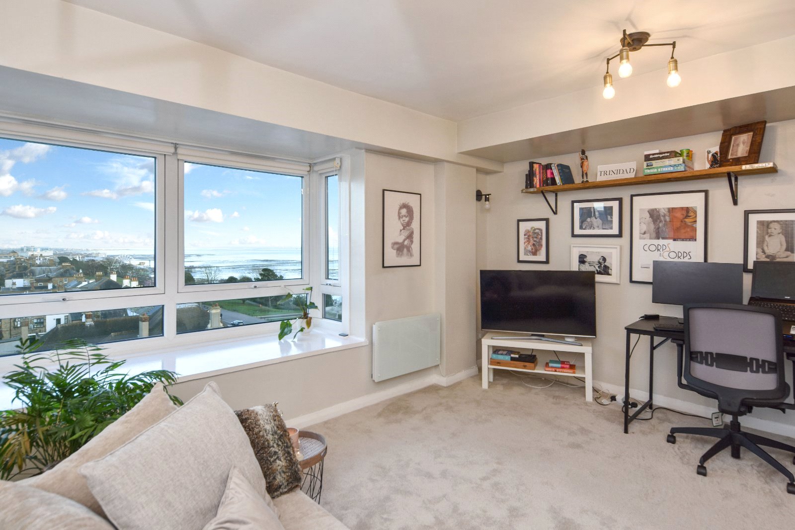 Generous size uPVC double glazed square bay window affording outstanding views towards Southend and Shoeburyness with large window seating area. Feature multi pane mirrors to one aspect. Wall light points. Wall mounted electric heater. Smooth plastered ceiling.