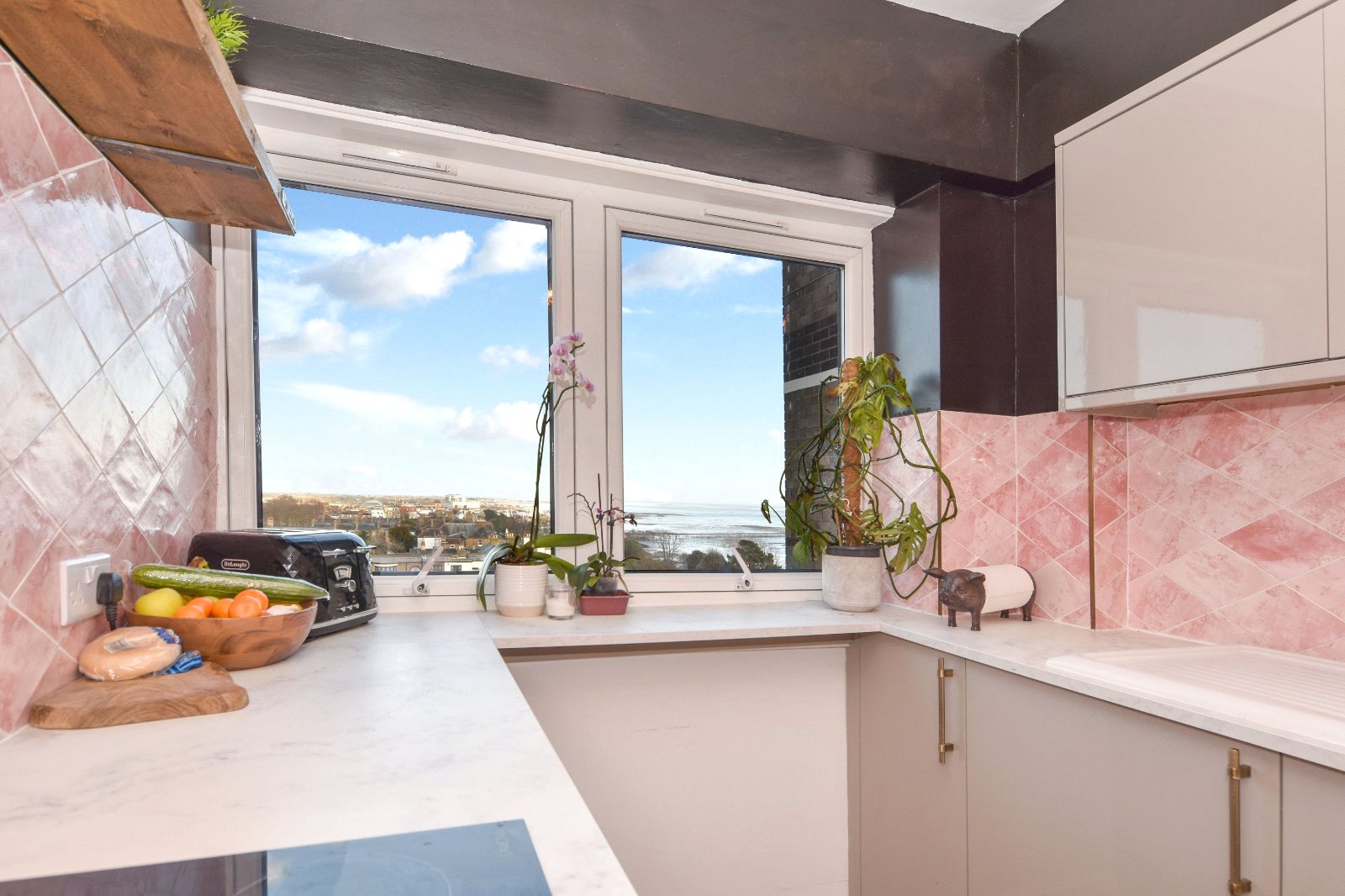 uPVC double glazed window affording outstanding views towards Southend and Shoeburyness. The recently installed Kitchen comprises a range of high gloss eye and base level units with granite effect working surfaces over inset with porcelain single drainer sink unit with mixer tap over. 'Lamona' electric oven with four ring electric hob over. Integrated 'Lamona' washing machine (to remain). Integrated upright fridge/freezer. Attractive tiled splash backs. Door to cupboard housing water tank. Laminate wood effect flooring.
