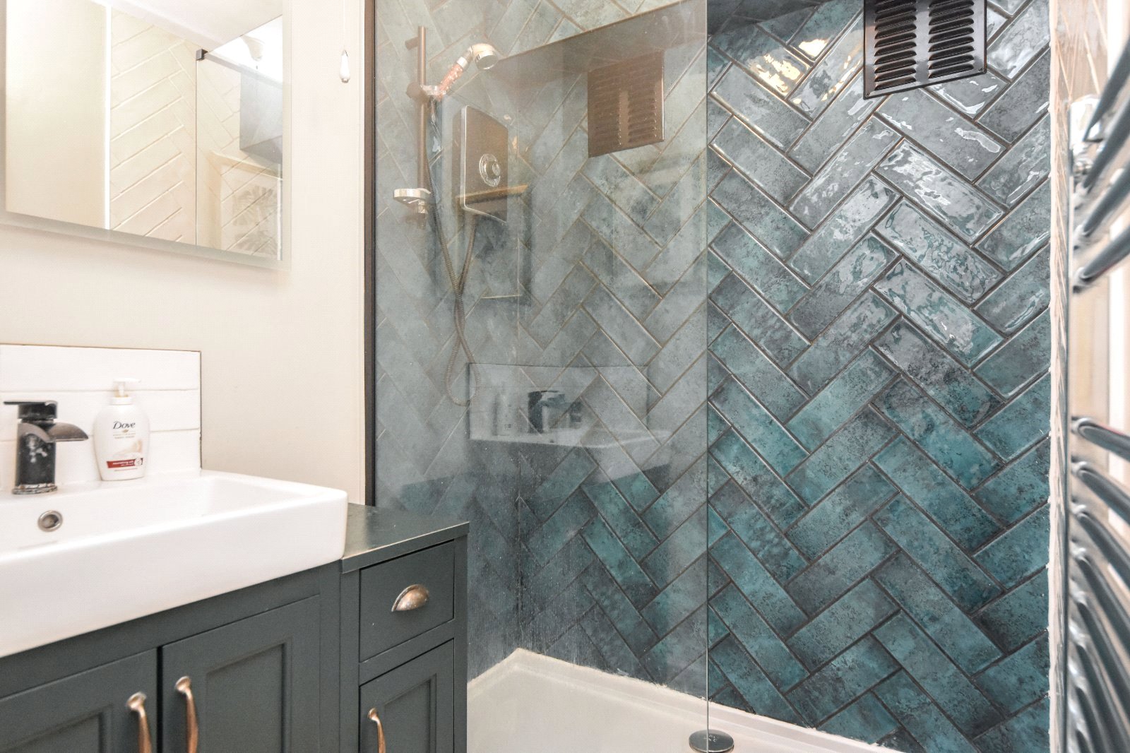 High level obscure uPVC double glazed window to side aspect. The recently installed suite comprises concealed cistern dual flush wc with contemporary wash hand basin with mixer tap over and storage cupboard under. Painted tiled walls. Attractive floor tiling.