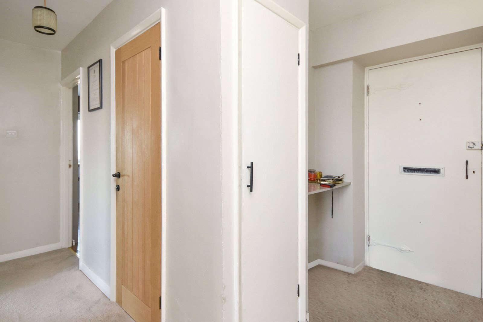 Entry phone handset. Oak panelled doors to Living Room, Bedroom, Kitchen, Shower Room and separate WC. Door to large walk in storage cupboard (measuring 6'6 x 2'2). Further door to cloaks cupboard. Smooth plastered ceiling.