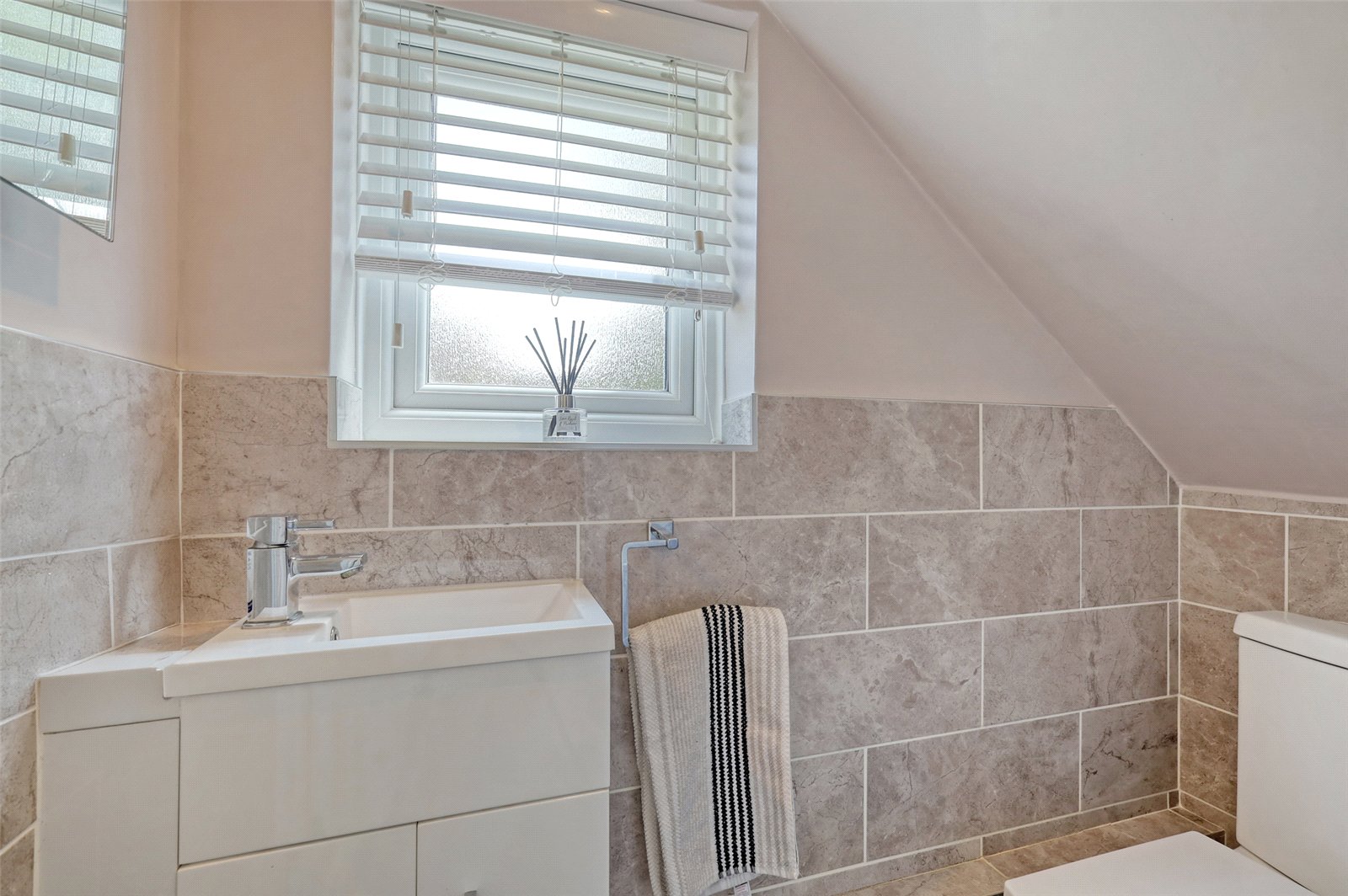 Obscure double glazed window to side. Fitted with a two piece suite comprising of wash hand basin in vanity unit and WC. Part tiling to walls. Tiled floor.