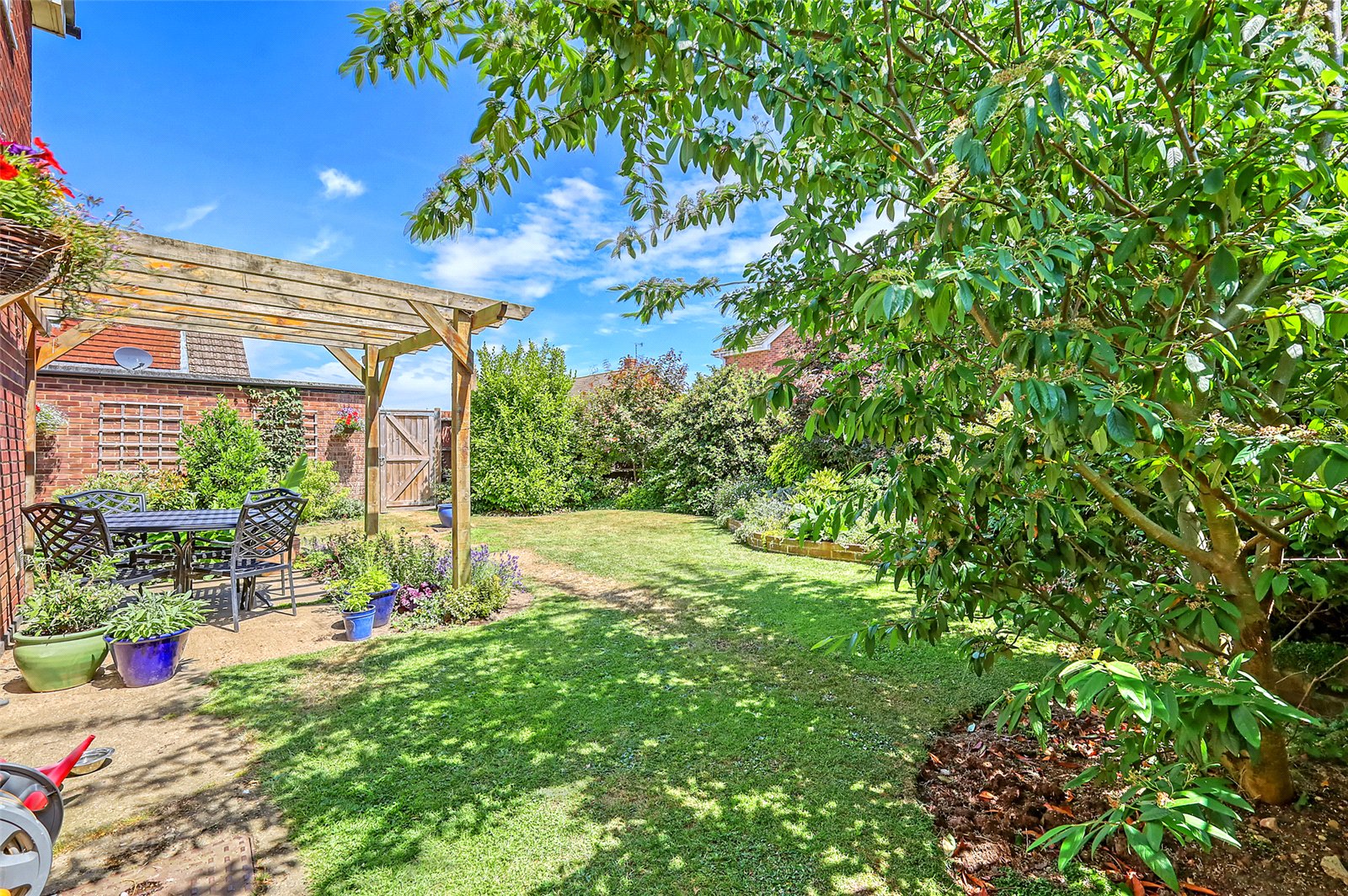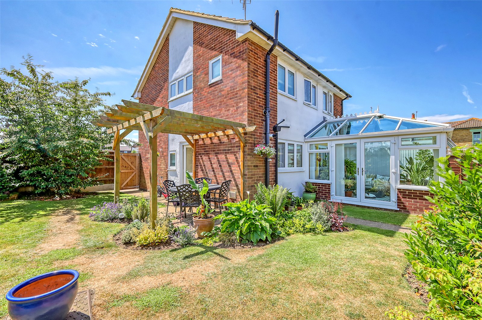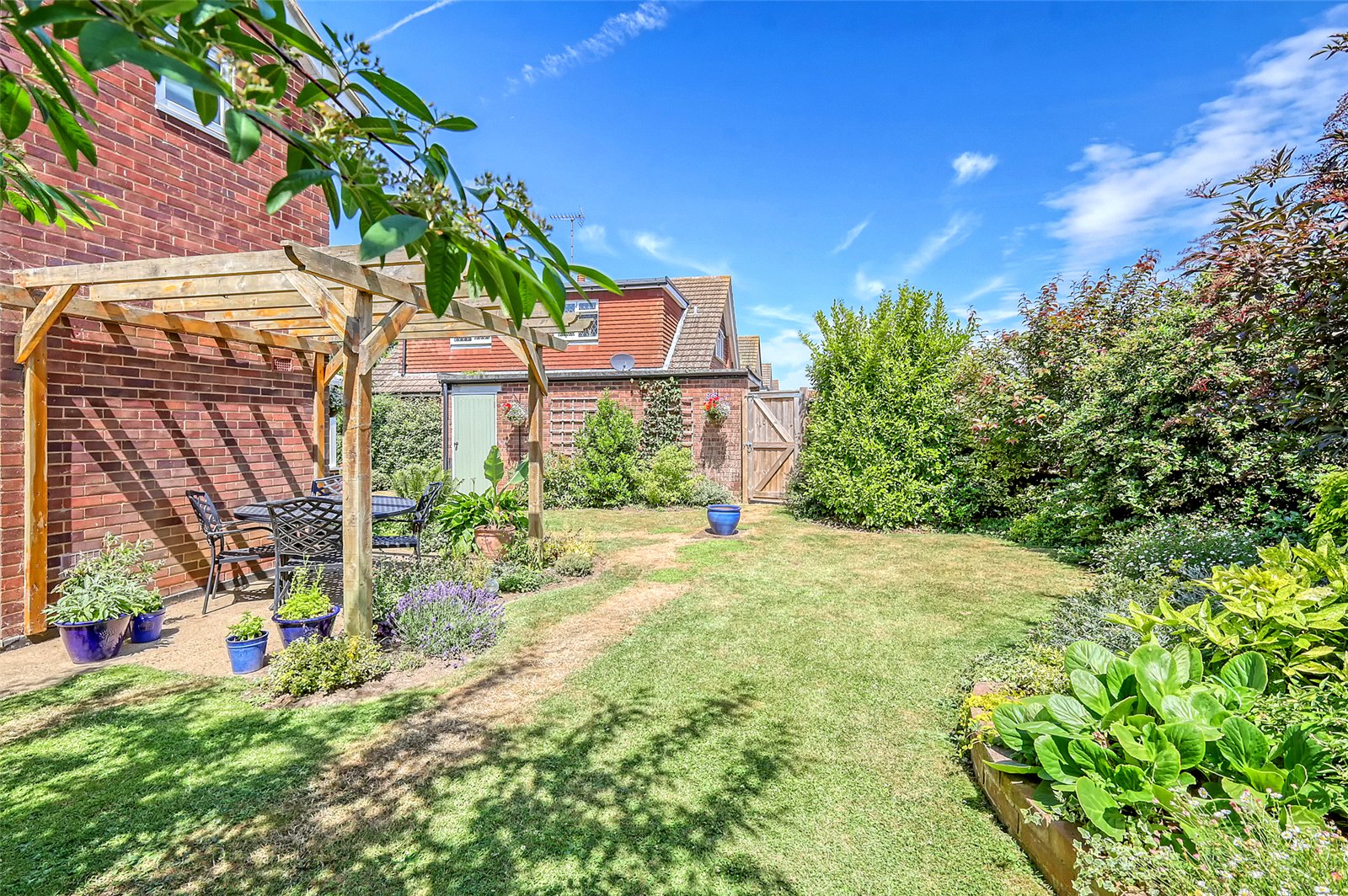 The landscaped rear gardens commence from the Sun Lounge and Kitchen with paved patio terracing and timber garden arbour. The remainder being attractively laid to lawn with mature planted shrub and flower borders. Personal door leads into a Detached Garage to the rear of the garden. Timber gate access to the front of the property with further timber gate to rear giving access to the garage and driveway. Outside water tap.