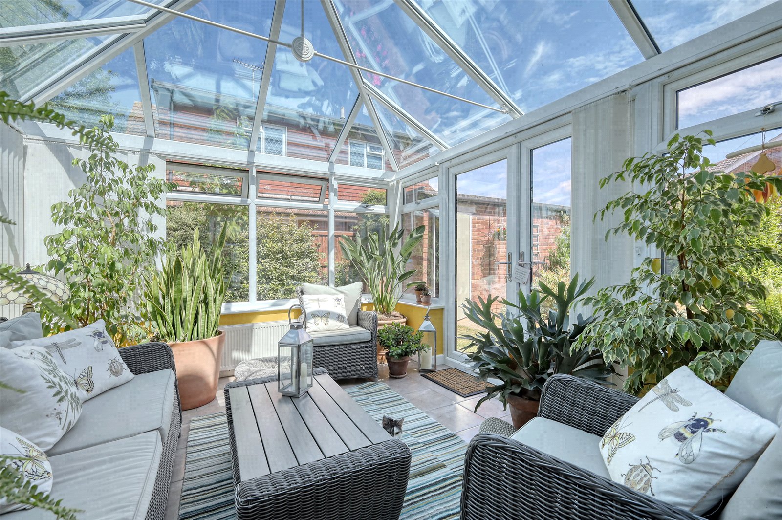 uPVC double glazed to sides and rear, overlooking the landscaped gardens. French doors to side, radiator, tiled flooring.