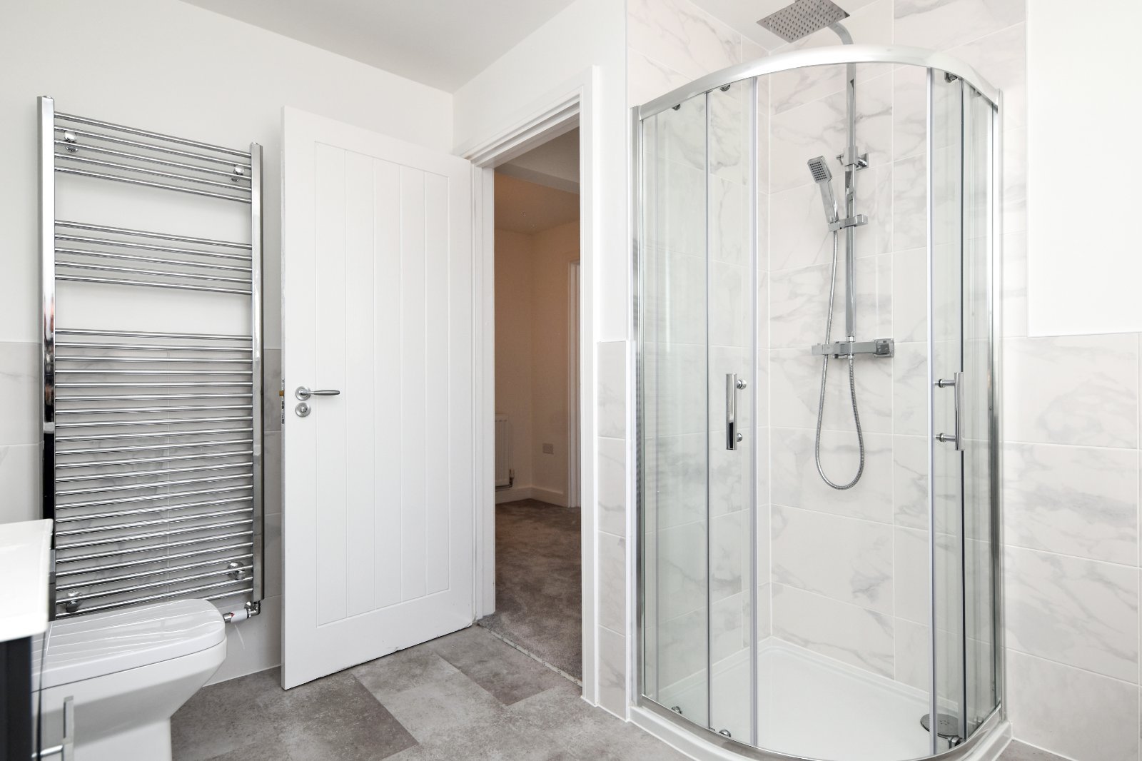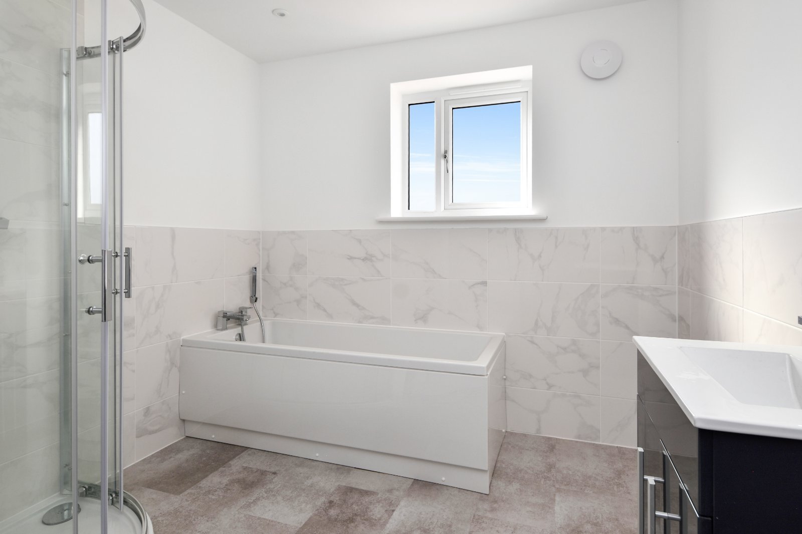 This family bathroom combines clean lines with contemporary comfort. Marble-effect wall tiling to half-height adds a touch of luxury. The suite comprises a white panelled enclosed bath with a chrome mixer tap and handheld shower, independent tiled shower enclosure inset with integrated shower unit with hand held attachment and drencher style shower over, modern vanity unit with inset basin and chrome fittings with storage cupboard under and a dual flush WC. Other features include smooth plastered ceiling inset with recessed ceiling lighting and extractor fan and a ladder style heated towel rail.