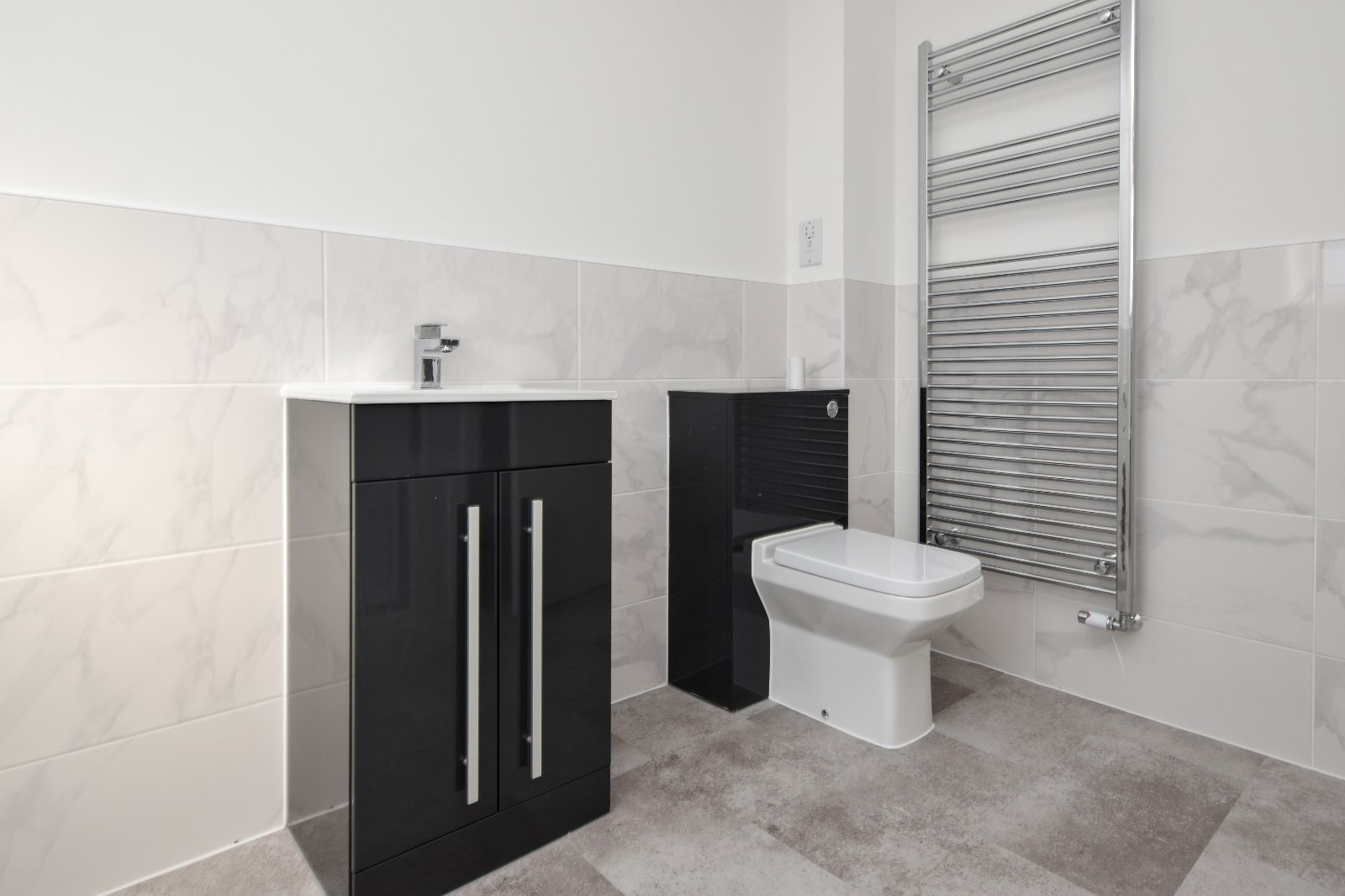 The suite features a contemporary vanity unit with inset basin, chrome fittings, and a tiled splashback, along with an under-sink storage cupboard housing a concealed-cistern dual-flush WC. Additional touches include a radiator, stylish LVT wood-effect flooring, and a smooth plastered ceiling with recessed lighting for a sleek, modern finish.