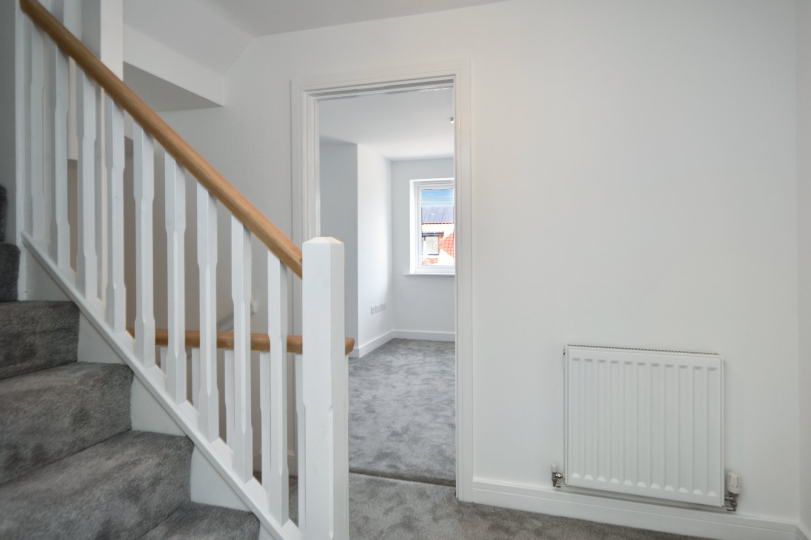 Accessed via a turned staircase with a white-painted spindle balustrade and natural wood handrail, the landing features a returned staircase leading to the first floor level of the home. Finished with plush grey carpeting and a smooth plastered ceiling, it provides access—through matching vertical-panelled internal doors—to the Living Room/Diner, Bedroom, and Fourpiece Family Bathroom. A radiator and an additional matching door opens to the airing cupboard.