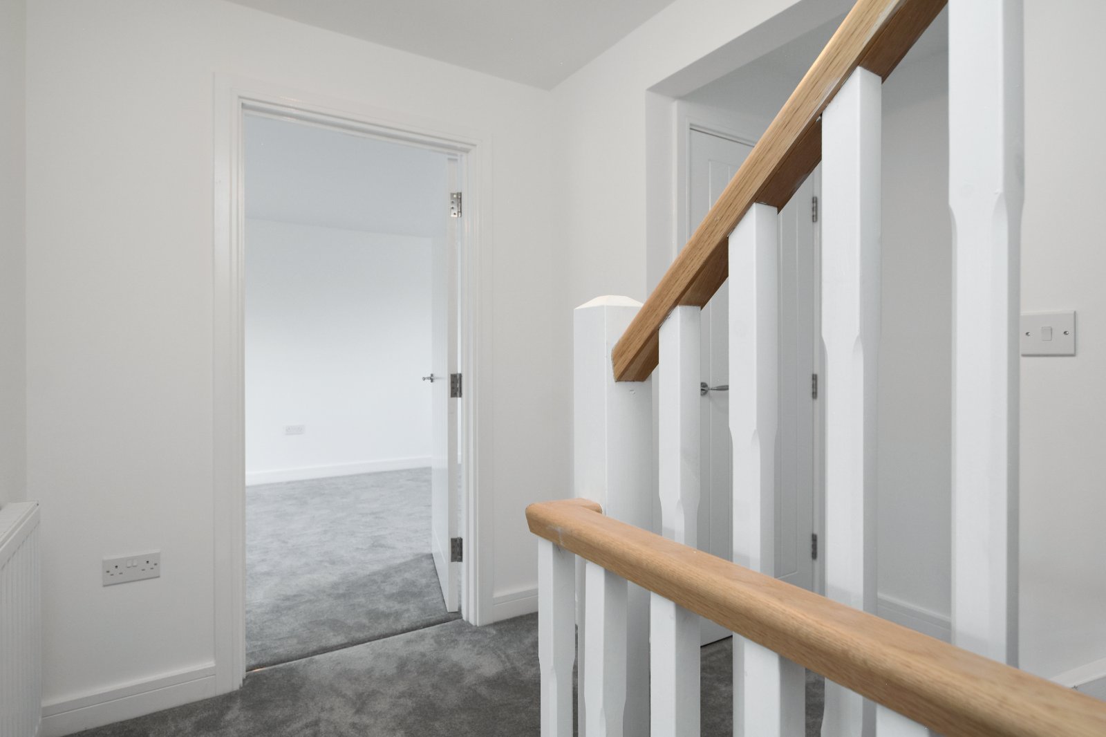 Finished with plush grey carpeting, a smooth plastered ceiling inset with access to eaves/loft space. White-painted spindle balustrade with natural wood handrail providing access via a vertical panelled doors to the top three bedrooms.