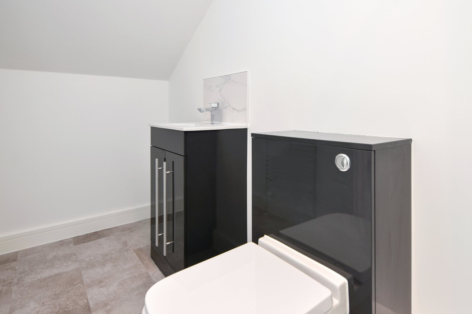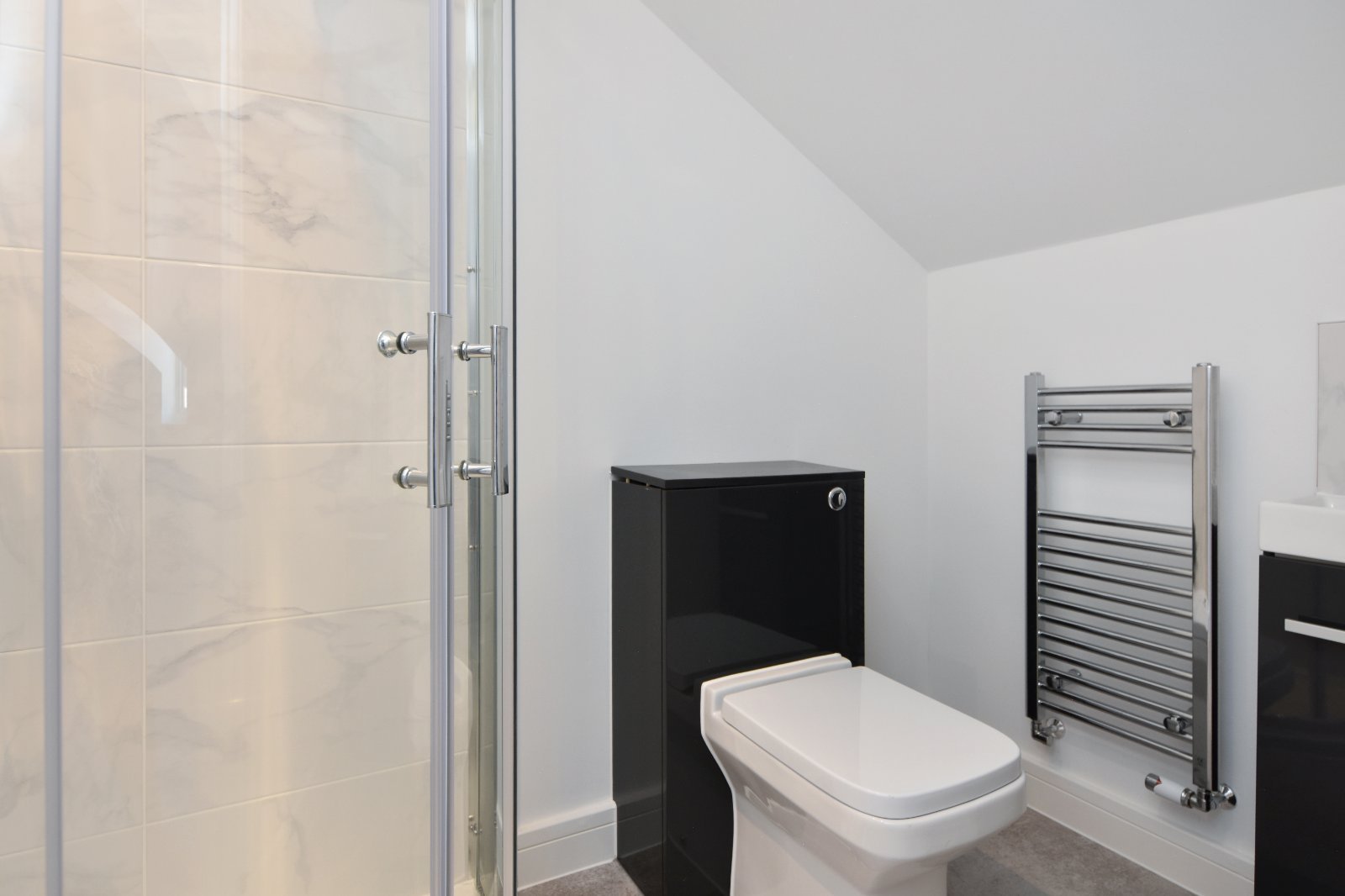 The en-suite has been thoughtfully designed with a contemporary walk-in shower with sliding glass doors is fitted with a chrome dual shower unit, featuring both a handheld attachment and an overhead drencher shower, set against elegant marble-effect gloss tiled walls. The space is completed by a gloss finish concealed cistern WC and a matching vanity unit with an inset basin. Chrome heated towel rail adds comfort, ceiling-mounted extractor fan. The smooth plastered sloped ceiling enhances the space with subtle architectural charm.