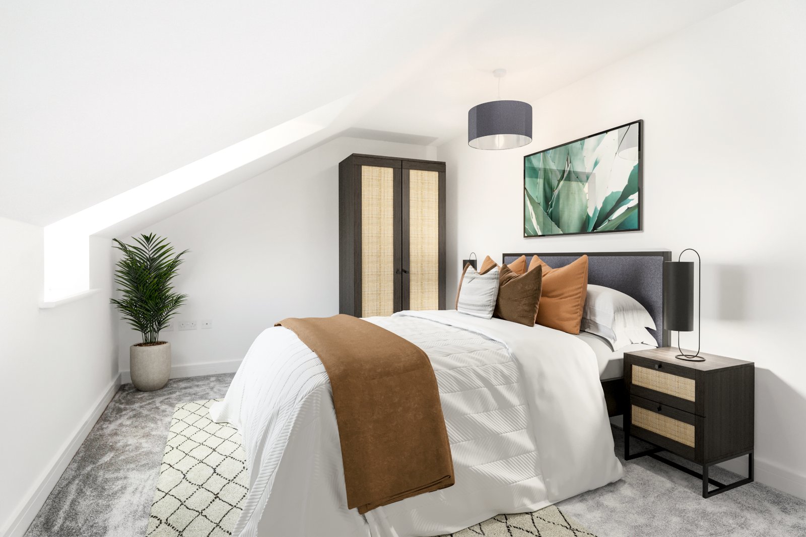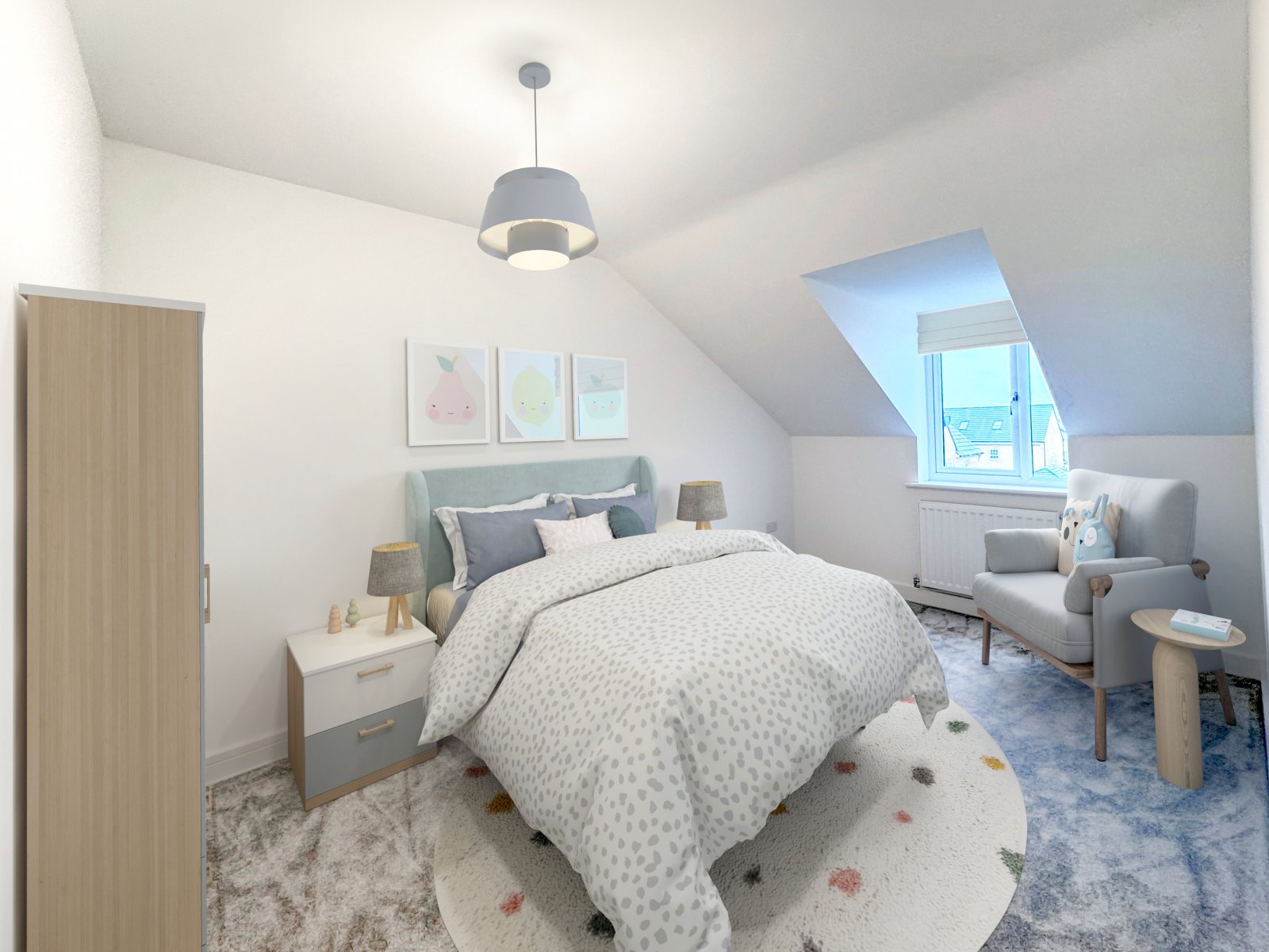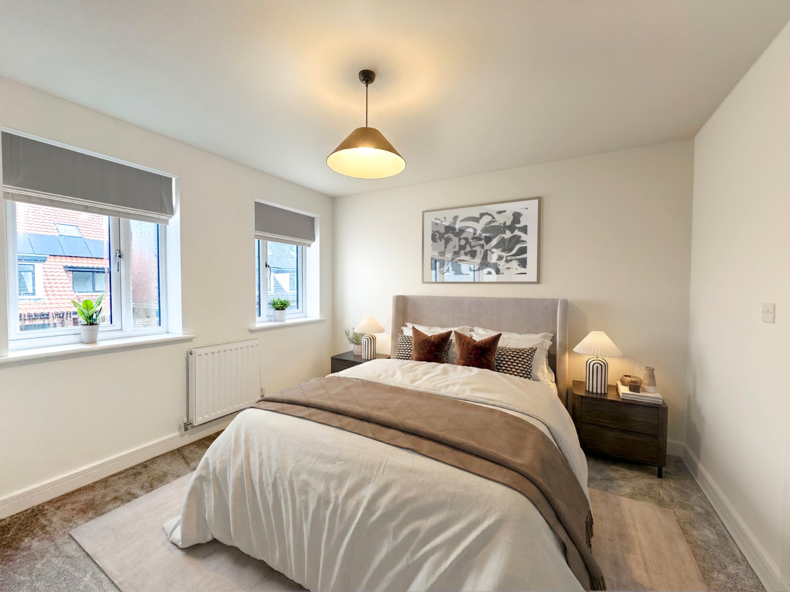 The room benefits from a south-facing feature dormer window, enhancing the space with architectural character and drawing in an abundance of natural light. Radiator, Smooth plastered ceiling complements the clean, modern lines of the home. The neutral colour palette, paired with plush grey carpeting and angled ceilings, creates a cosy atmosphere.