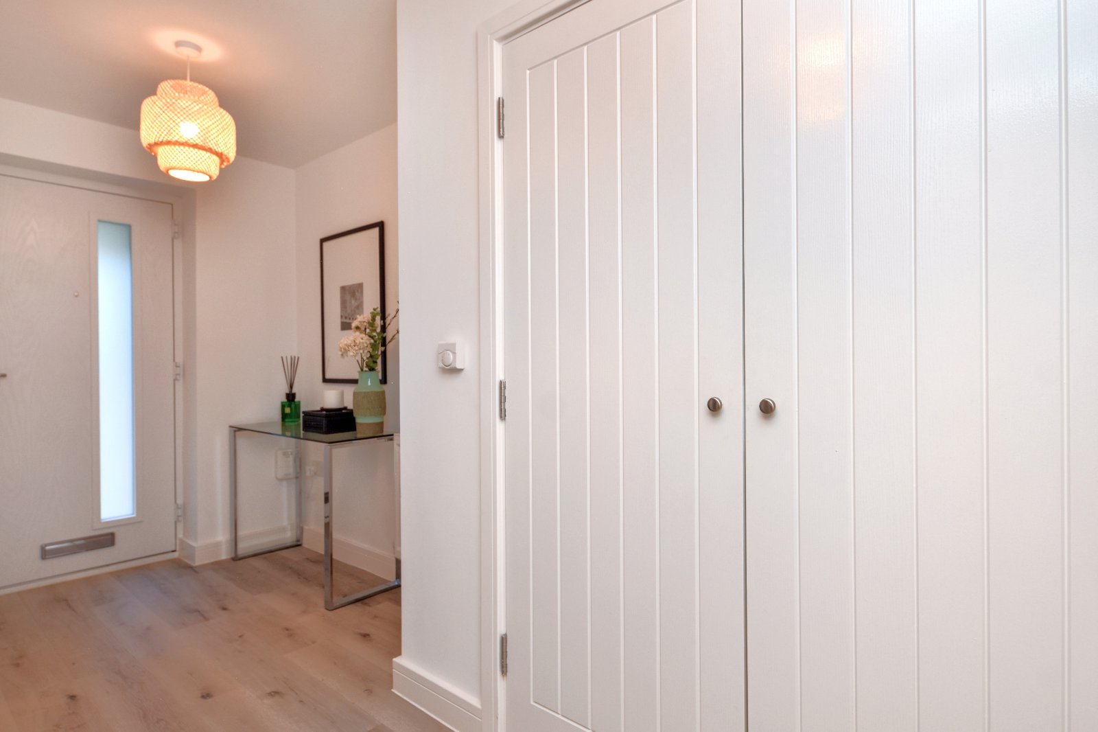 Contemporary entrance hall, finished with stylish LVT wood effect flooring. Pair of modern vertical panelled internal doors providing access to a good size storage cupboard inset with wall mounted fuse box and lighting. Thermostat control point. Turned staircase rising to the first floor landing with soft, plush pile carpet in a light grey tone. Modern vertical panelled internal doors provide access to the Kitchen/Family Room, Home Office space and Ground floor Guest WC. Radiator. Smooth plastered ceiling.