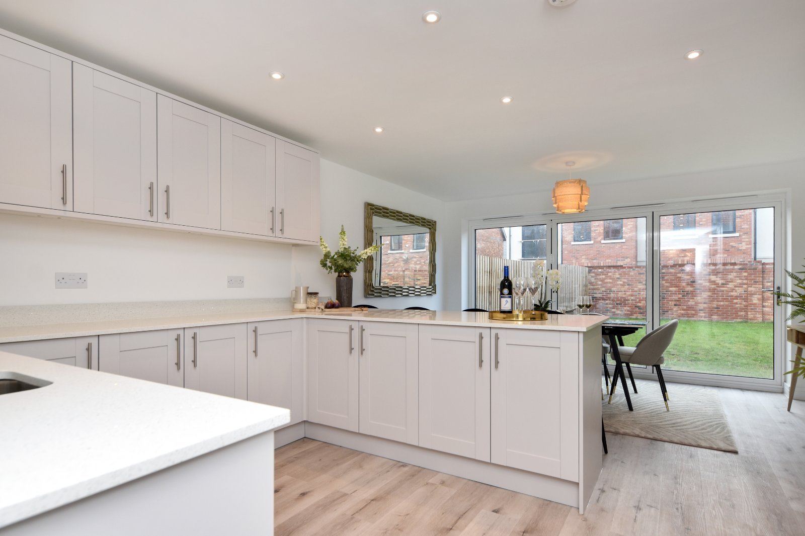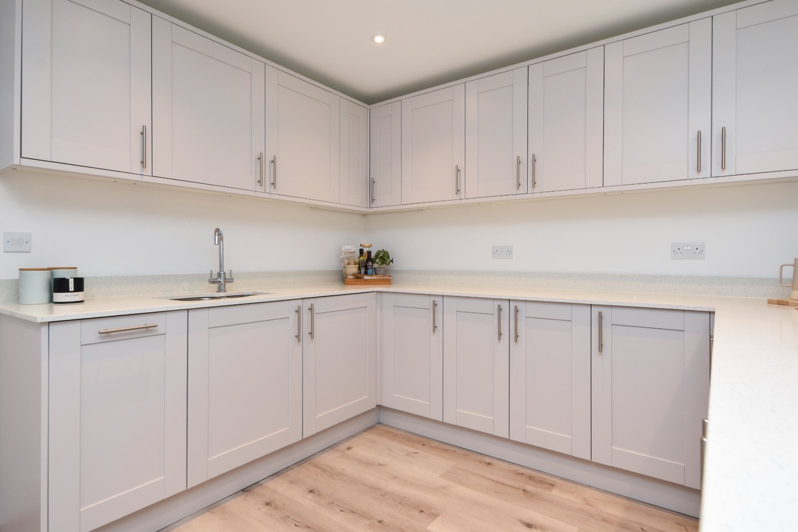 This beautifully planned Kitchen/Dining area offers a bright, open-plan layout—perfect for everyday living and entertaining. Finished to a high standard, the kitchen features timeless ‘Oxford Shaker’ cabinetry in Pebble Grey, paired with luxurious ‘Seattle Steel Sparkle effect' Quartz worktops and matching upstands. The worktop is inset with a recessed one-and-a-quarter stainless steel sink and modern chrome mixer tap. Concealed wall mounted 'E-TEC NXS' wall mounted boiler.