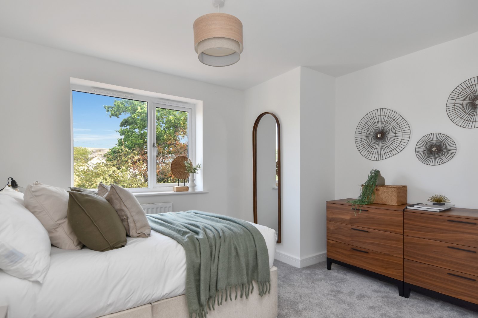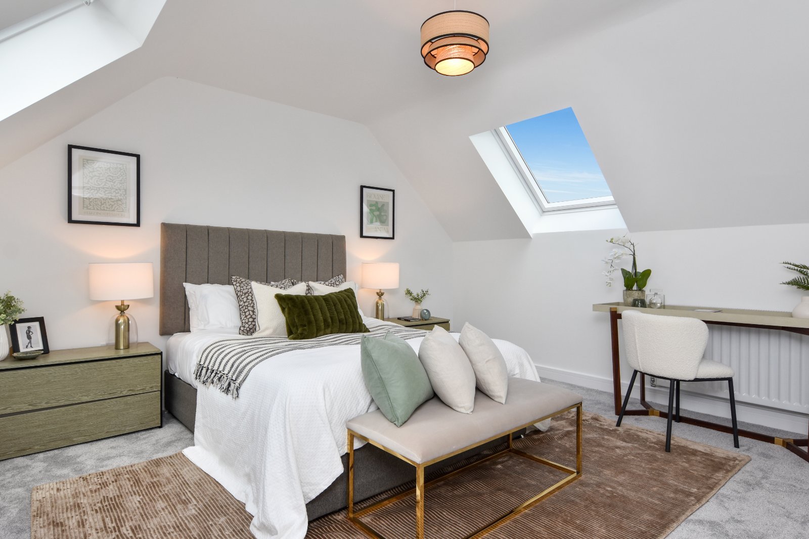 Part-vaulted smooth plastered ceiling inset with uPVC double glazed dormer-style window to the rear aspect. design, adding architectural interest and character. Finished in a fresh neutral palette with plush grey carpeting. Radiator. The room is available for a full range of bedroom furniture, and the layout allows flexibility for wardrobes or dressing area.