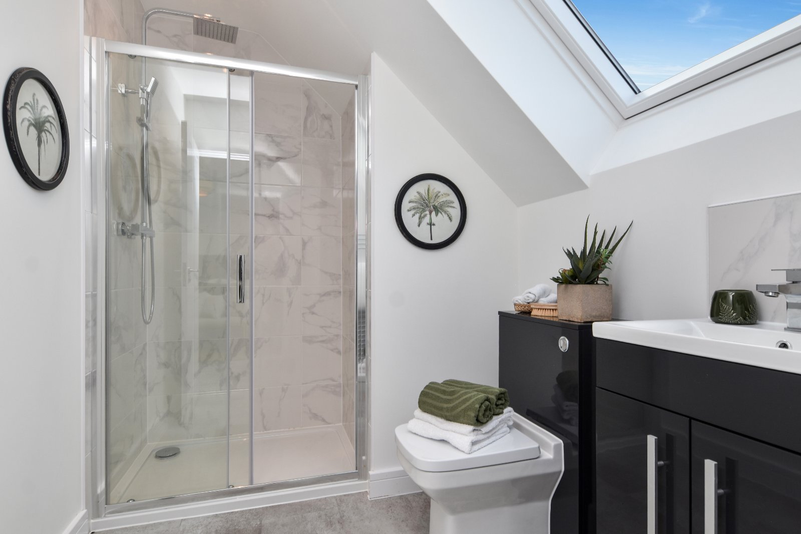 The suite comprises a large walk-in shower enclosed with clear glass sliding doors with integrated shower unit with hand held attachment and drencher style shower over and finished with luxurious marble-effect tiling. The stylish vanity unit with inset basin and chrome mixer tap offers both a bold visual statement and practical storage with a matching concealed cistern dual flush wc. A large uPVC double glazed Velux window providing natural light. Ladder style heated towel rail and smooth plastered part vaulted ceiling.