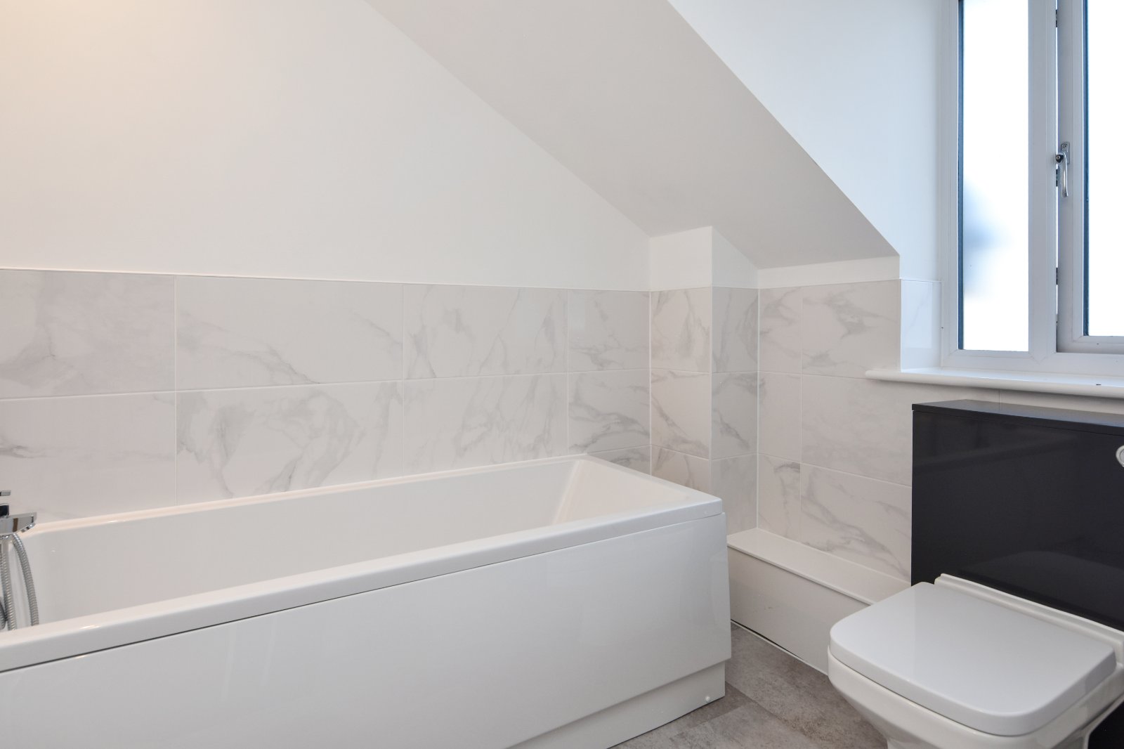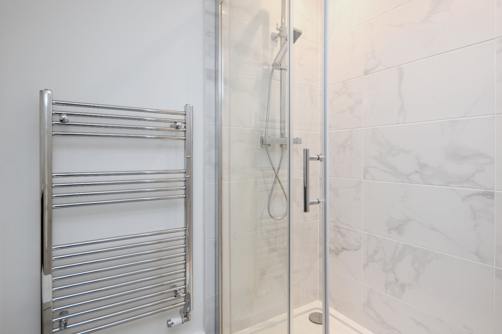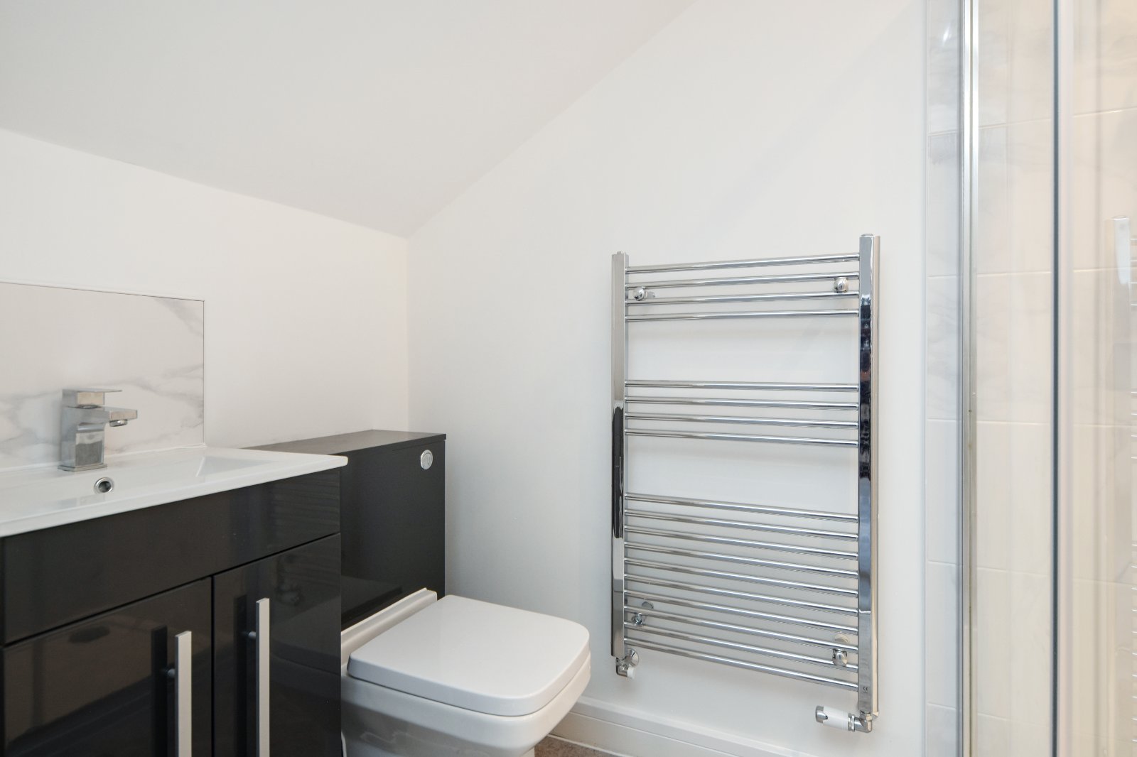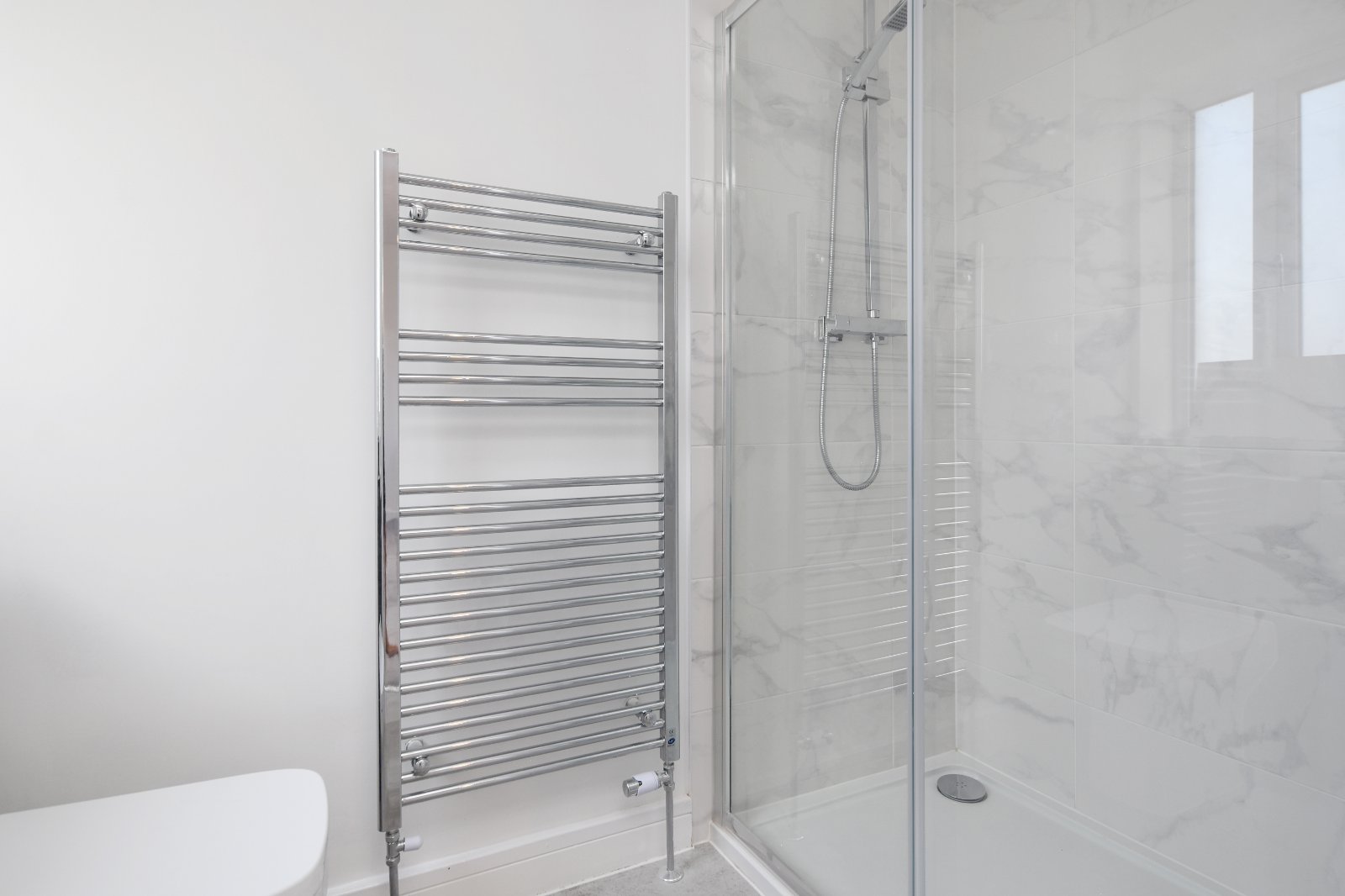 The en-suite has been thoughtfully designed with a contemporary walk-in shower with sliding glass doors is fitted with a chrome dual shower unit, featuring both a handheld attachment and an overhead drencher shower, set against elegant marble-effect gloss tiled walls. The space is completed by a gloss finish concealed cistern WC and a matching vanity unit with an inset basin. Chrome heated towel rail adds comfort, ceiling-mounted extractor fan. The smooth plastered sloped ceiling enhances the space with subtle architectural charm.