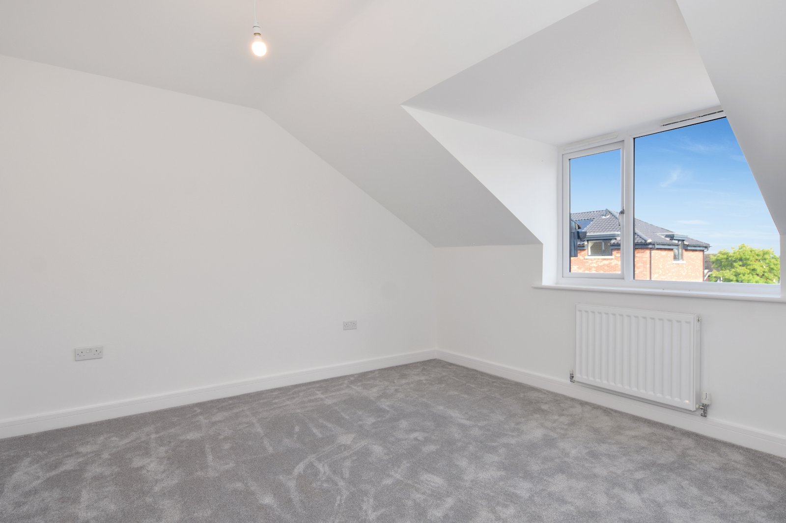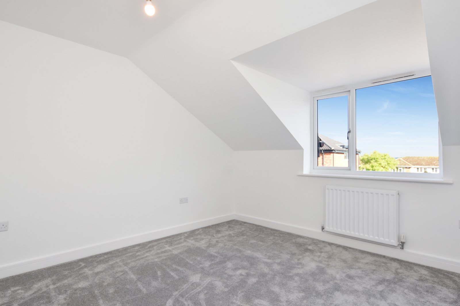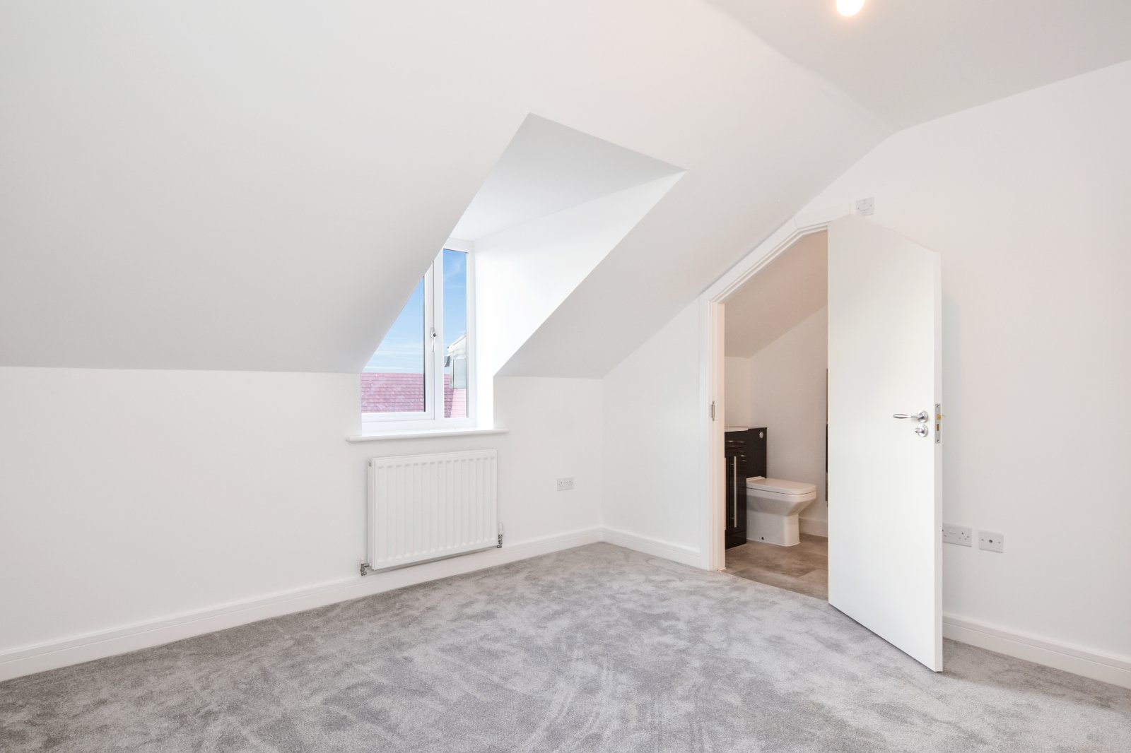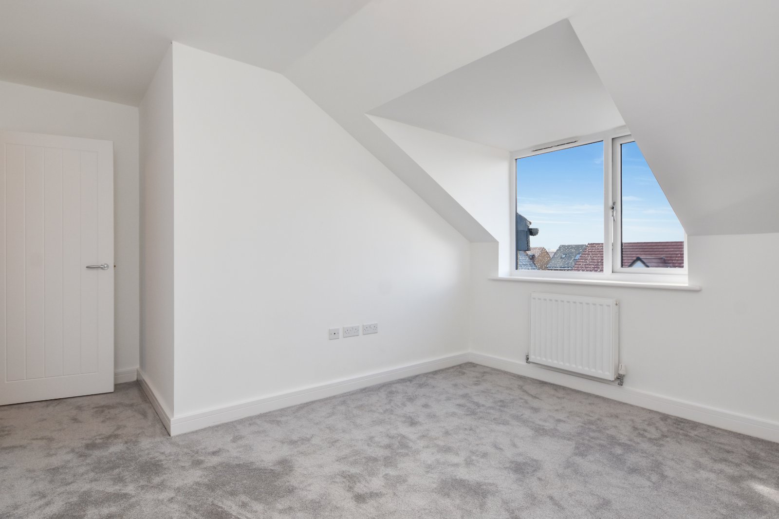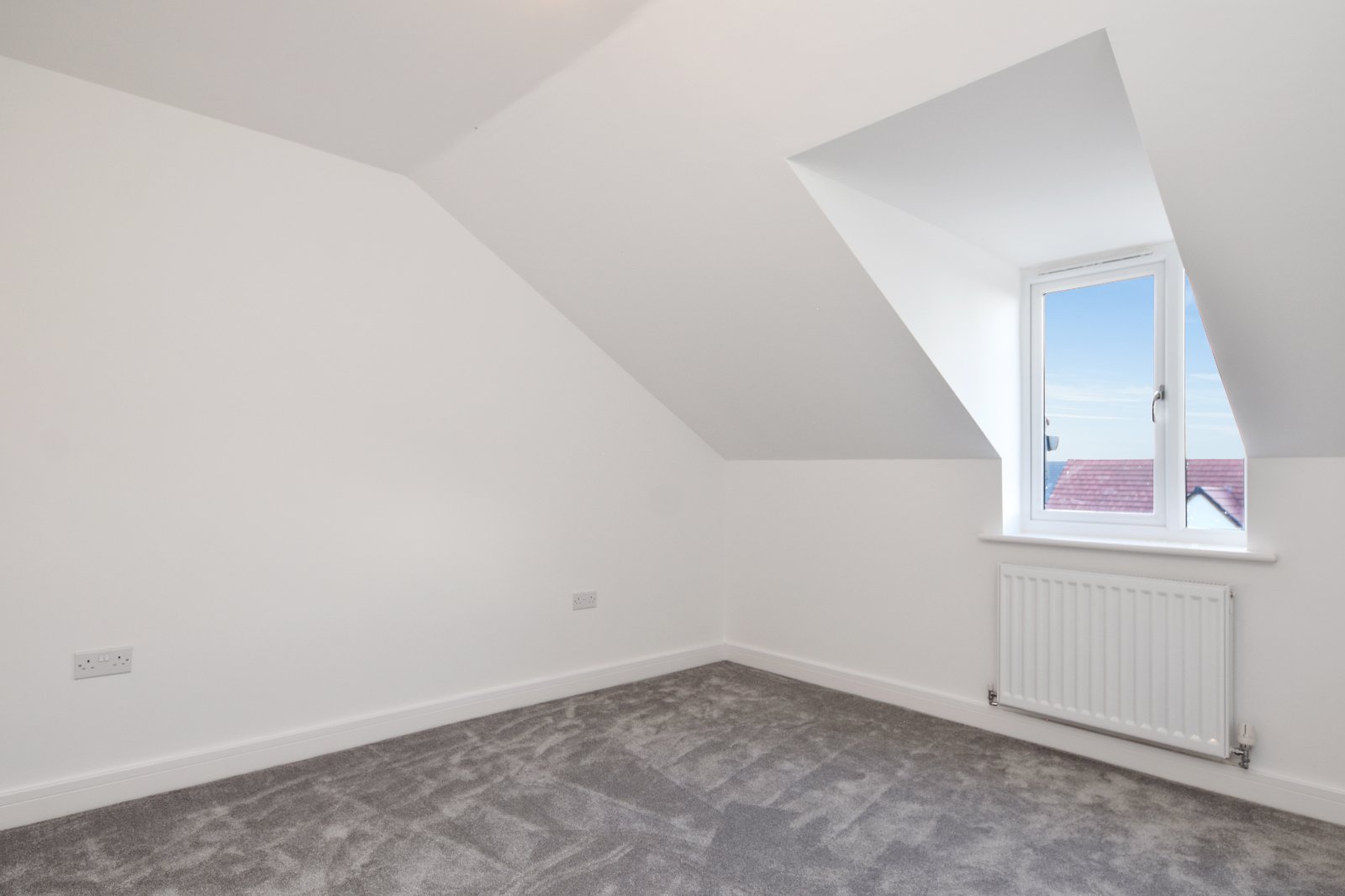 The room benefits from a south-facing feature dormer window, enhancing the space with architectural character and drawing in an abundance of natural light. Radiator, Smooth plastered ceiling complements the clean, modern lines of the home. The neutral colour palette, paired with plush grey carpeting and angled ceilings, creates a cosy atmosphere.