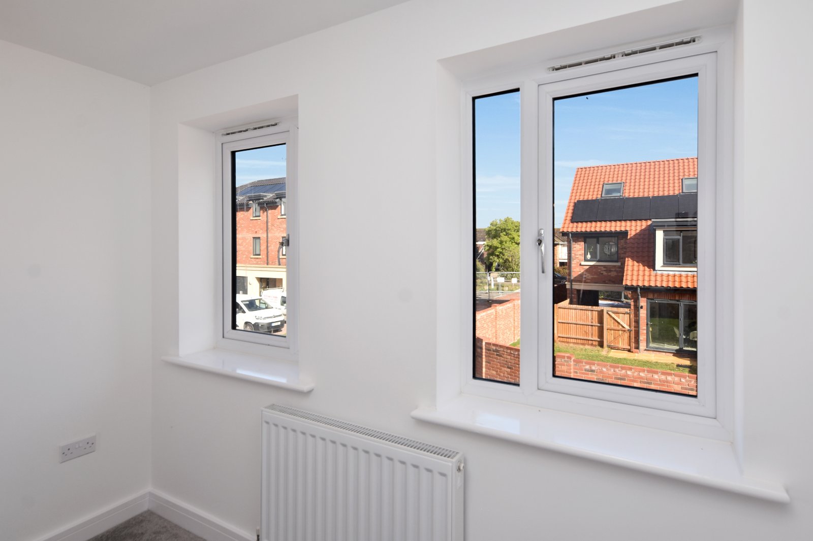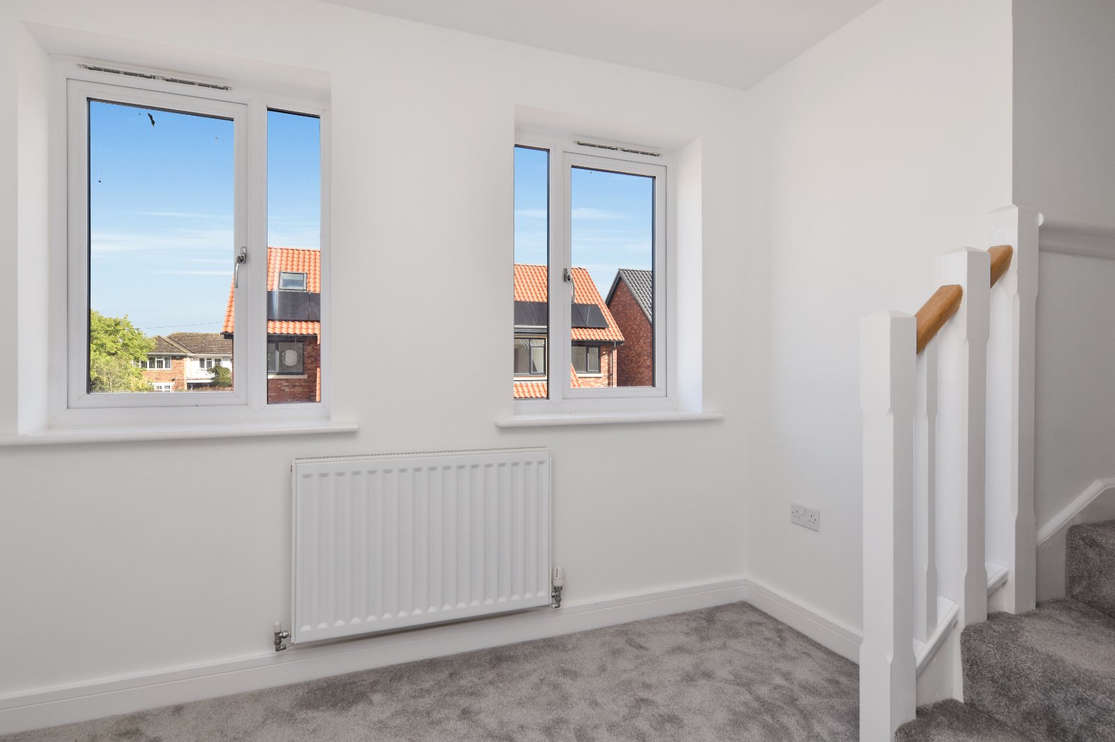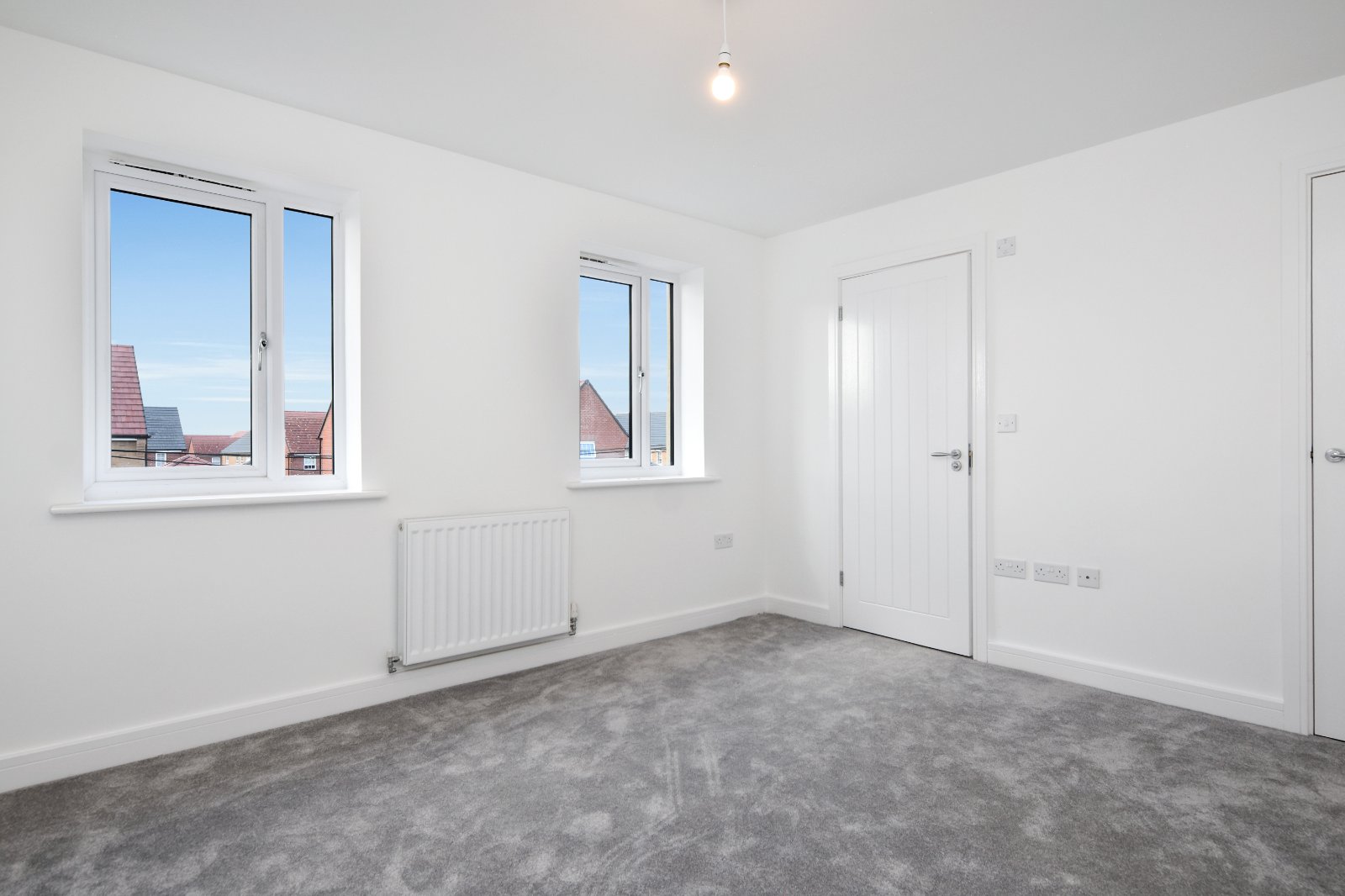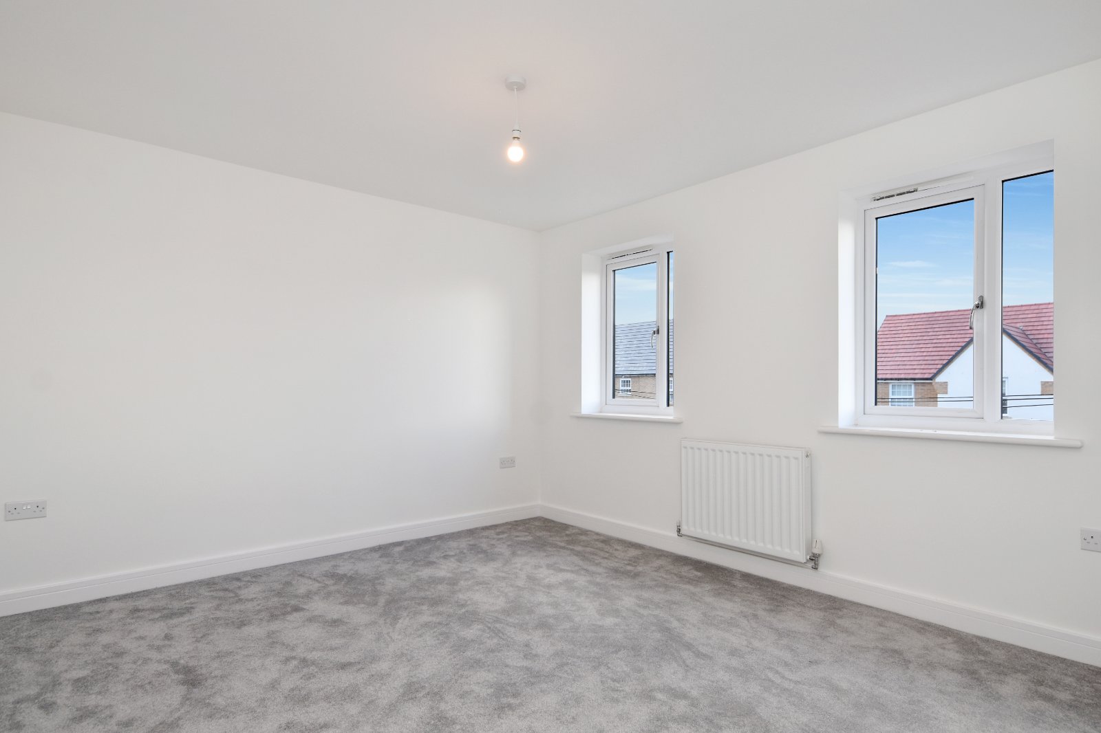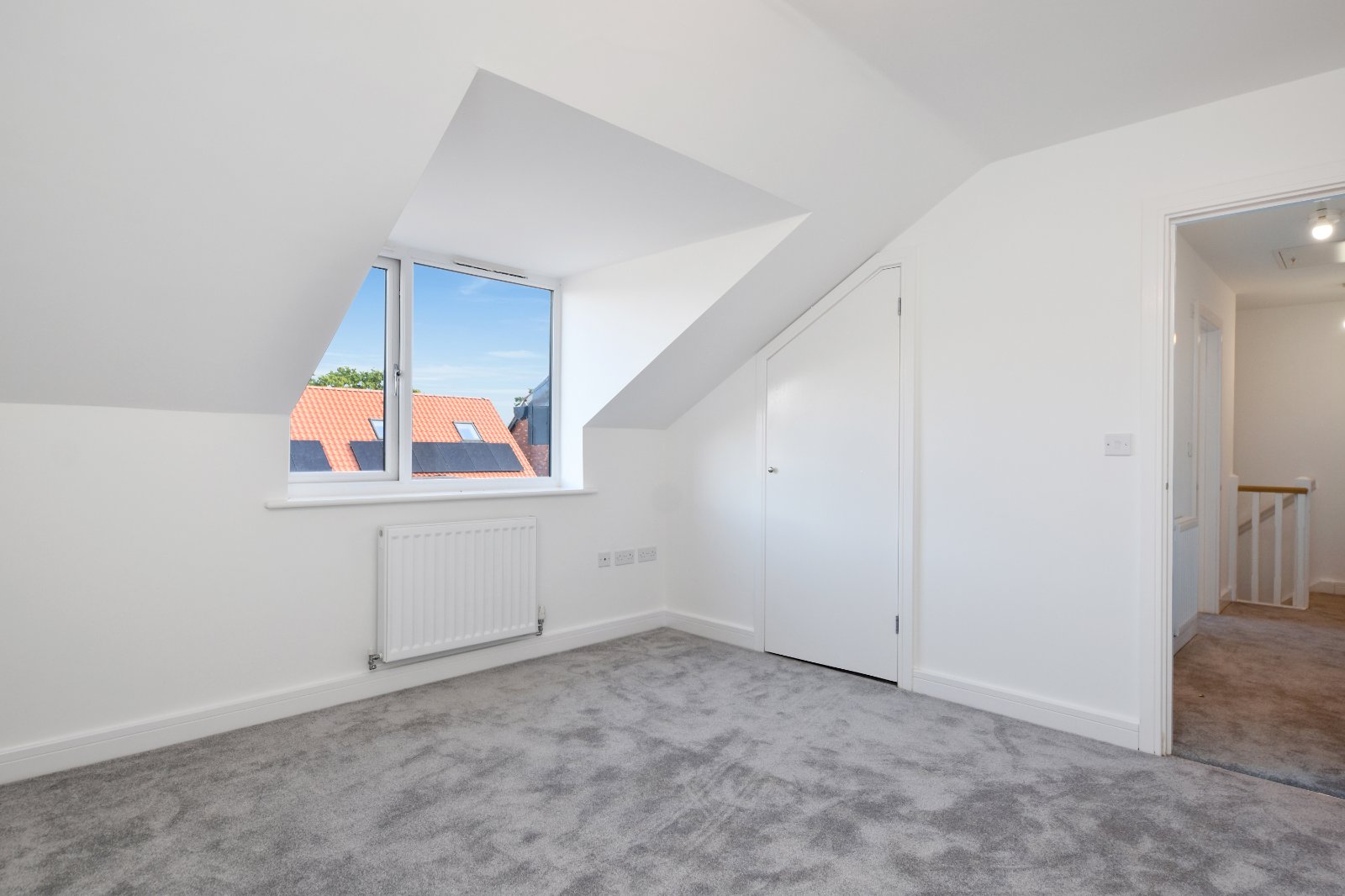 The room benefits from a south-facing feature dormer window, enhancing the space with architectural character and drawing in an abundance of natural light. Radiator, Smooth plastered ceiling complements the clean, modern lines of the home. The neutral colour palette, paired with plush grey carpeting and angled ceilings, creates a cosy atmosphere.