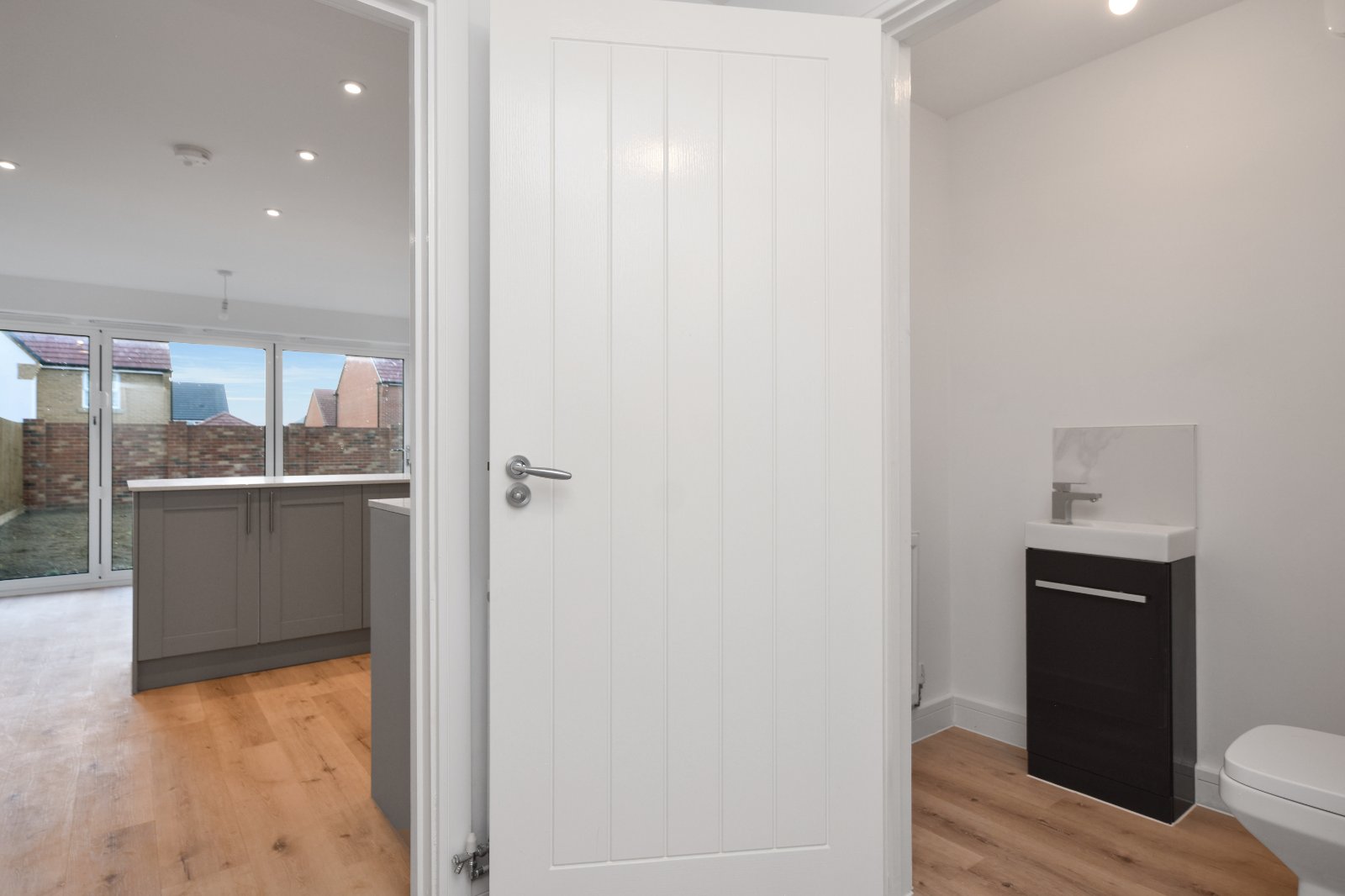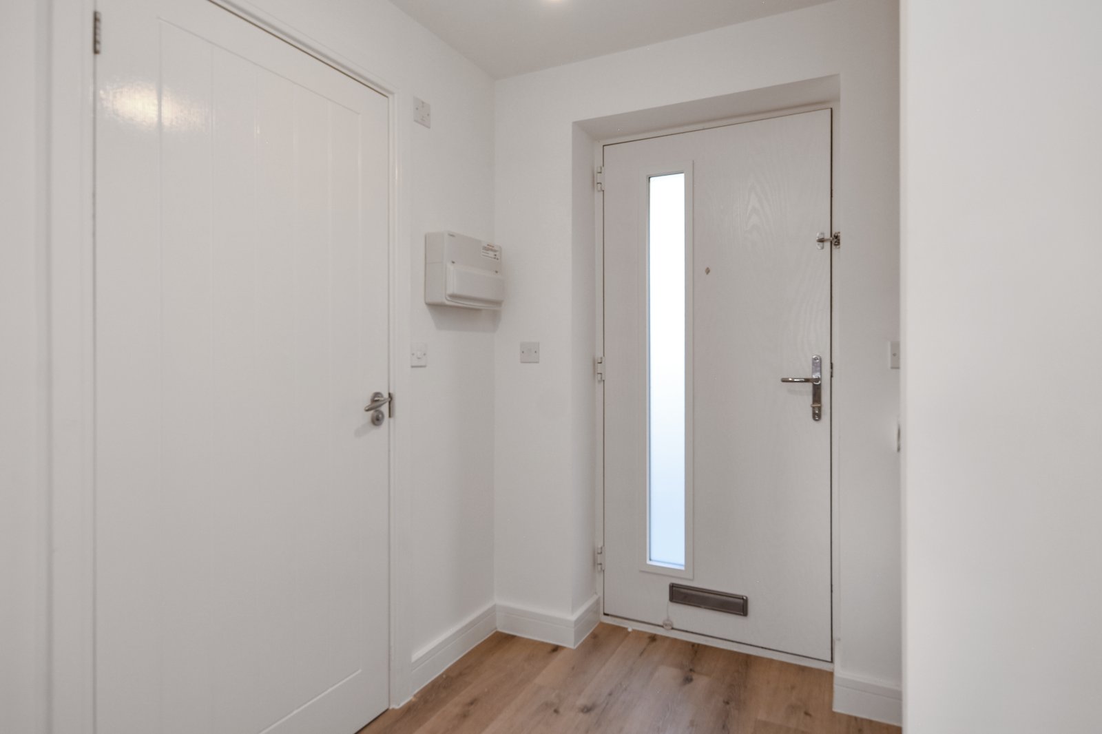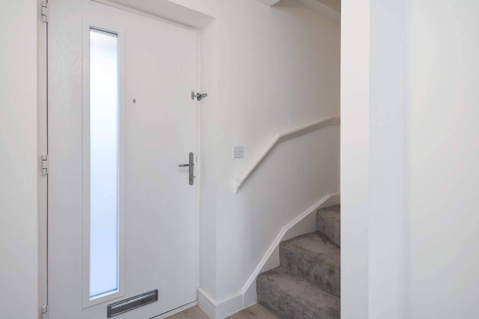 A spacious recessed entrance porch provides a sheltered and stylish approach to the home, framed by smooth, modern rendered walls. The composite front door, inset with a vertical obscure double-glazed panel, adds a contemporary touch. Finished with a contrasting step and pathway, the porch creates a clean and welcoming first impression.