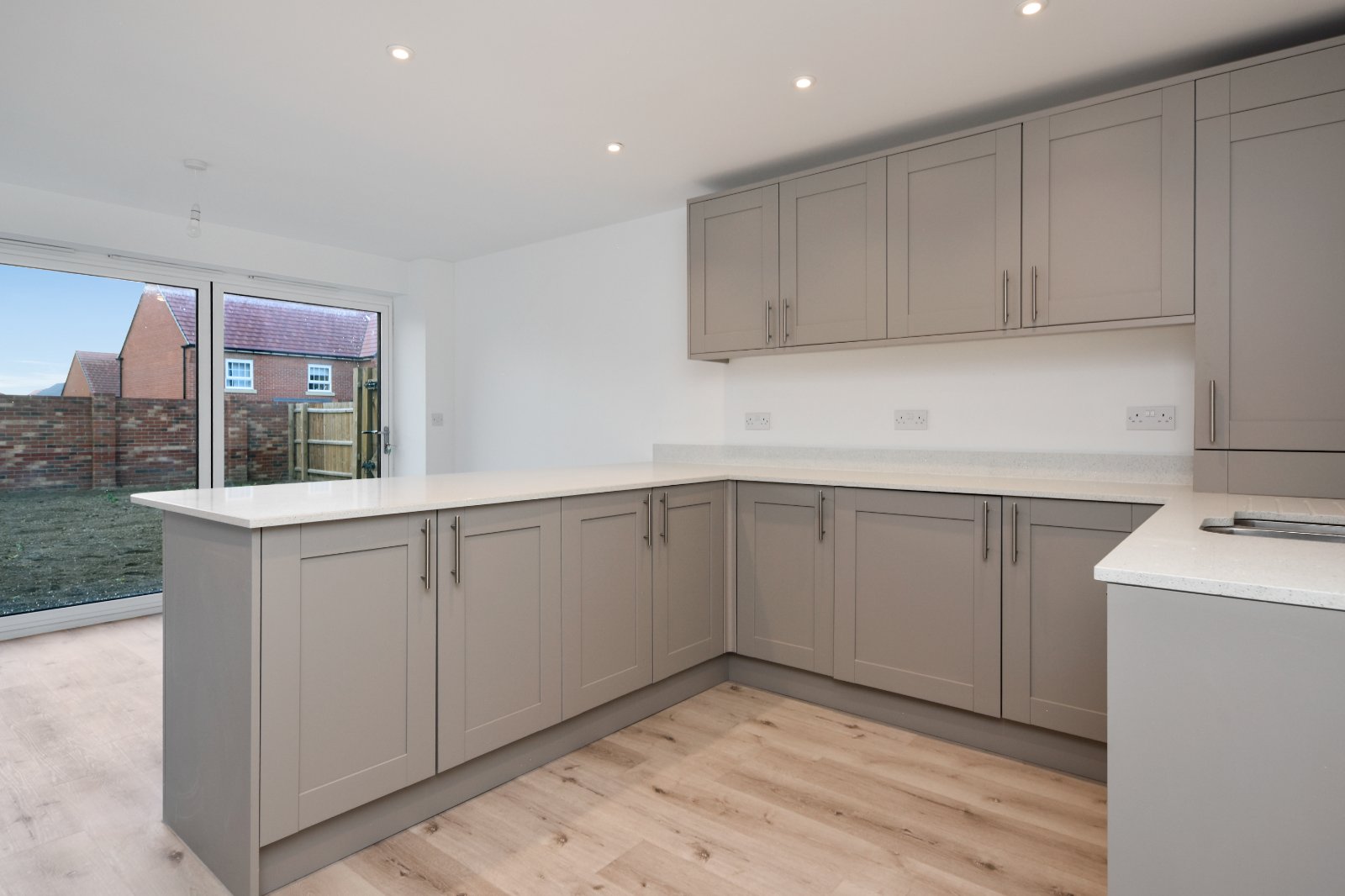 This thoughtfully designed kitchen and dining space combines style, functionality, and a bright, open-plan layout—perfect for both daily life and entertaining guests. Finished to an exceptional standard, the kitchen showcases timeless Oxford Shaker cabinetry in Pebble Grey, beautifully complemented by luxurious Seattle Steel Sparkle Effect Quartz worktops with matching upstands. A one-and-a-quarter stainless steel sink is seamlessly inset into the worktop, paired with a modern chrome mixer tap, while a stainless steel splashback behind the hob adds a clean, contemporary touch. Discreetly housed on the wall is the E-TEC NXS boiler.
