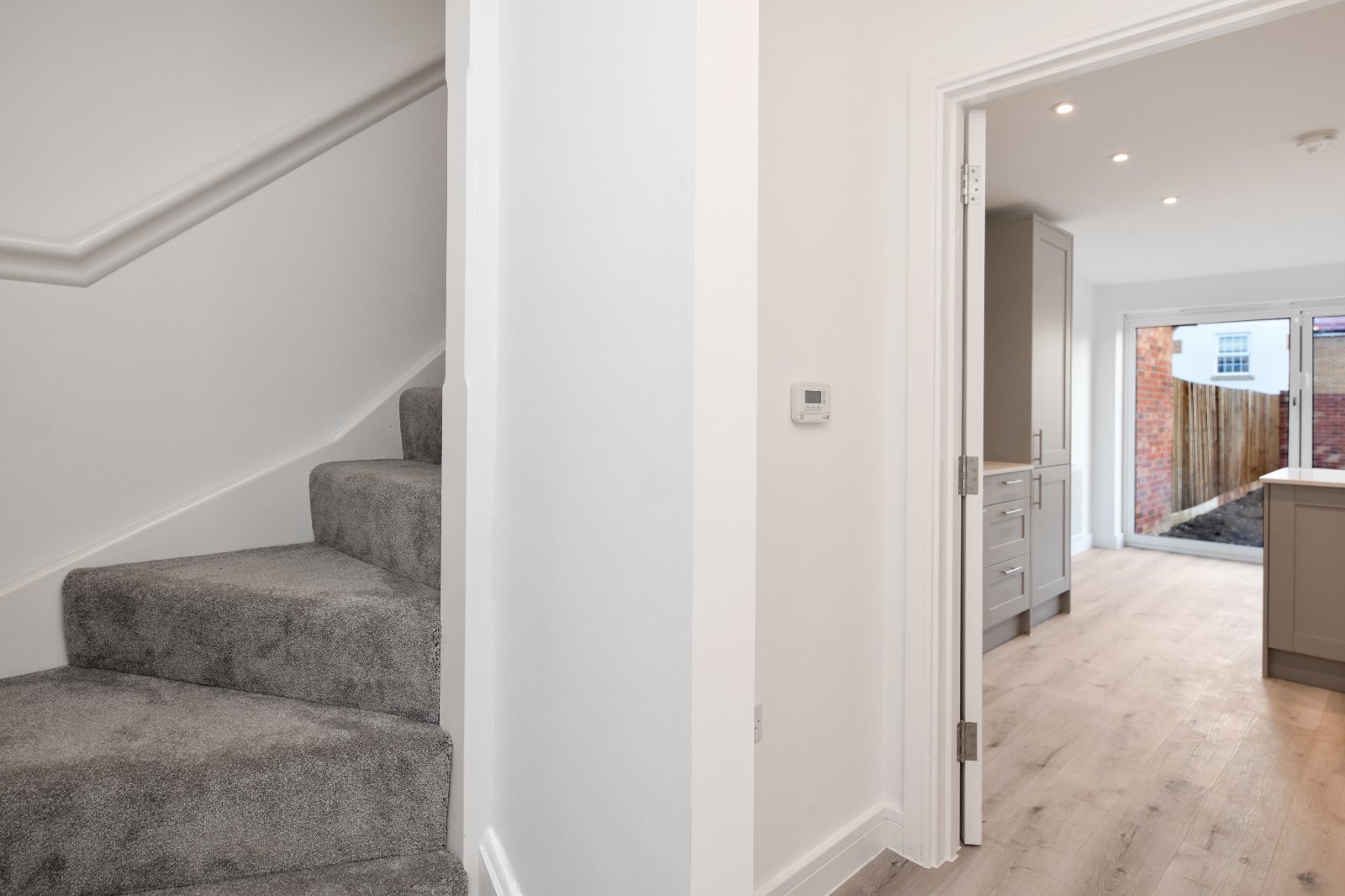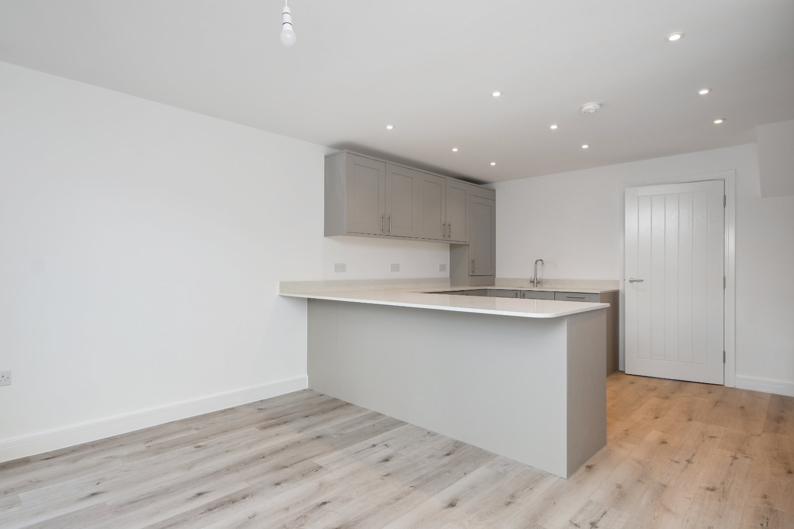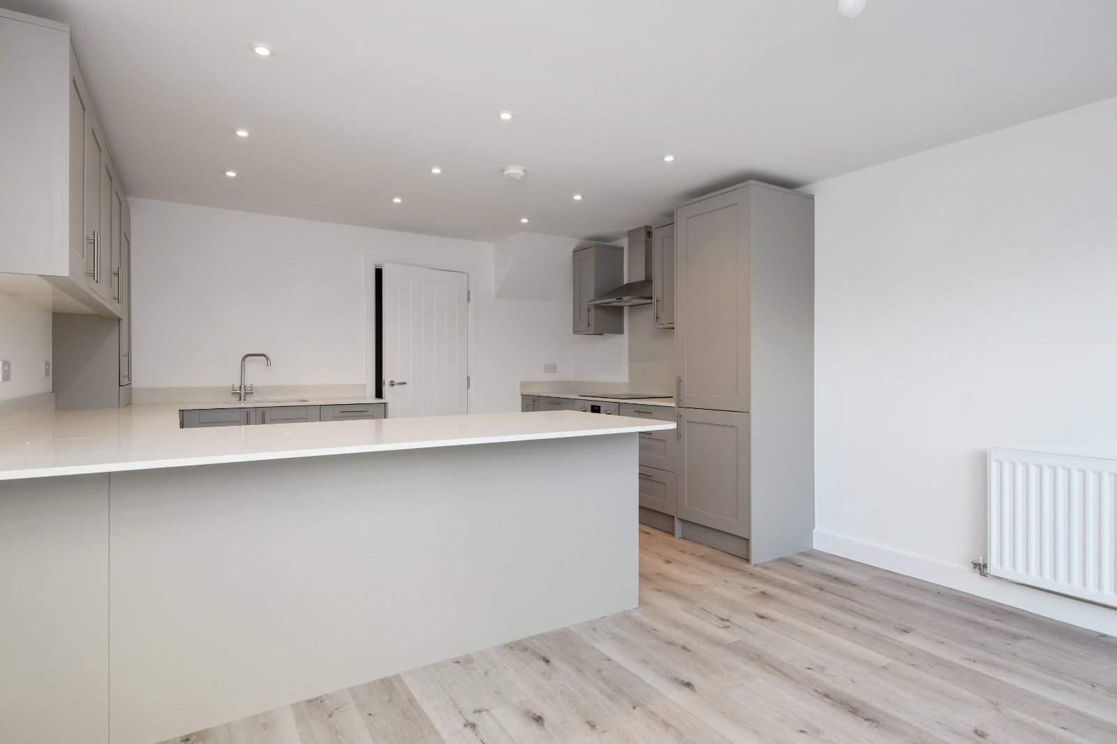 Additional features include elegant LVT wood-effect flooring, a radiator, and a smooth plastered ceiling with recessed LED lighting in the kitchen area—bringing the final polish to this modern, stylish room.
