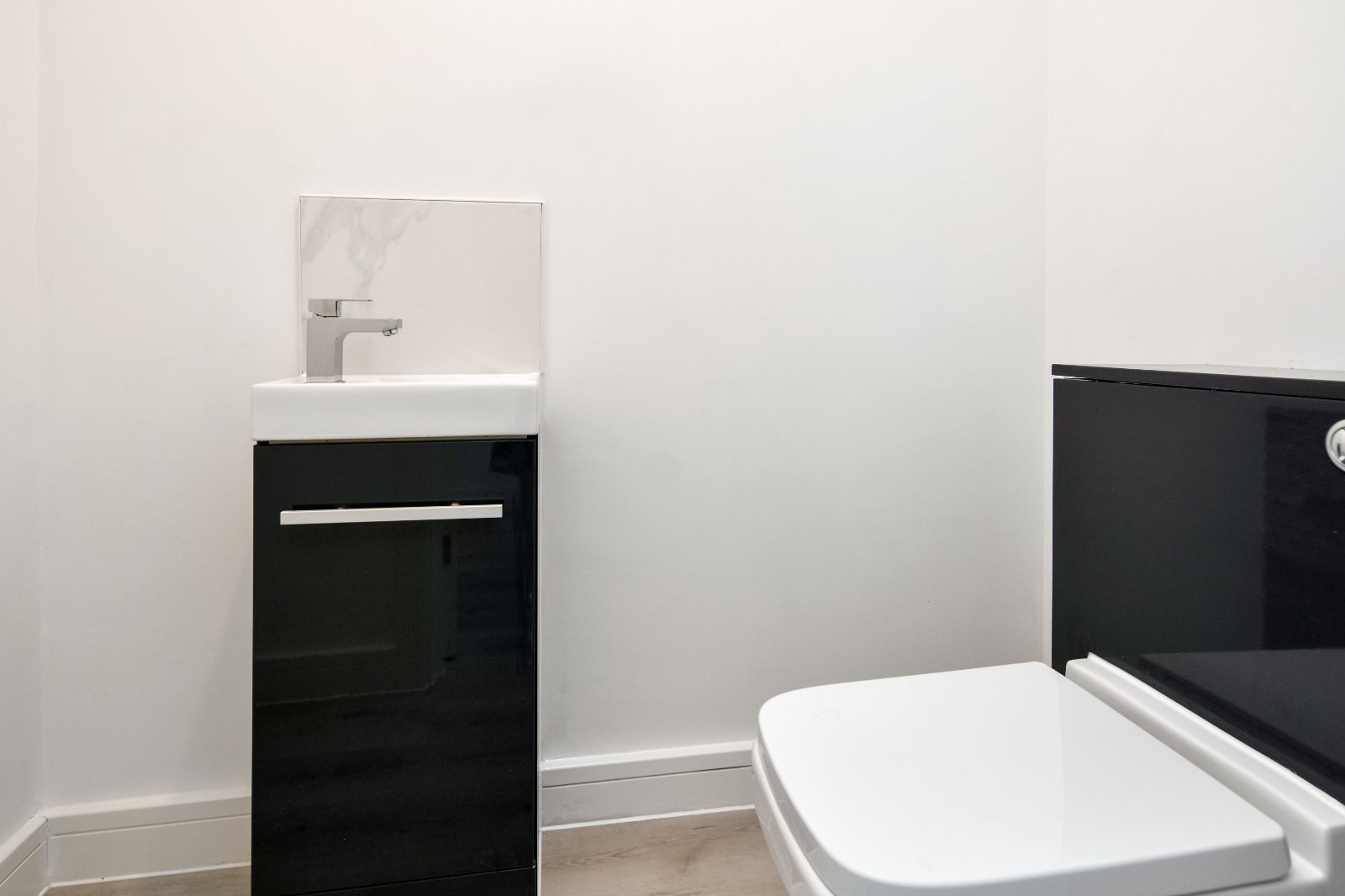 The suite features a contemporary vanity unit with inset basin, chrome fittings, and a tiled splashback, along with an under-sink storage cupboard housing a concealed-cistern dual-flush WC. Additional touches include a radiator, stylish LVT wood-effect flooring, and a smooth plastered ceiling with recessed lighting for a sleek, modern finish.
