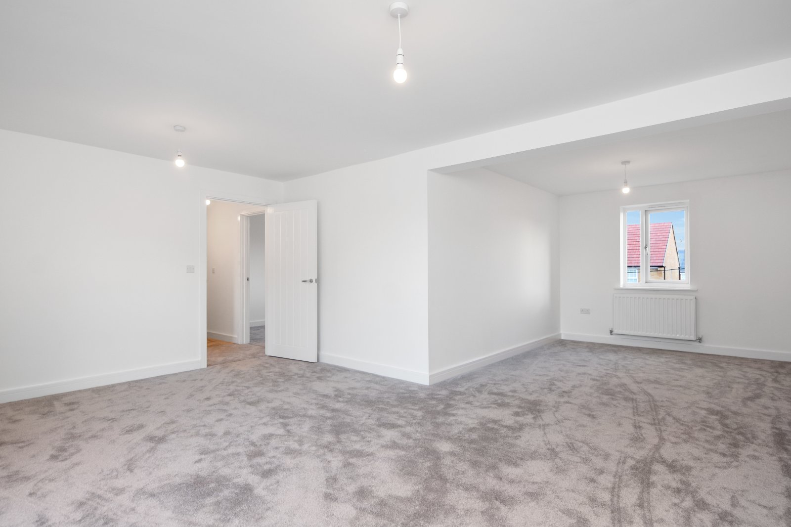 Accessed via a turned staircase with white-painted spindle balustrade and natural wood handrail, the landing is filled with natural light from a pair of front-facing windows. Finished with plush grey carpeting and a smooth plastered ceiling, it provides access—through matching vertical-panelled internal doors—to the Guest Bedroom Suite and the spacious Living Room/Diner. With additional access to the Airing Cupboard. A further turned staircase rises to the second floor landing.