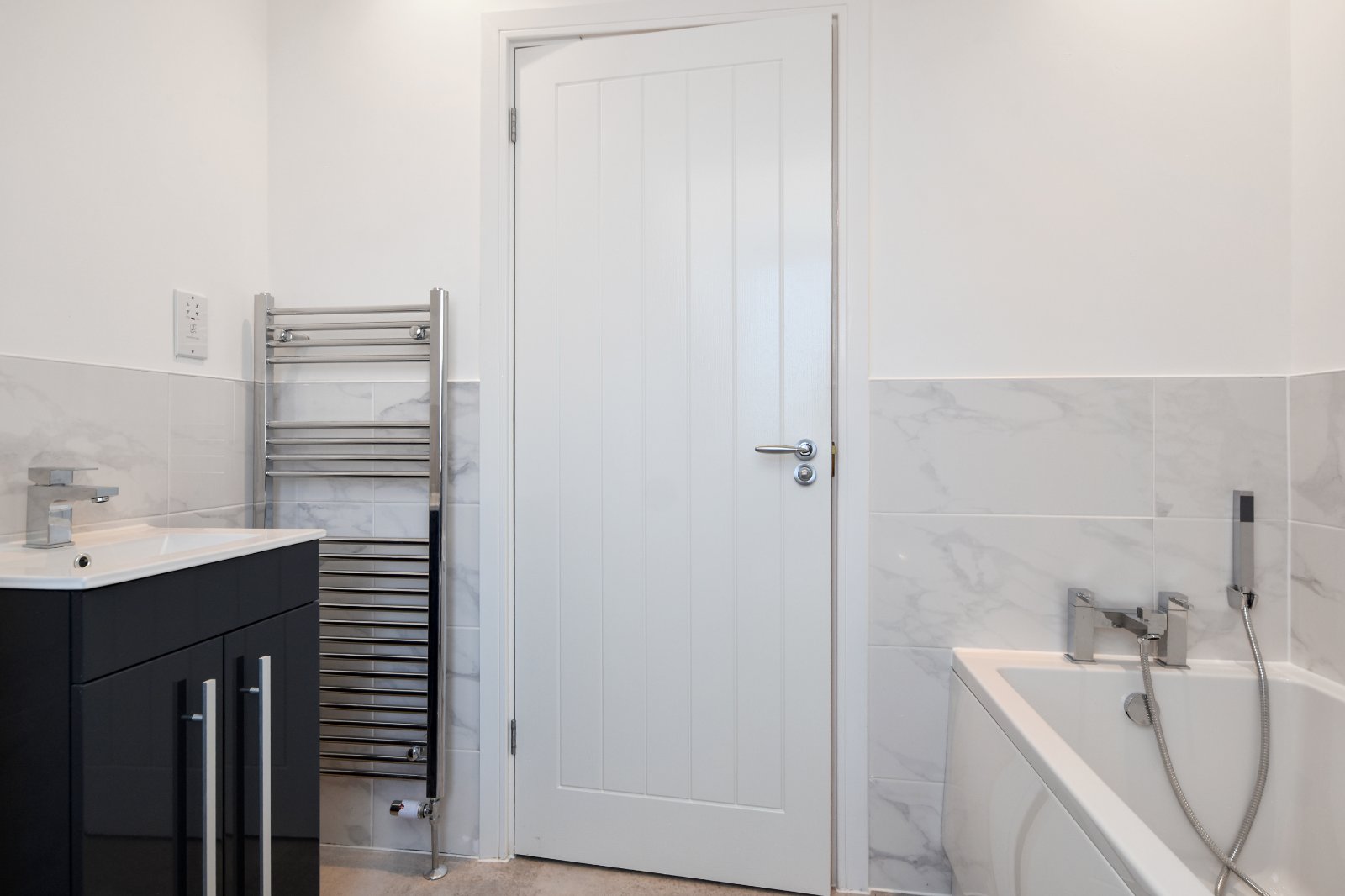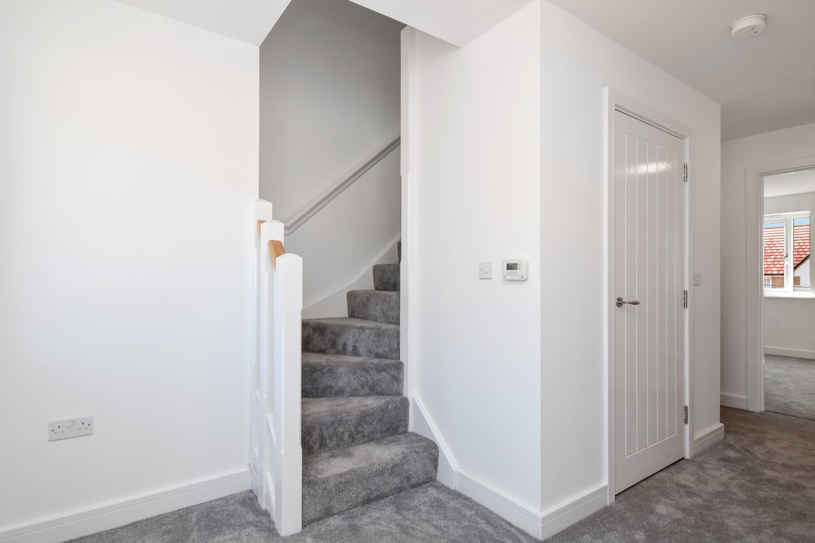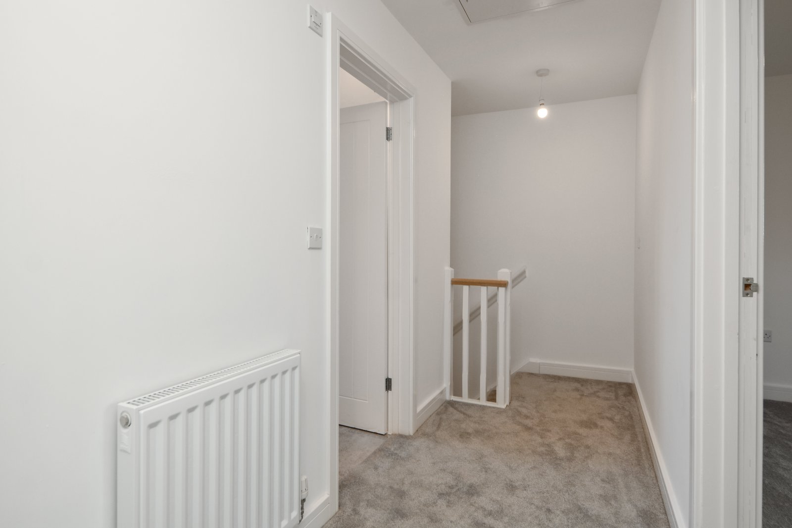 Finished with plush grey carpeting and a smooth plastered ceiling, the top floor landing is enhanced by a white-painted spindle balustrade with natural wood handrail. From here, matching vertical-panelled doors provide access to the three double Bedrooms and the Family Bathroom suite, along with an additional recessed storage cupboard.