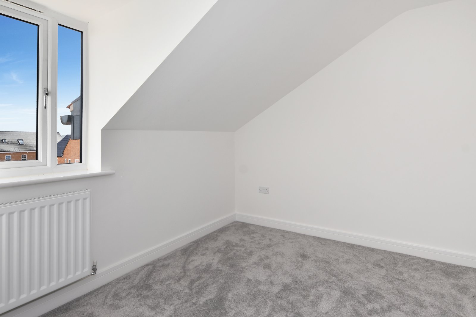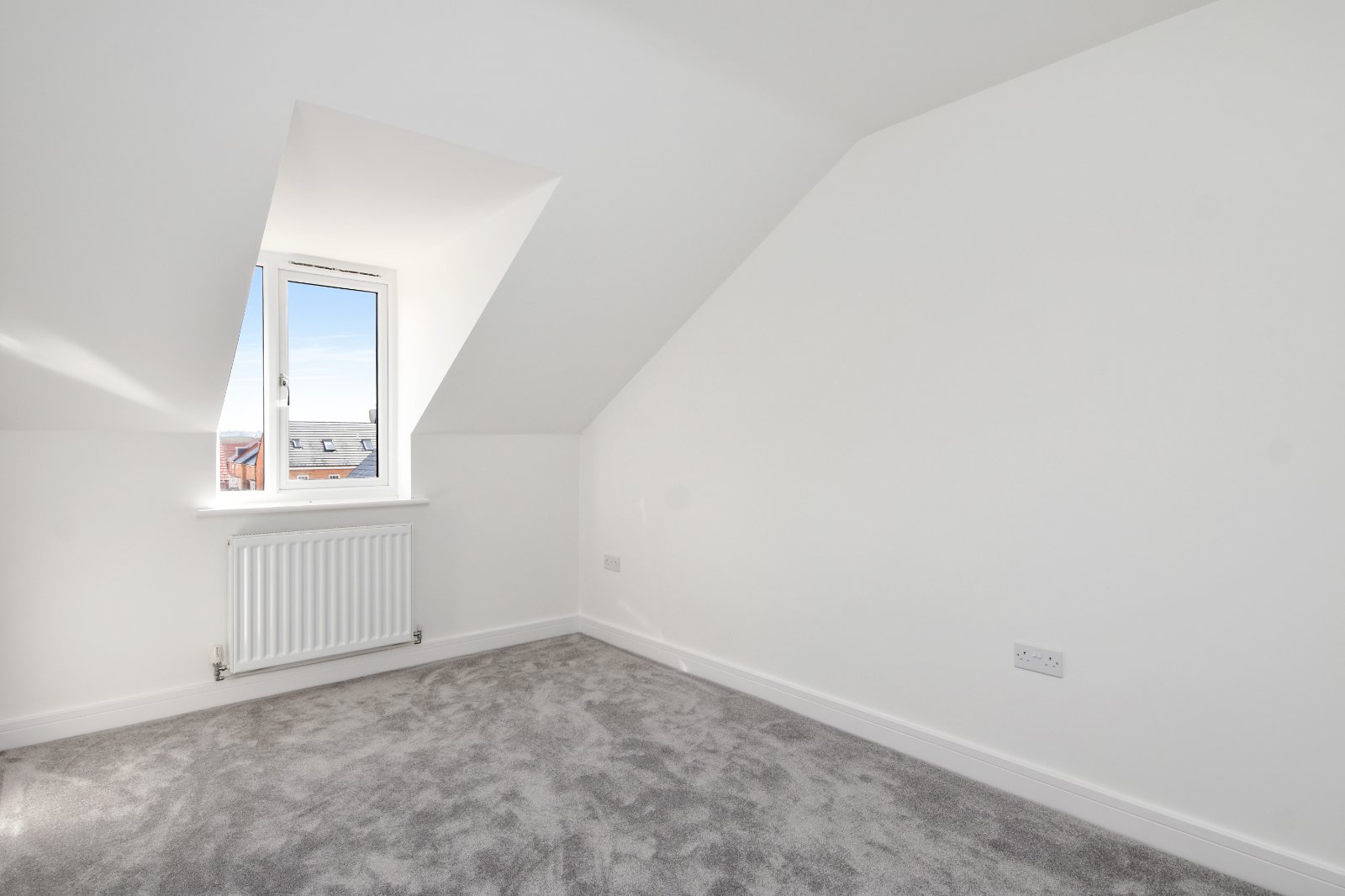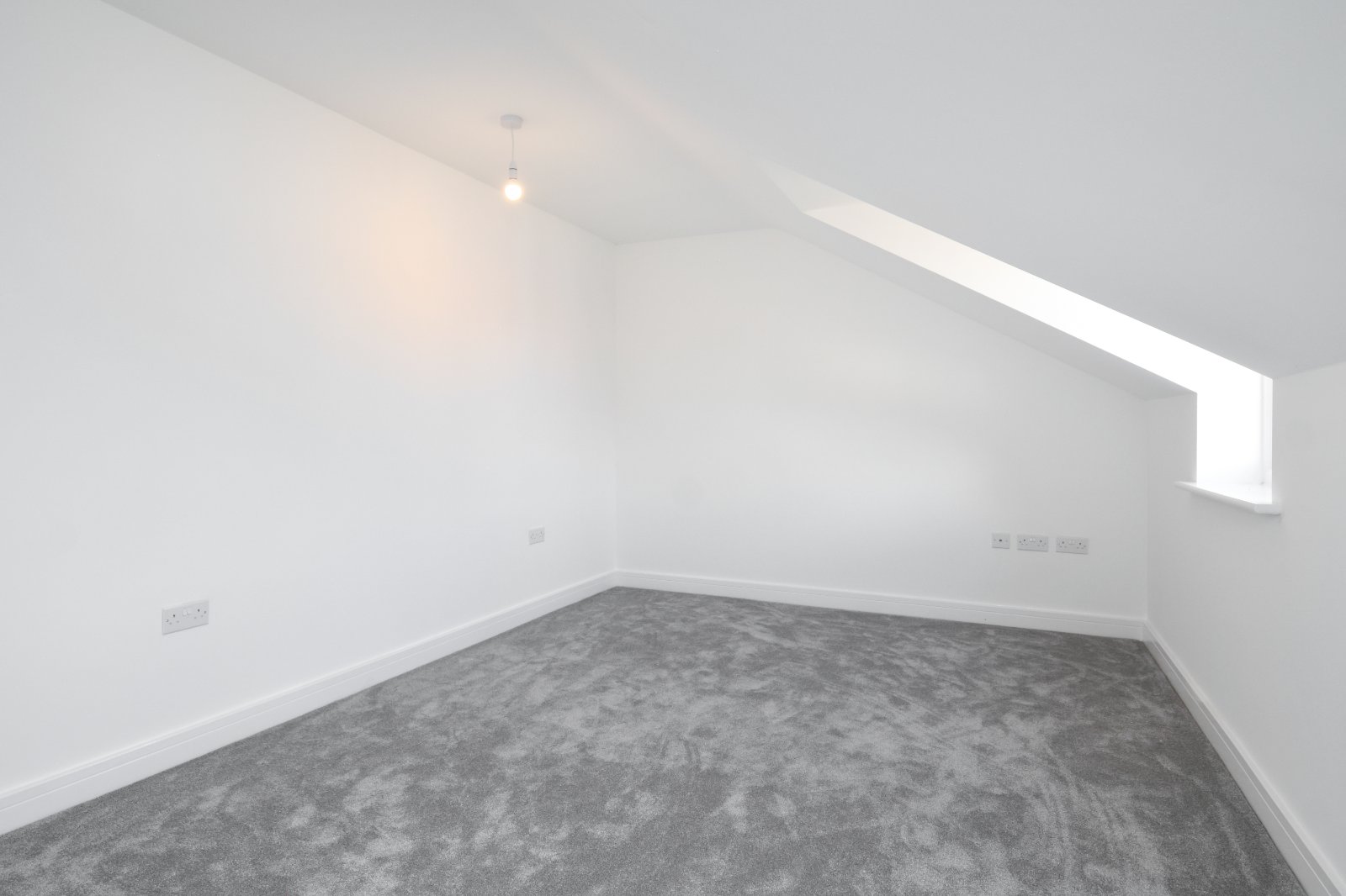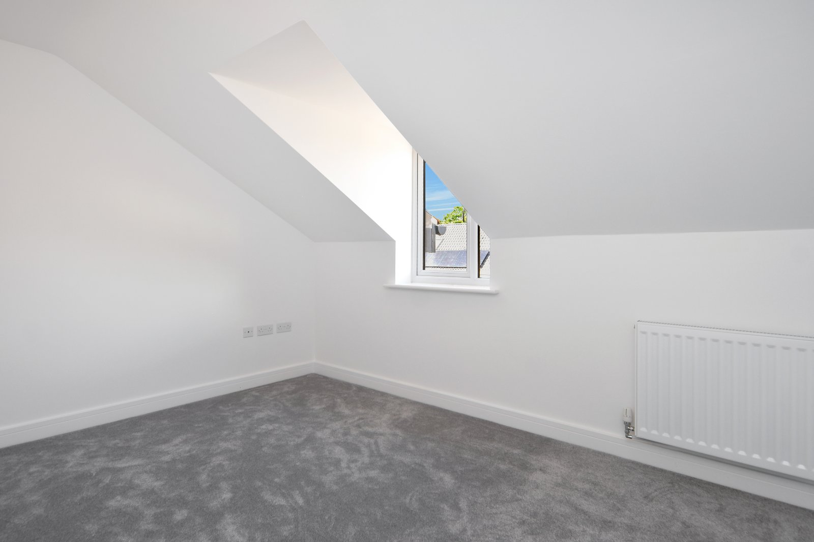 The room benefits from a south-facing feature dormer window, enhancing the space with architectural character and drawing in an abundance of natural light. Radiator, Smooth plastered ceiling complements the clean, modern lines of the home. The neutral colour palette, paired with plush grey carpeting and angled ceilings, creates a cosy atmosphere.
