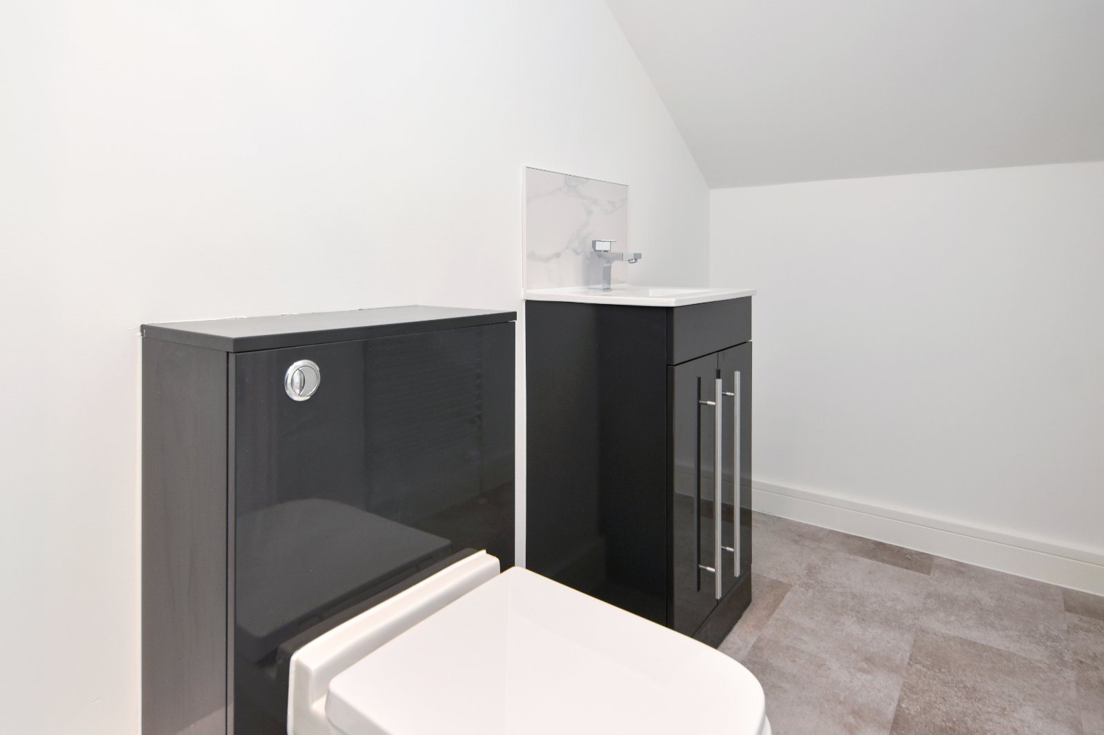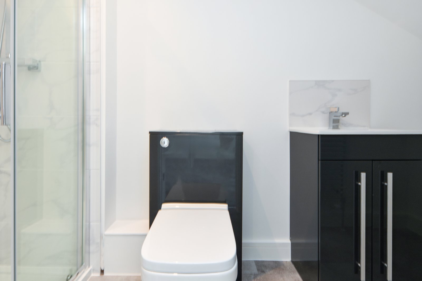 The en-suite has been thoughtfully designed with a contemporary walk-in shower with sliding glass doors is fitted with a chrome dual shower unit, featuring both a handheld attachment and an overhead drencher shower, set against elegant marble-effect gloss tiled walls. The space is completed by a gloss finish concealed cistern WC and a matching vanity unit with an inset basin. Chrome heated towel rail adds comfort, ceiling-mounted extractor fan. The smooth plastered sloped ceiling enhances the space with subtle architectural charm.