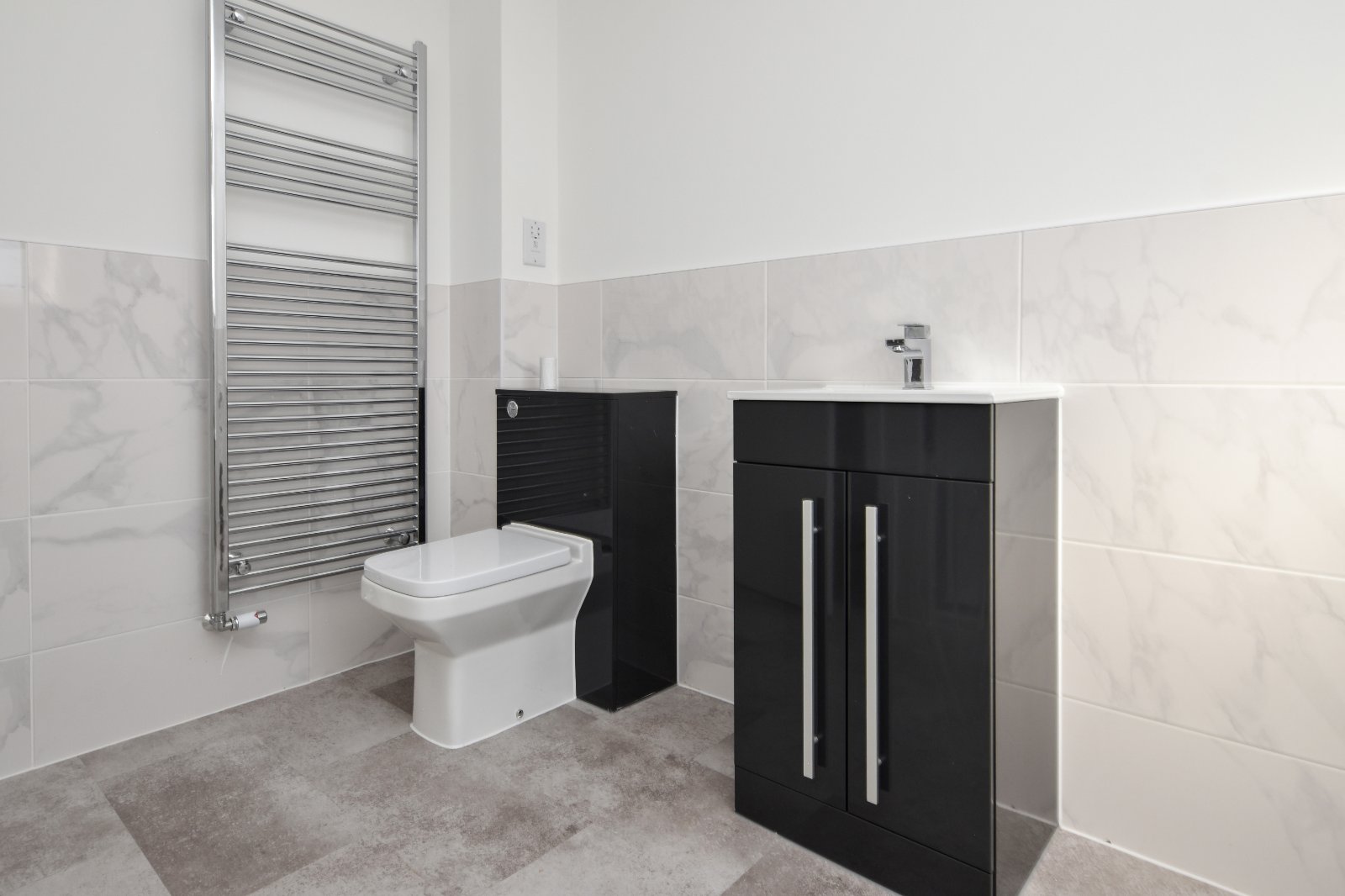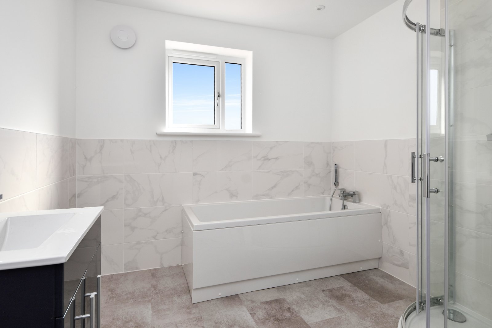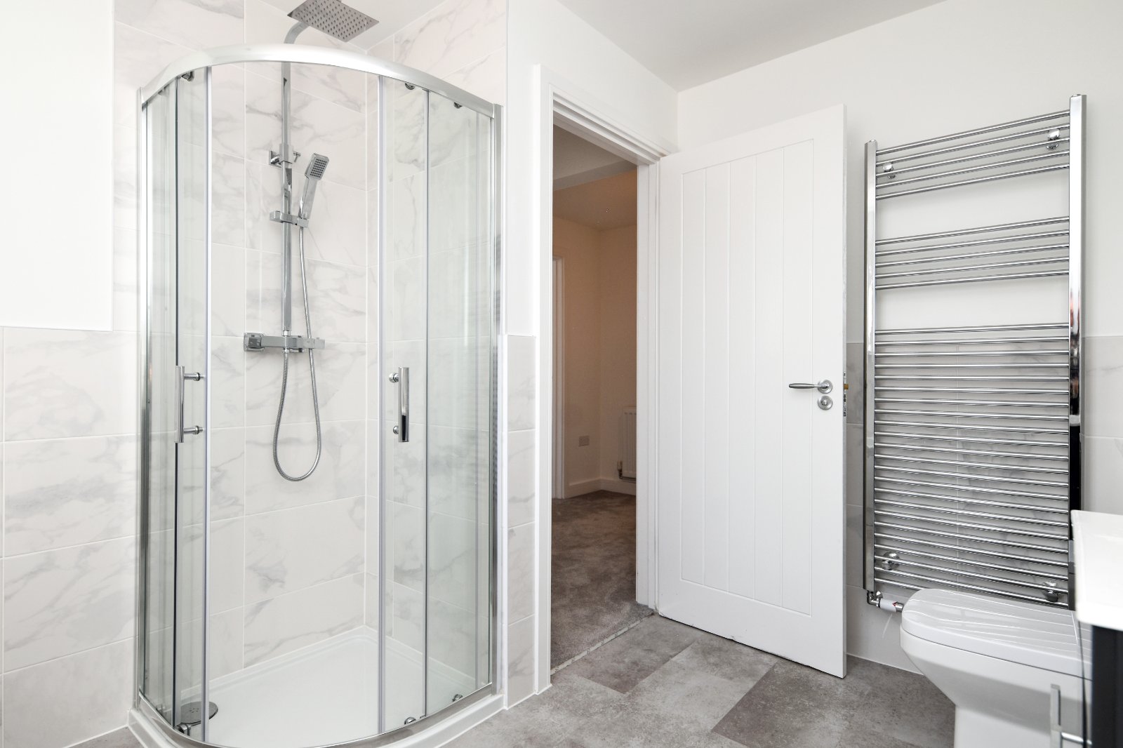 This family bathroom combines clean lines with contemporary comfort. Marble-effect wall tiling to half-height adds a touch of luxury. The suite comprises a white panelled enclosed bath with a chrome mixer tap and handheld shower, independent tiled shower enclosure inset with integrated shower unit with hand held attachment and drencher style shower over, modern vanity unit with inset basin and chrome fittings with storage cupboard under and a dual flush WC. Other features include smooth plastered ceiling inset with recessed ceiling lighting and extractor fan and a ladder style heated towel rail.