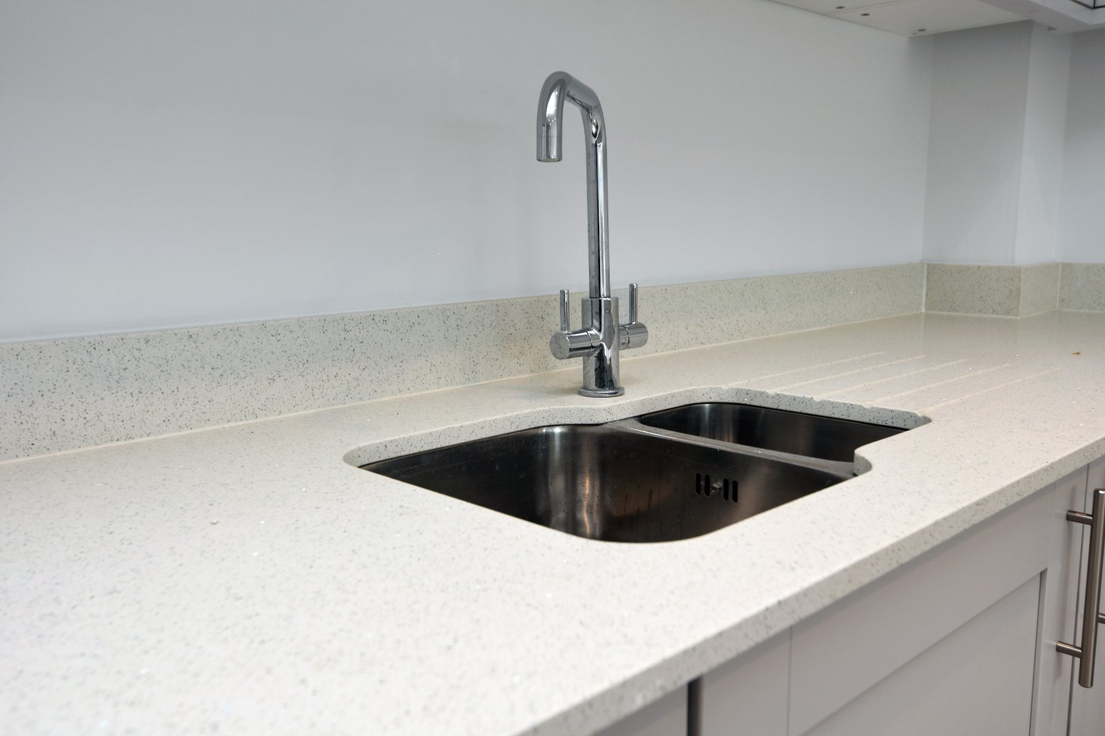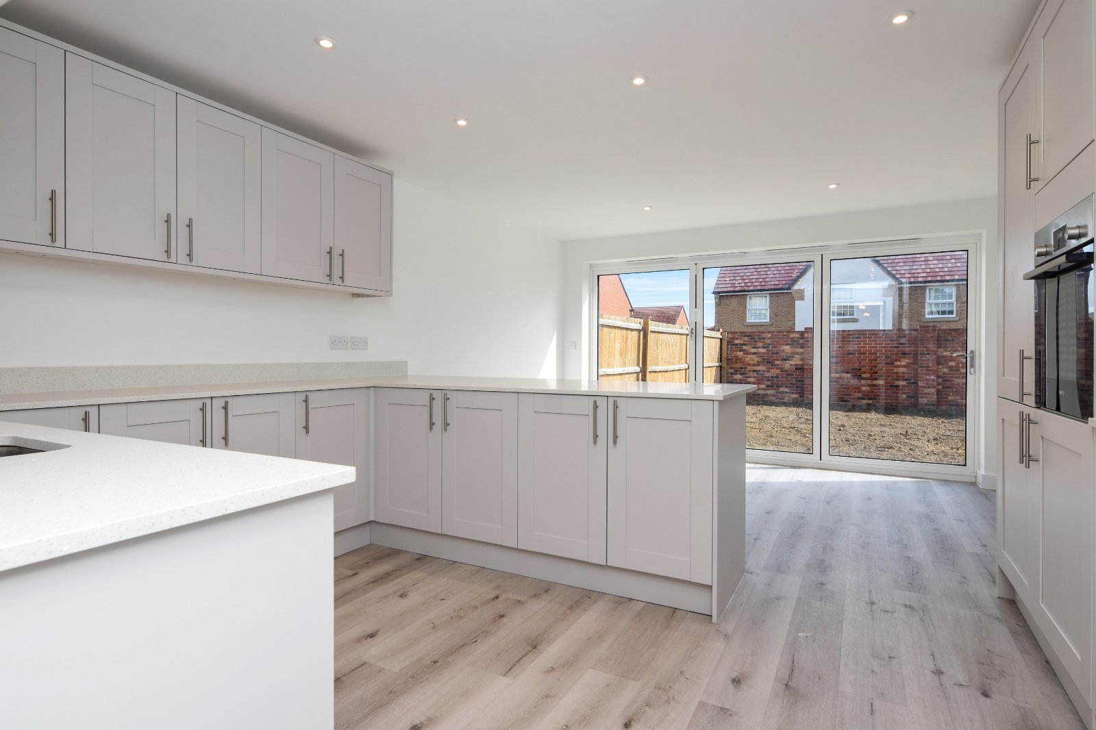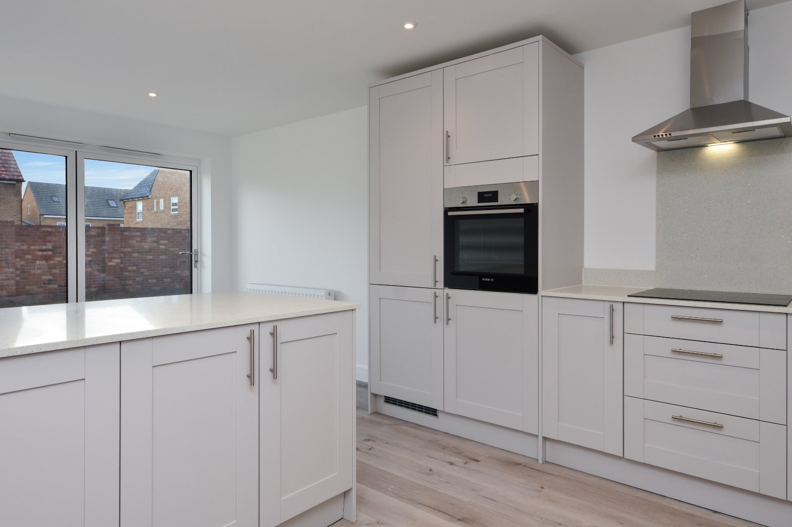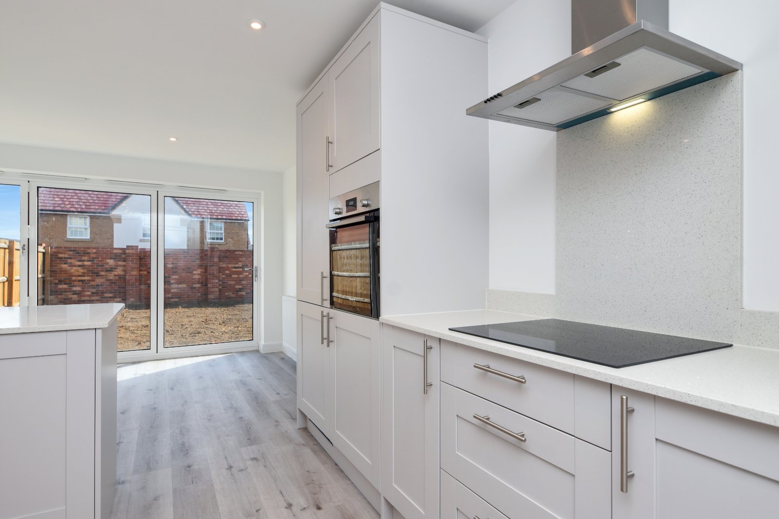 This thoughtfully designed kitchen and dining space combines style, functionality, and a bright, open-plan layout—perfect for both daily life and entertaining guests. Finished to an exceptional standard, the kitchen showcases timeless Oxford Shaker cabinetry in Pebble Grey, beautifully complemented by luxurious Seattle Steel Sparkle Effect Quartz worktops with matching upstands. A one-and-a-quarter stainless steel sink is seamlessly inset into the worktop, paired with a modern chrome mixer tap, while a stainless steel splashback behind the hob adds a clean, contemporary touch. Discreetly housed on the wall is the E-TEC NXS boiler.