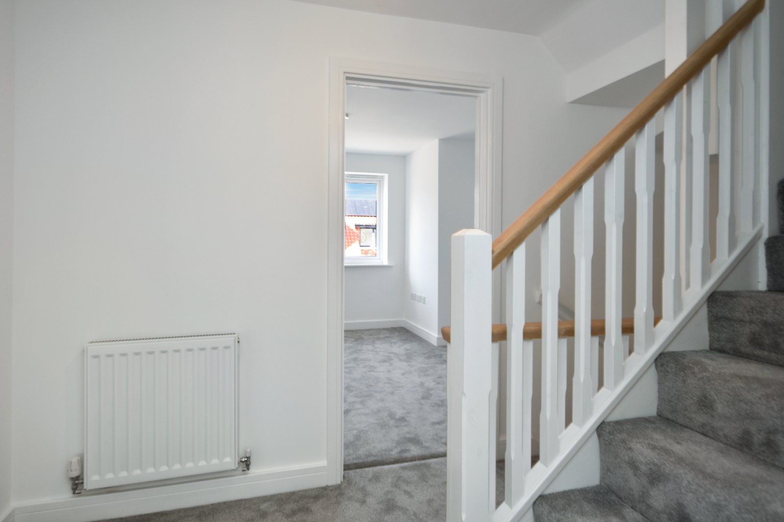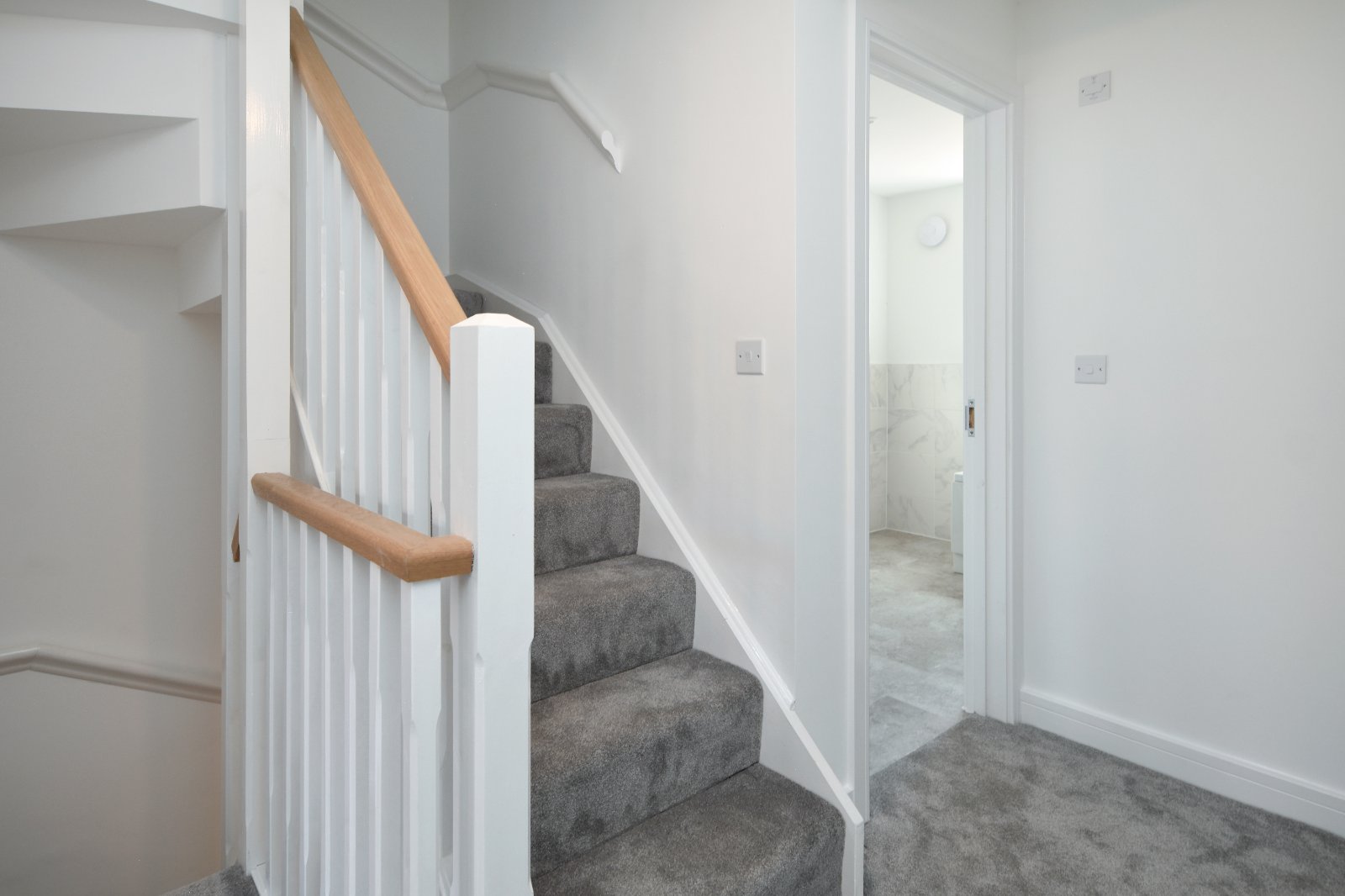 Accessed via a turned staircase with a white-painted spindle balustrade and natural wood handrail, the landing features a returned staircase leading to the first floor level of the home. Finished with plush grey carpeting and a smooth plastered ceiling, it provides access—through matching vertical-panelled internal doors—to the Living Room/Diner, Bedroom, and Fourpiece Family Bathroom. A radiator and an additional matching door opens to the airing cupboard.