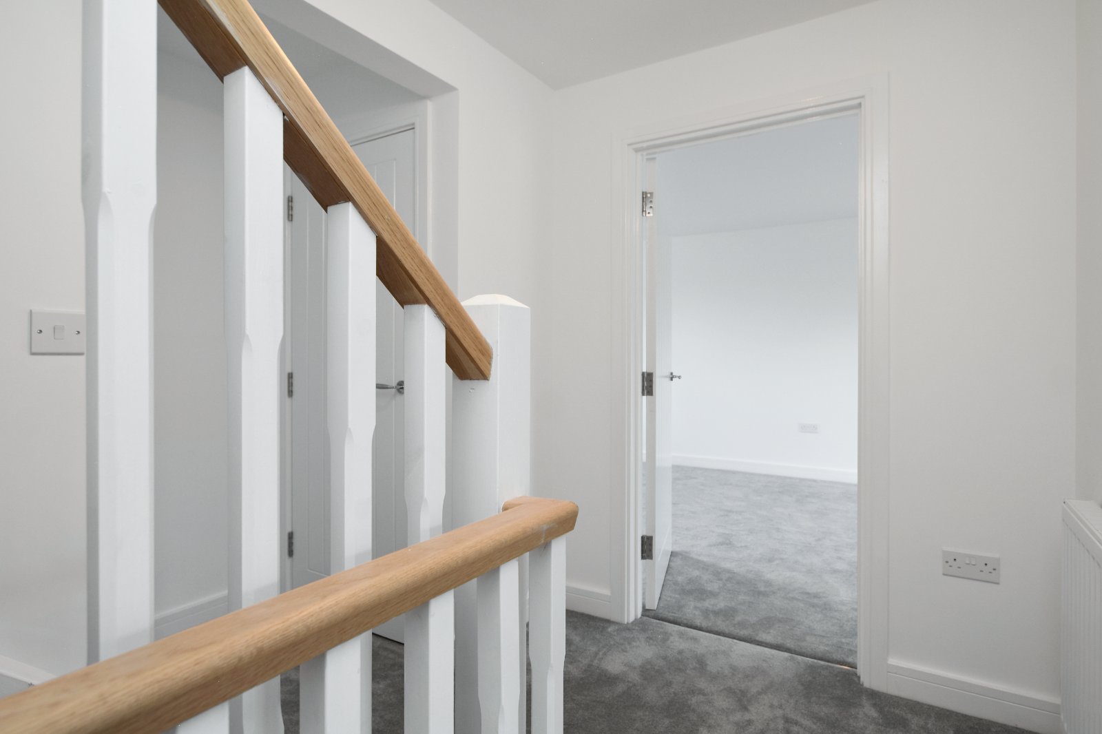 Finished with plush grey carpeting, a smooth plastered ceiling inset with access to eaves/loft space. White-painted spindle balustrade with natural wood handrail providing access via a vertical panelled doors to the top three bedrooms.