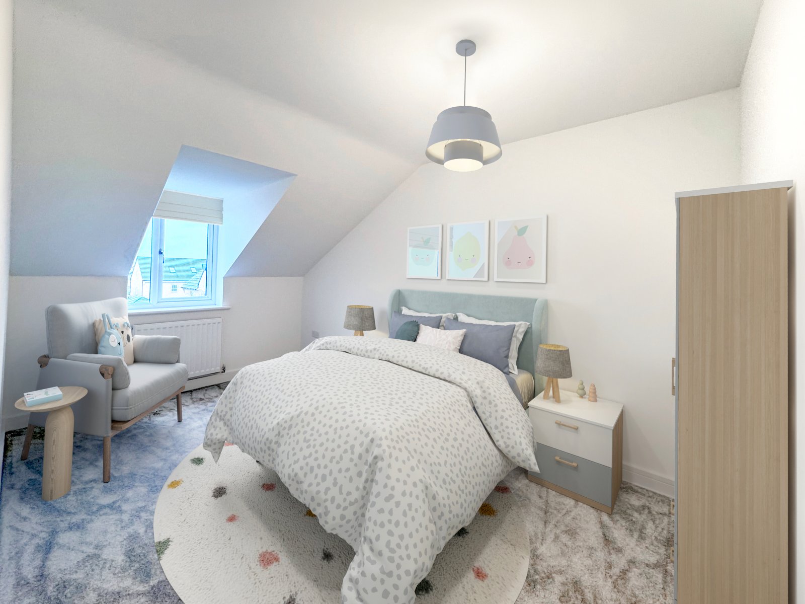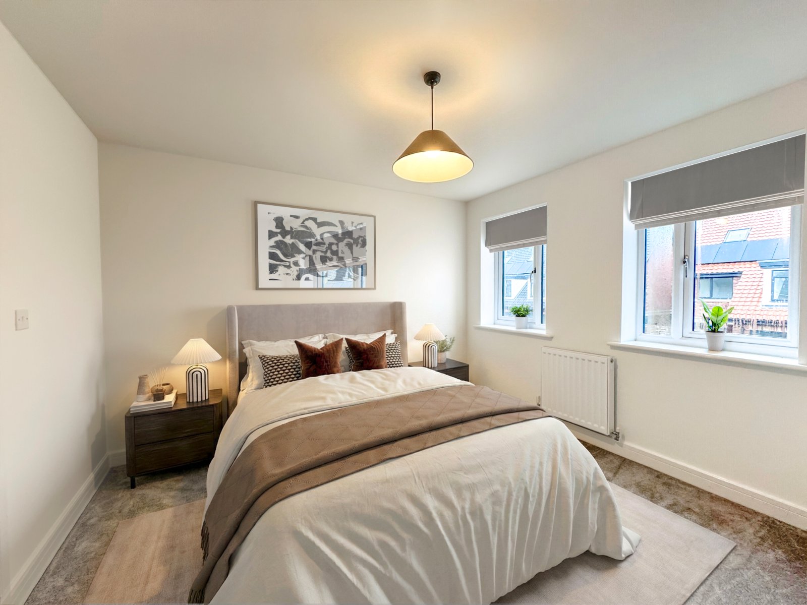 uPVC double-glazed dormer-style window to the front aspect. Finished in a fresh neutral palette with plush grey carpeting and radiator. The room offers ample space for a full range of bedroom furniture, with a layout that allows flexibility for wardrobes and additional storage.