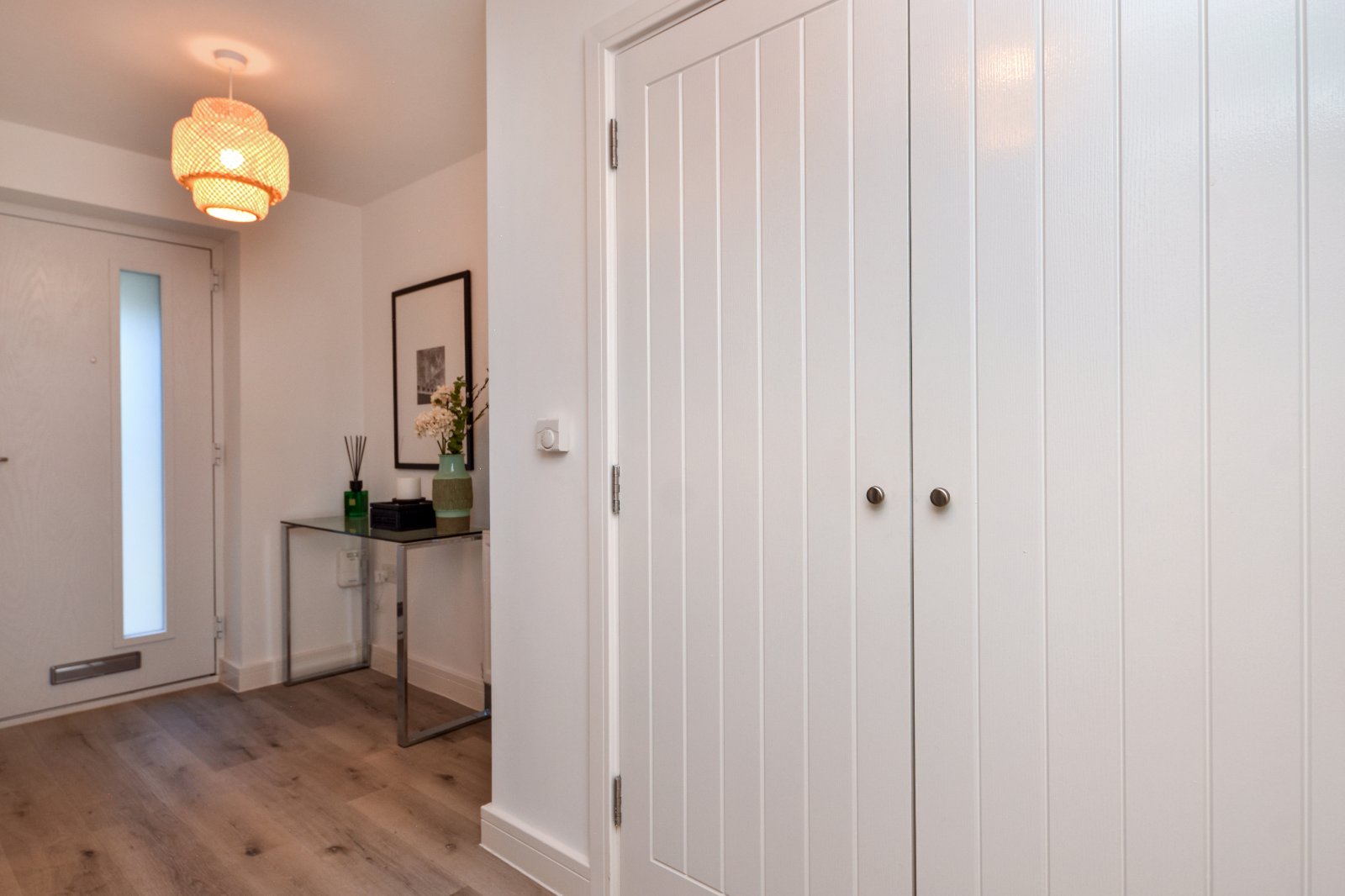 Step into a bright and contemporary entrance hall, finished with stylish LVT wood effect flooring. Pair of modern vertical panelled internal doors providing access to a good size storage cupboard inset with wall mounted fuse box and lighting. Turned staircase rising to the first floor landing with soft, plush pile carpet in a light grey tone. Modern vertical panelled internal doors provide access to the Kitchen/Family Room, Home Office space and Ground floor Guest WC. Radiator. Smooth plastered ceiling.