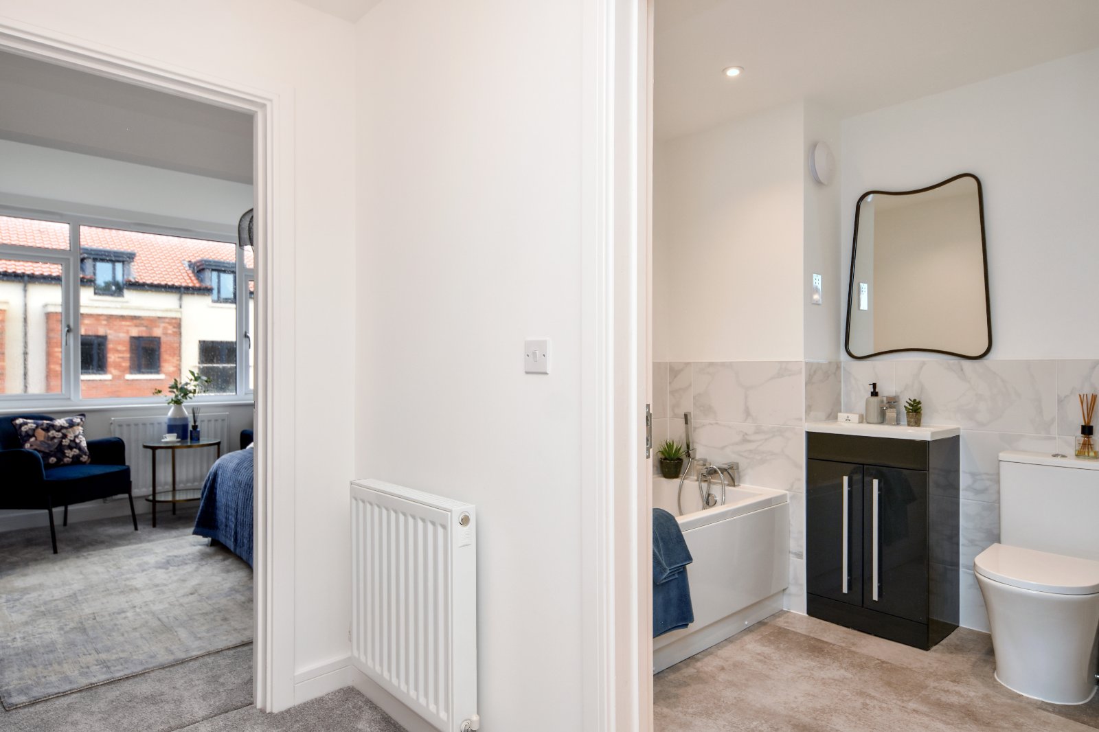 The suite comprises modern vanity unit with an inset basin and chrome fittings with tiled splashback and under-sink storage cupboard with concealed cistern dual flush WC. Radiator. LVT wood-effect flooring. Smooth plastered ceiling inset with recessed lighting.