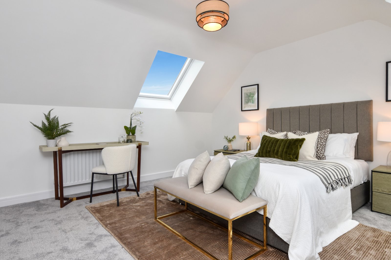 Part-vaulted smooth plastered ceiling inset with uPVC double glazed dormer-style window to the rear aspect. design, adding architectural interest and character. Finished in a fresh neutral palette with plush grey carpeting. Radiator. The room is available for a full range of bedroom furniture, and the layout allows flexibility for wardrobes or dressing area.