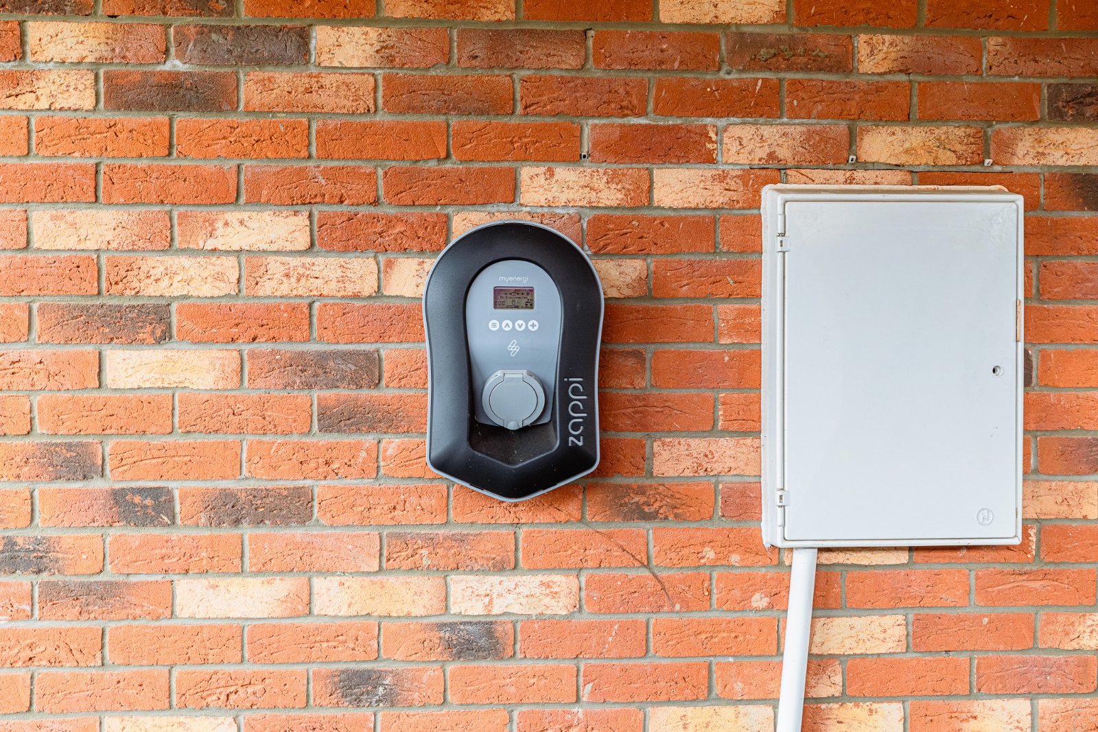 The area features a MyEnergi Zappi electric vehicle charging point, offering a convenient and eco-conscious solution for EV owners. A cold water tap is also fitted externally—ideal for gardening, car washing, or general outdoor use.