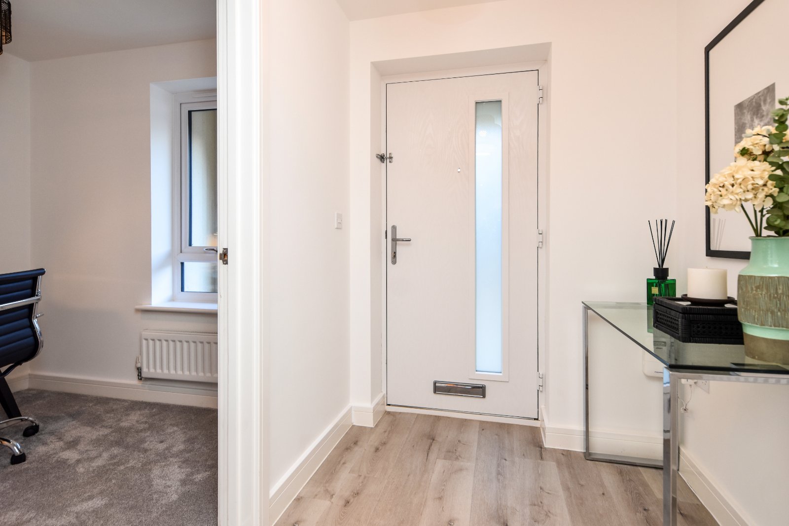 A spacious feature recessed access porch, offering sheltered entry framed by clean, modern rendered walls. Stylish composite door inset with a vertical obscure double glazed insert. The porch areas are finished with a contrasting step and path creating a neat, welcoming approach to the home.
