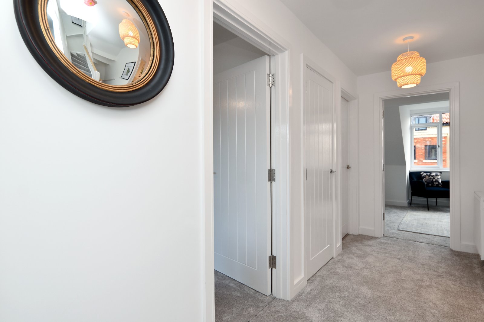 Accessed via a turned staircase with a white-painted spindle balustrade and natural wood handrail, the bright landing, with a returned staircase rising to the upper level of the home. Finished with plush grey carpeting and a smooth plastered ceiling, the space offers access—via matching vertical panelled internal doors—to the Living Room, three of the Bedrooms and the Family Bathroom. Radiator. A further matching door opens to an airing cupboard.