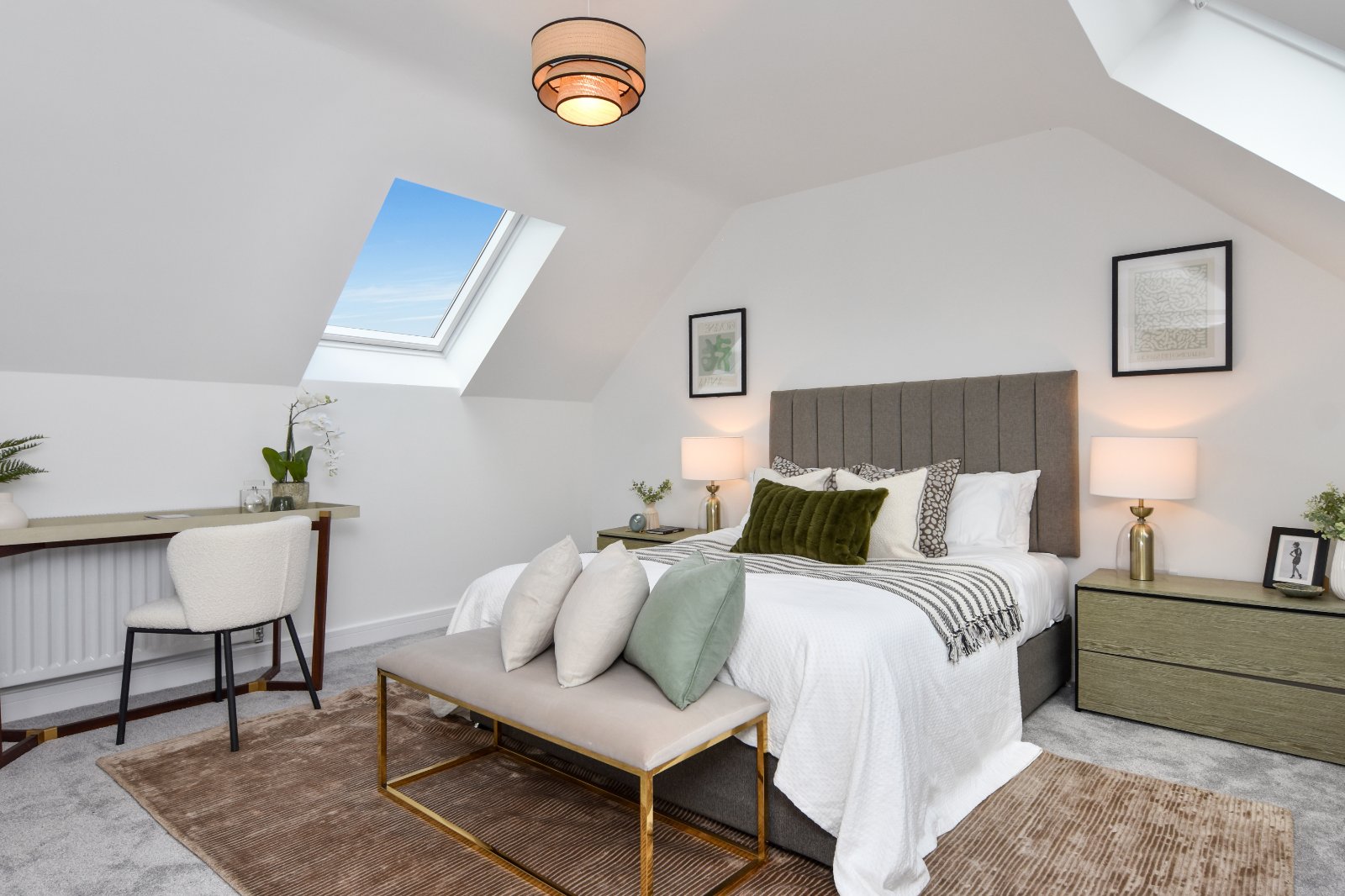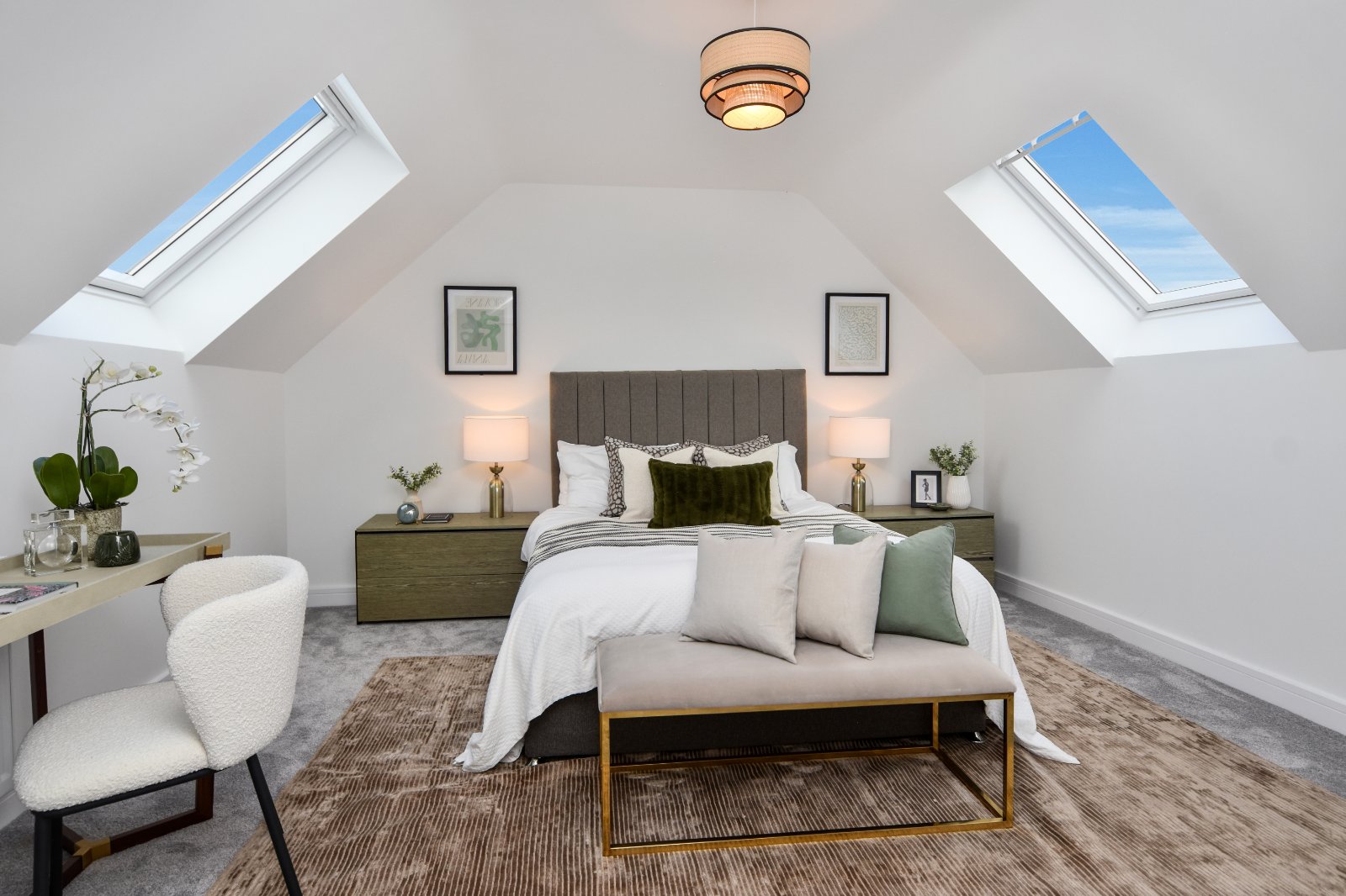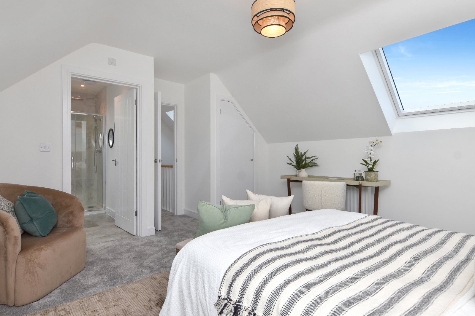 Part-vaulted smooth plastered ceiling inset with uPVC double glazed dormer-style window to the rear aspect. design, adding architectural interest and character. Finished in a fresh neutral palette with plush grey carpeting. Radiator. The room is available for a full range of bedroom furniture, and the layout allows flexibility for wardrobes or dressing area.
