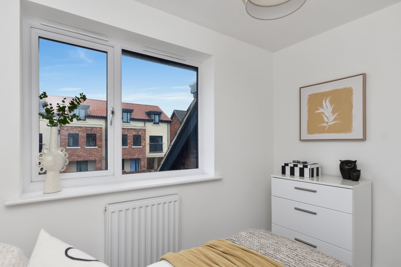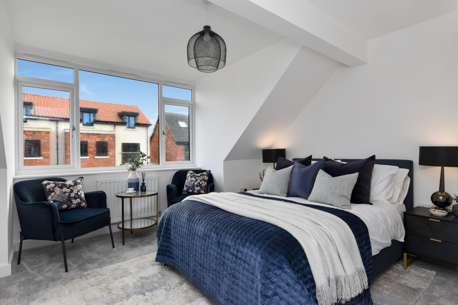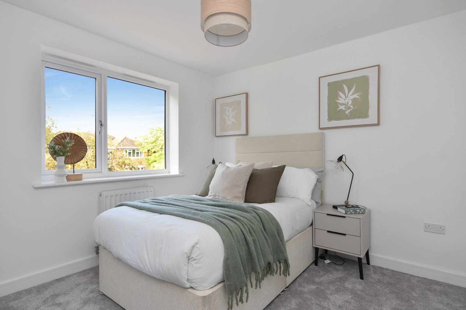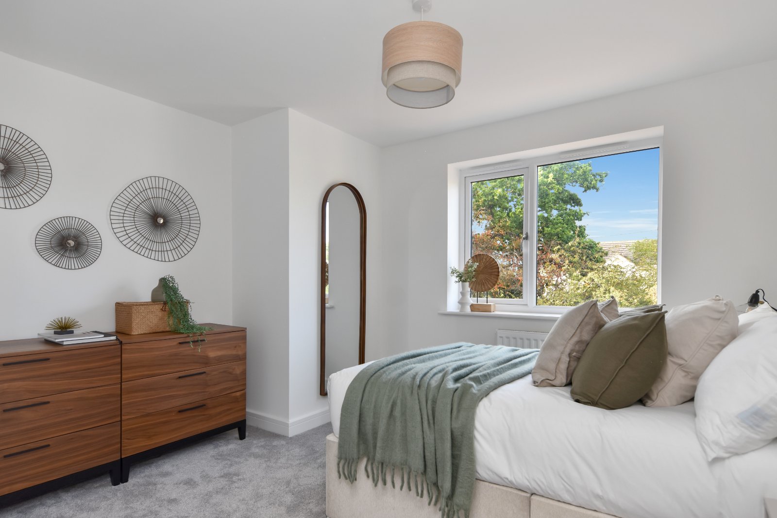 Part-vaulted smooth plastered ceiling inset with uPVC double glazed dormer-style window to the rear aspect. design, adding architectural interest and character. Finished in a fresh neutral palette with plush grey carpeting. Radiator. The room is available for a full range of bedroom furniture, and the layout allows flexibility for wardrobes or dressing area.
